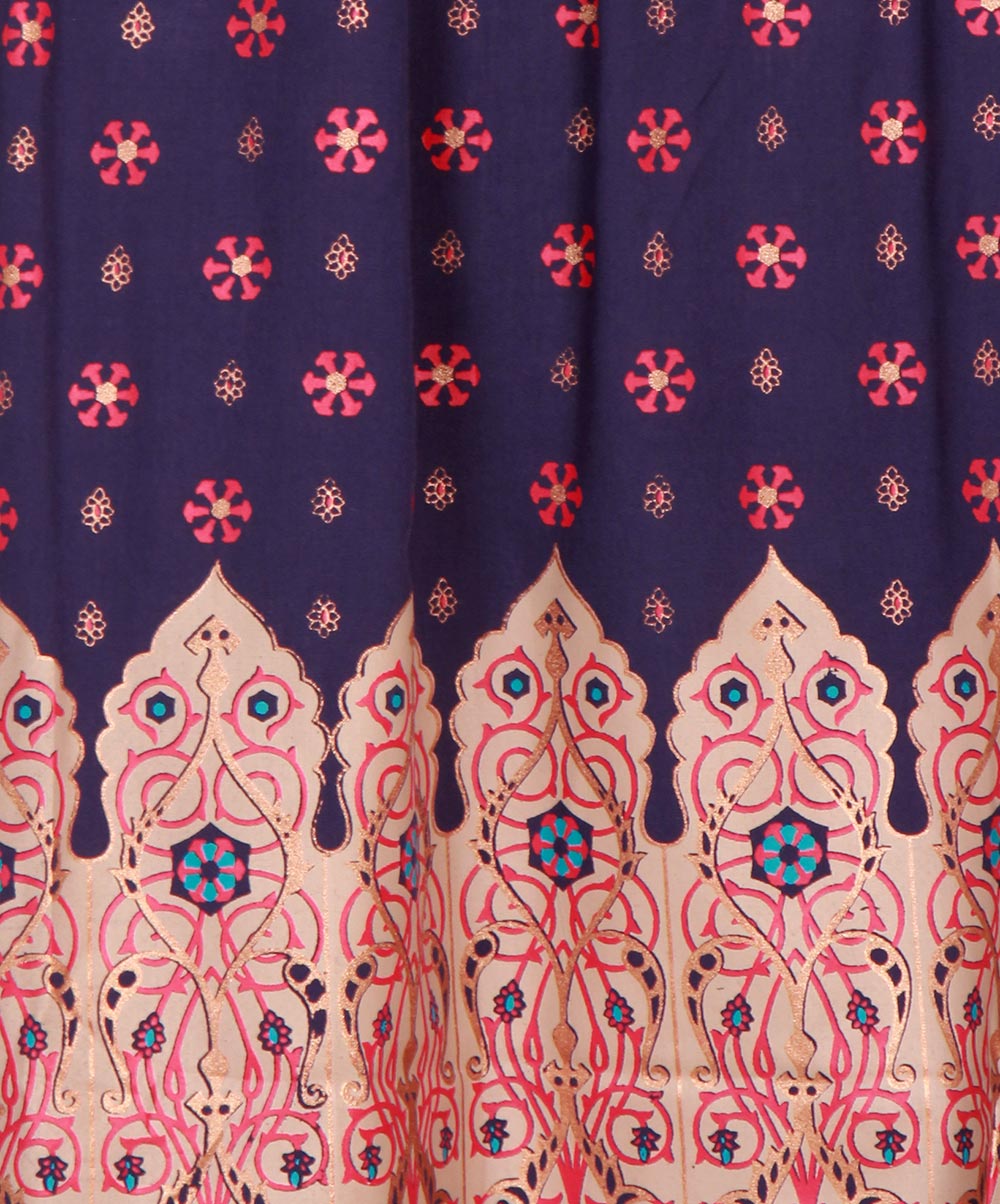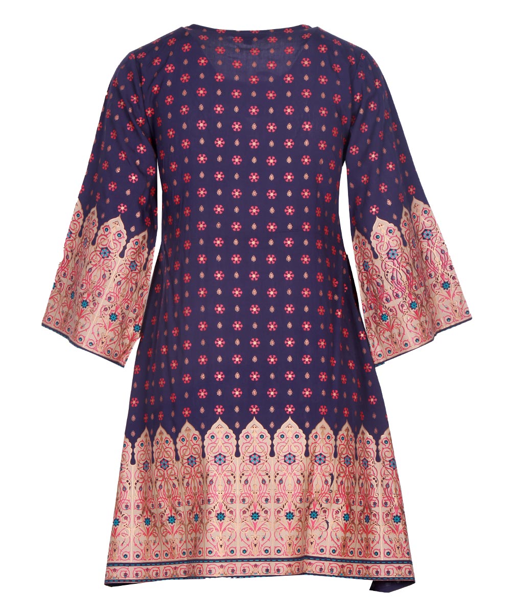 Blue viscose tunic with gathers from waistline. Comes with contrast afsaan print on A-line sleeves and hemline.