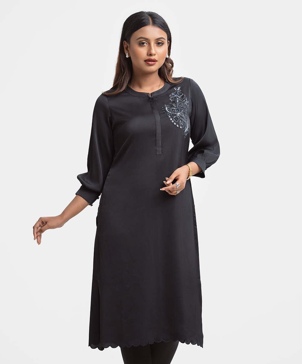 Women’s tunic in joom fabric. Stand collar, three-quarter cuff sleeves. Karchupi at front & cutwork hem.