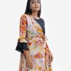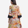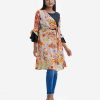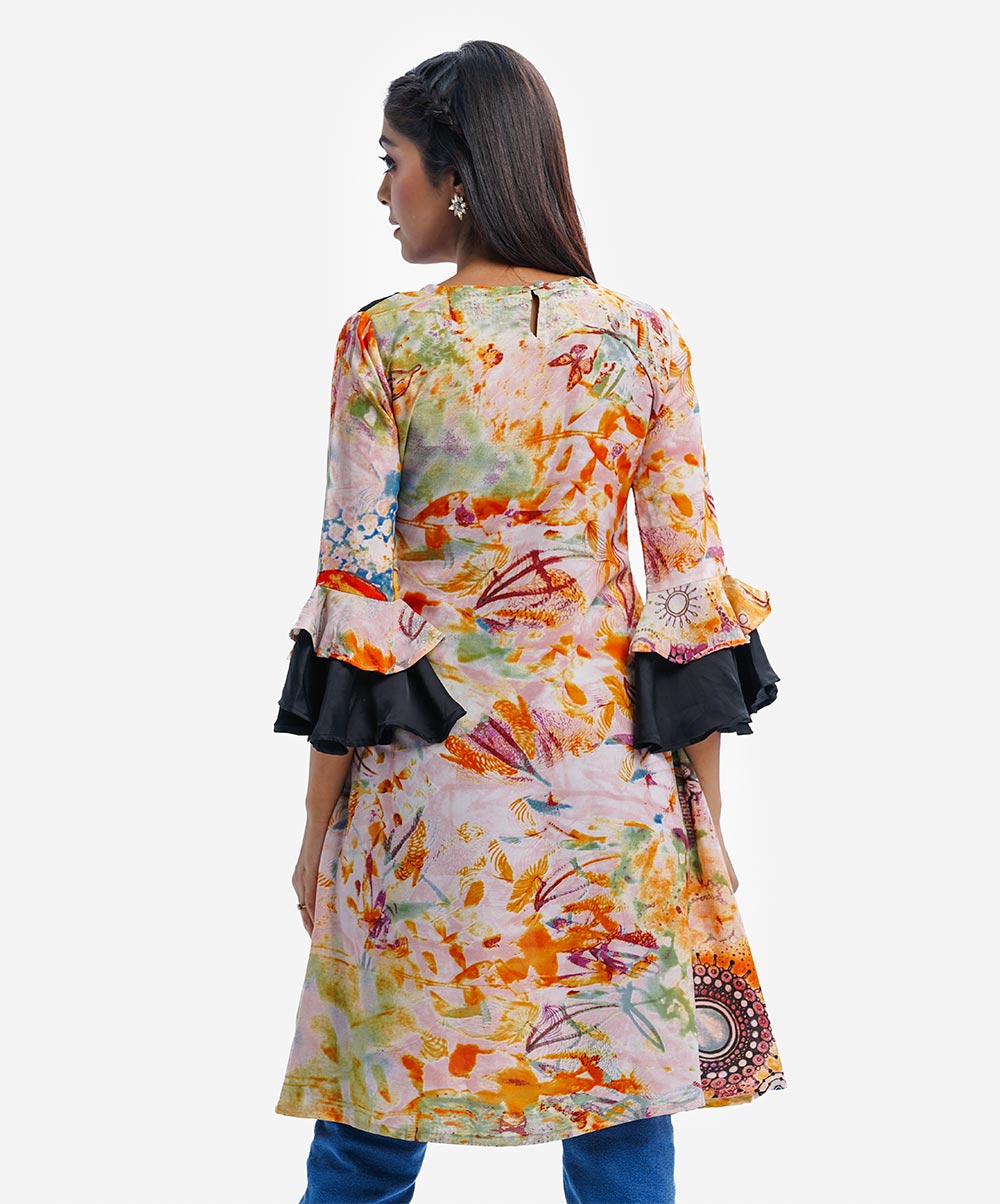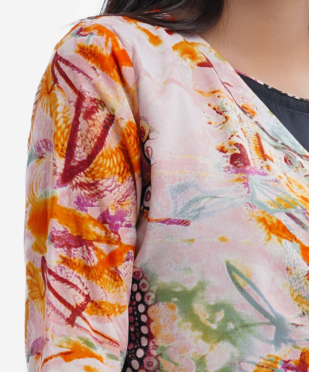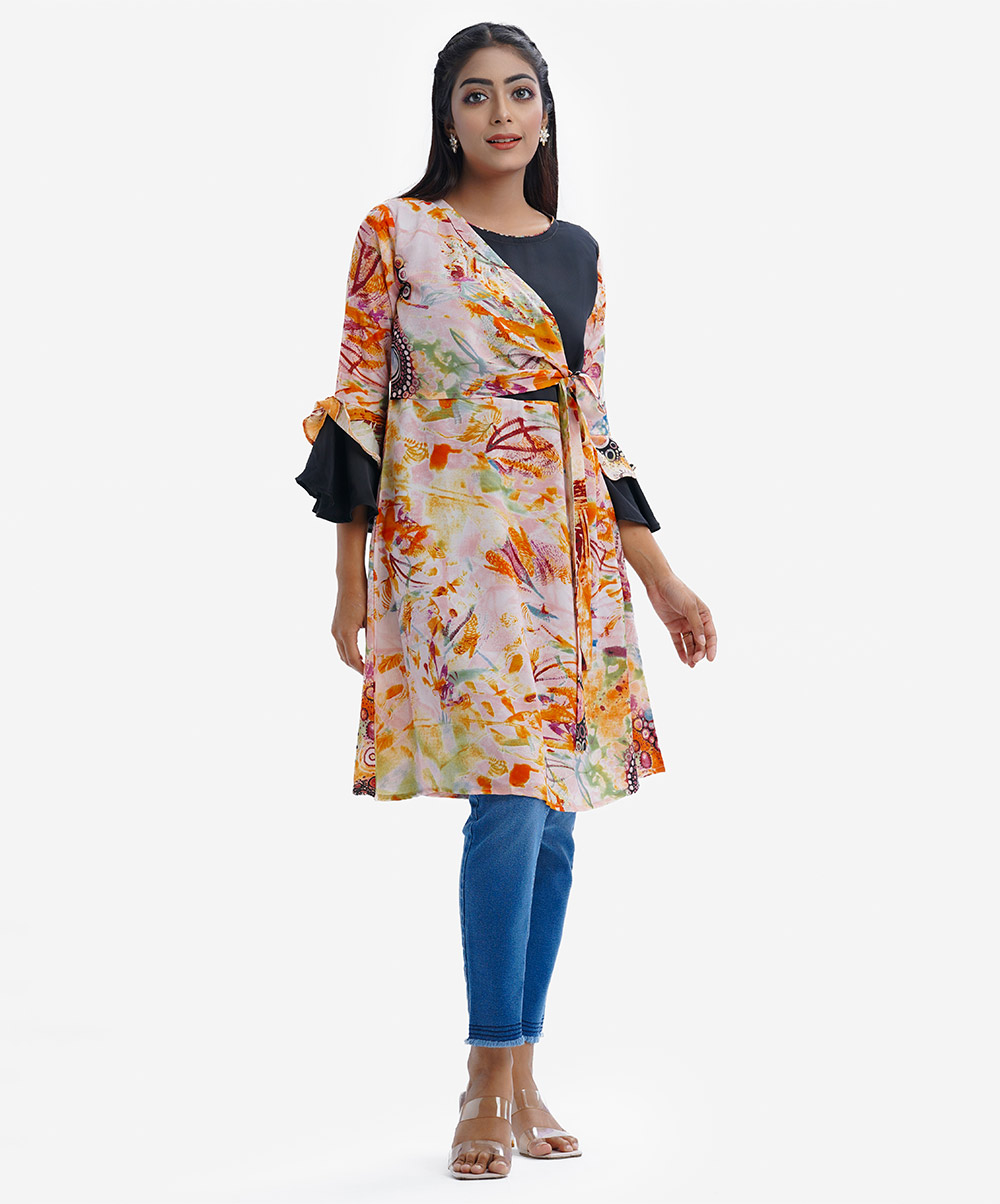 Printed retro wrap style A-line tunic in georgette fabric. Round neck, lantern-sleeved and waistbelt.