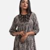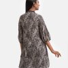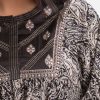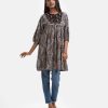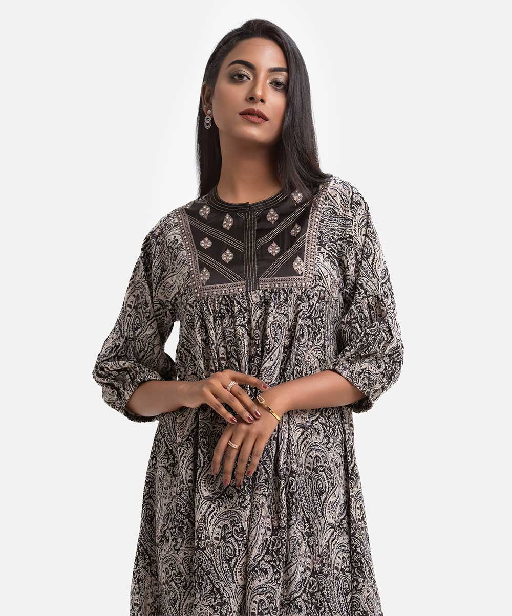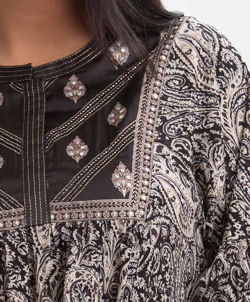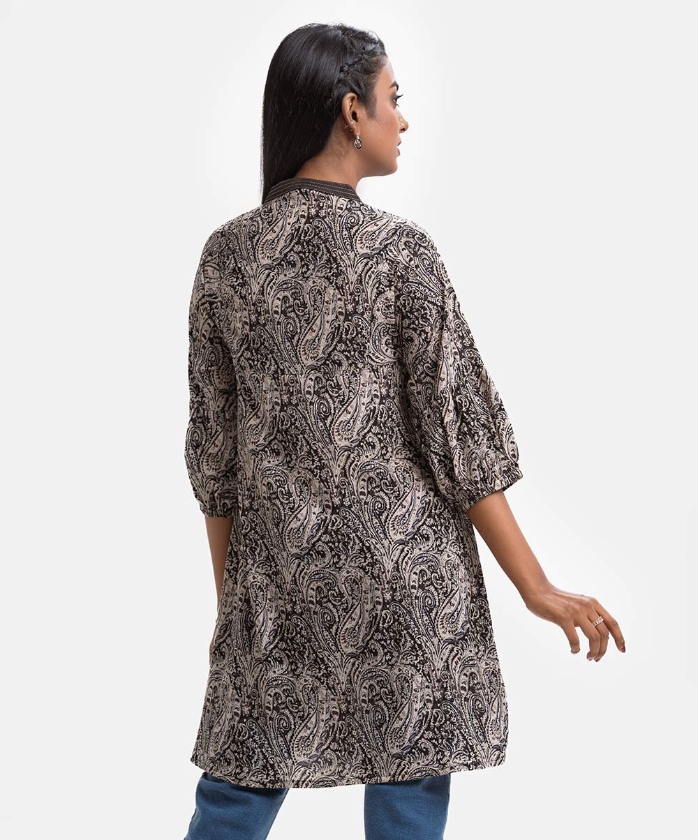 Women’s Empire-style tunic in printed georgette fabric. Mock neck, balloon sleeves. Karchupi at front.