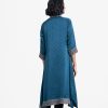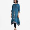 Printed A-line tunic in crepe fabric. Stand collar, three-quarter sleeved. Karchupi at the front.