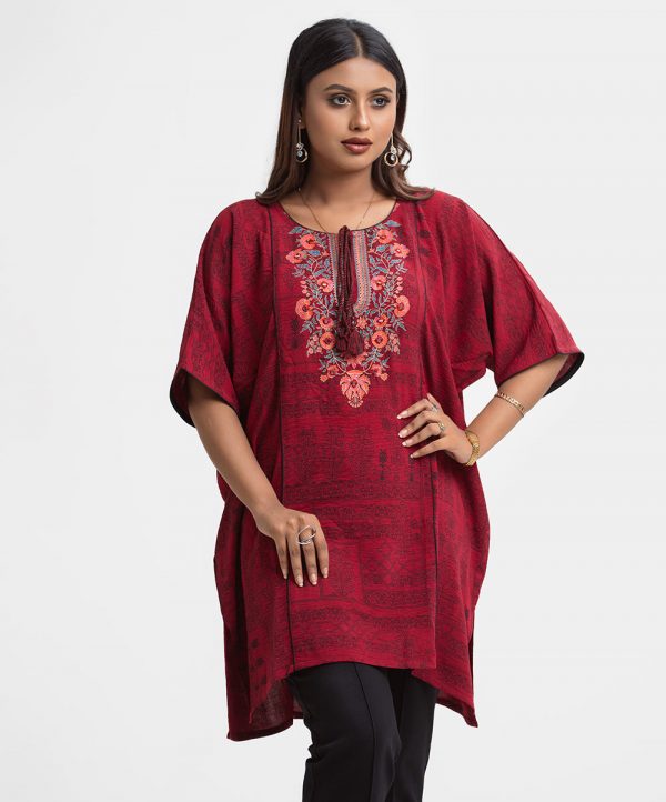 Women’s floral printed kaftan-style tunic in stretchable georgette fabric. Round neck with slit attached tassel tie, kimono sleeves. Karchupi at front.