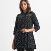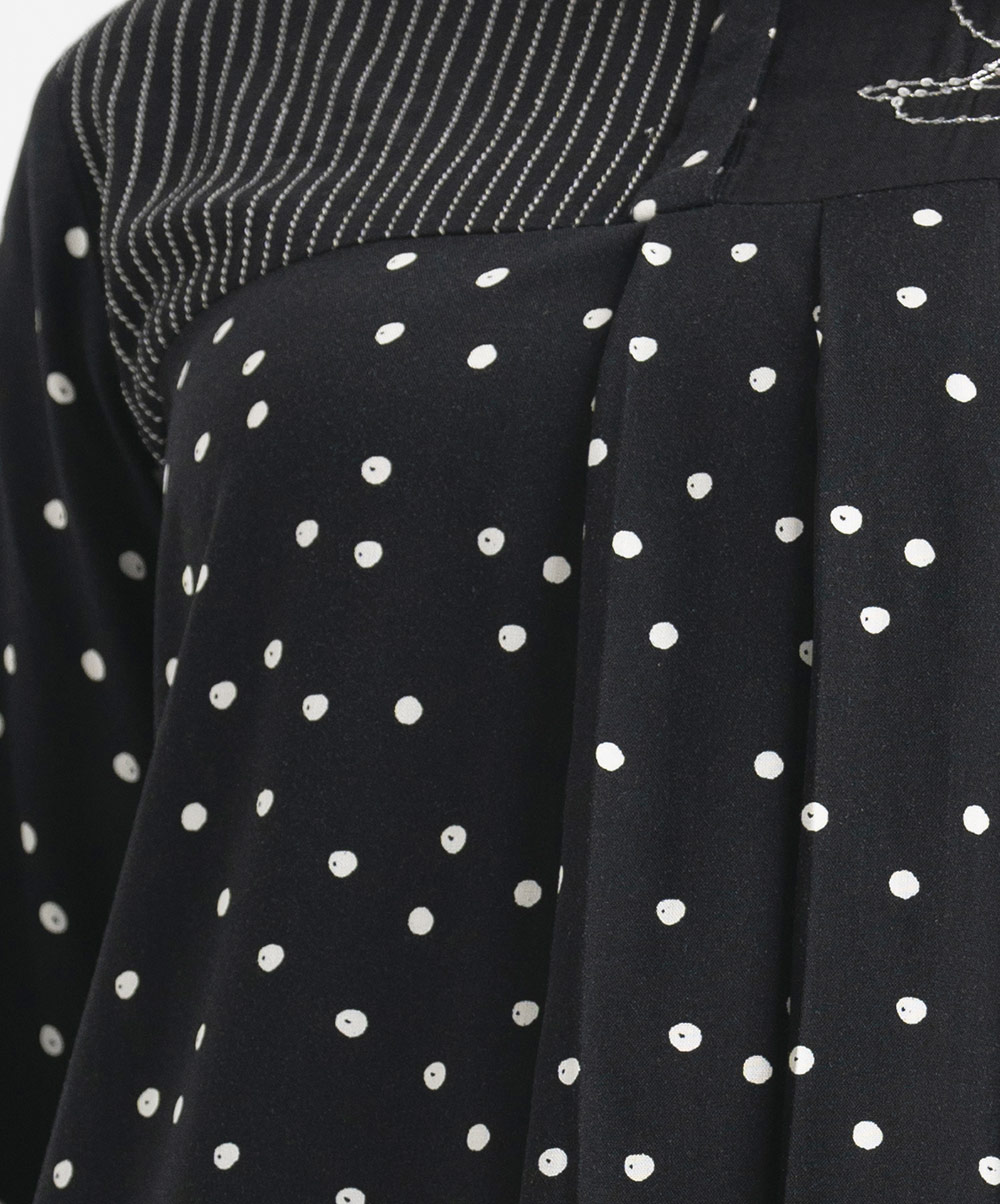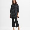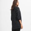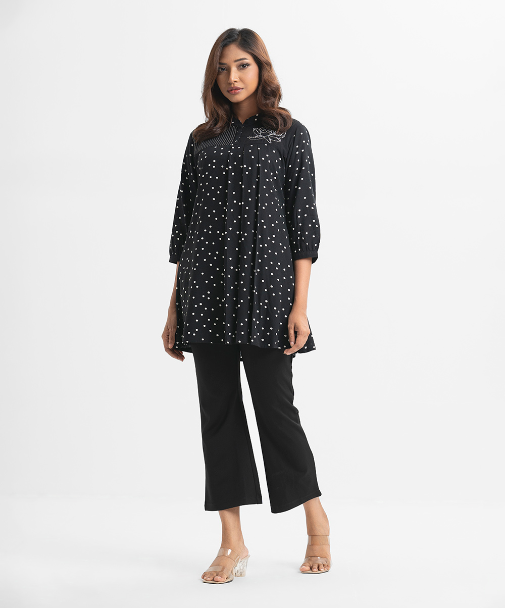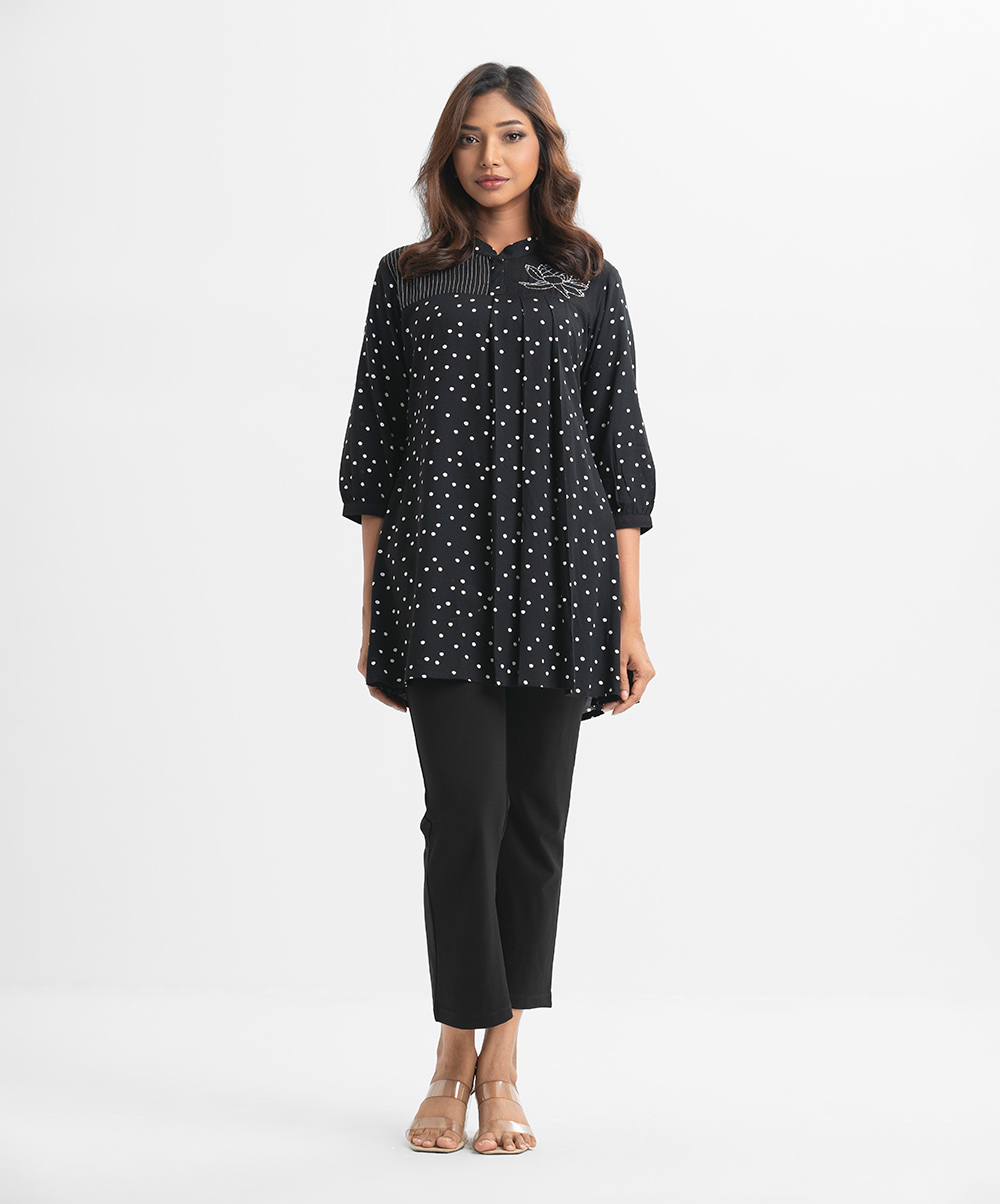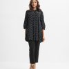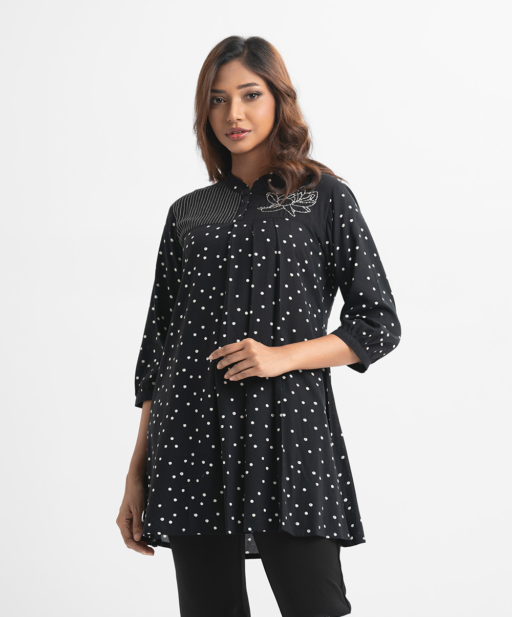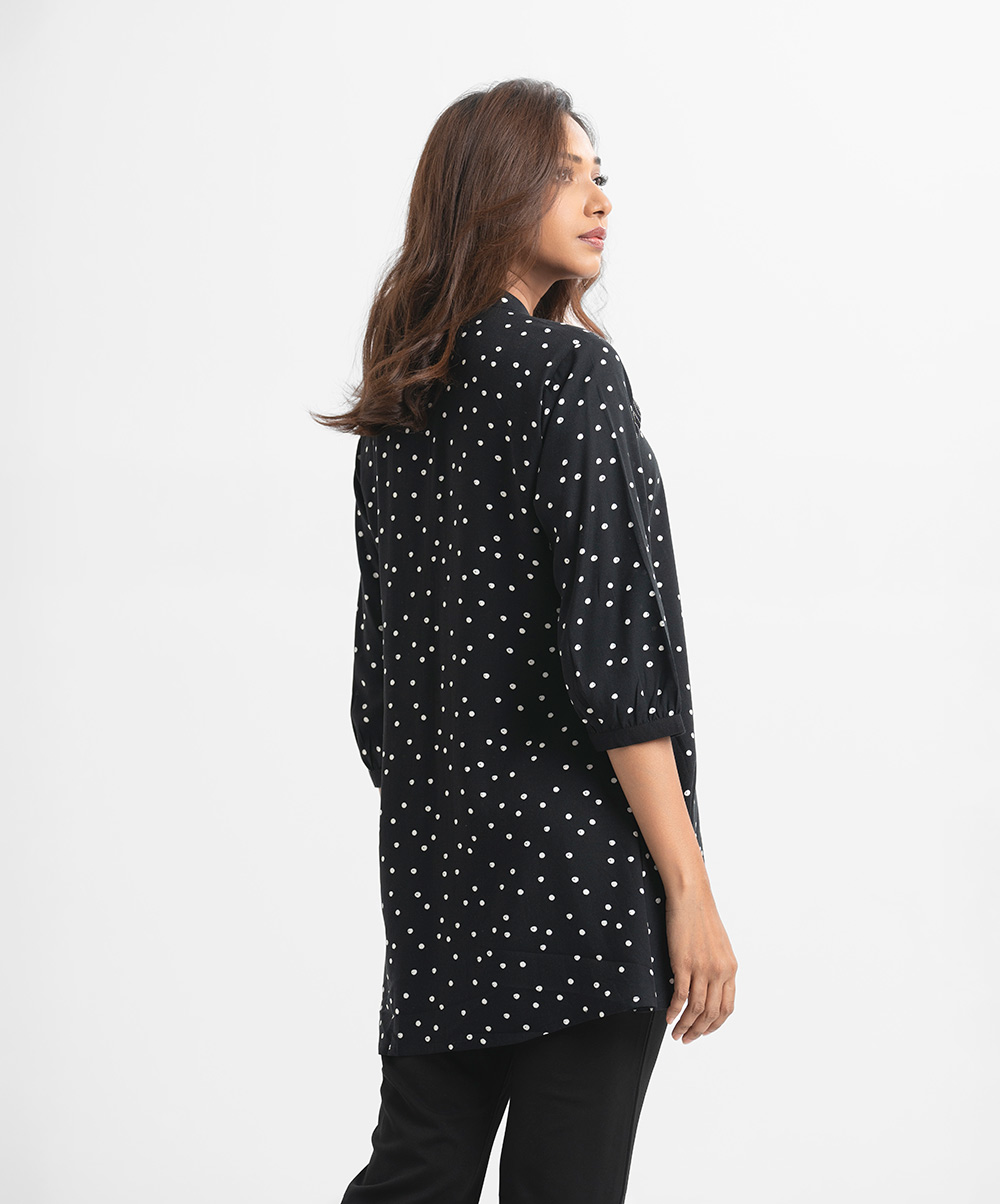 Women’s tent-style short tunic in printed viscose fabric. Mandarin collar, bishop sleeves. Karchupi and line stiching at front.