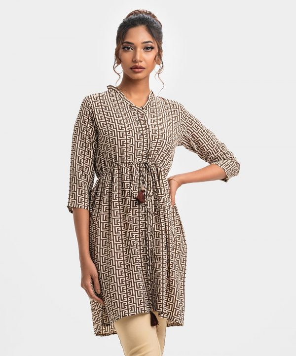 Women’s printed tent-style tunic in georgette fabric. Ruffle neck, three-quarter sleeves, Adjustable tassel tie at waist.