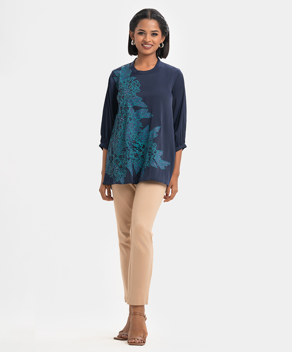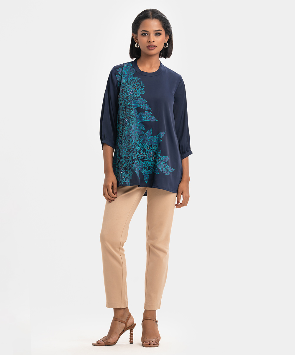 Women’s short-length tunic in joom fabric. Three-quarter sleeves and mock neck. Print detail with karchupi at the front.