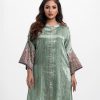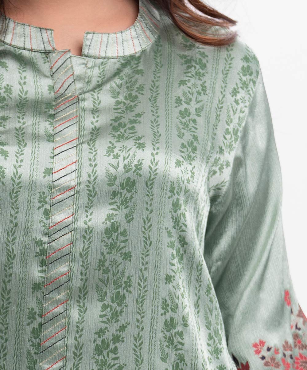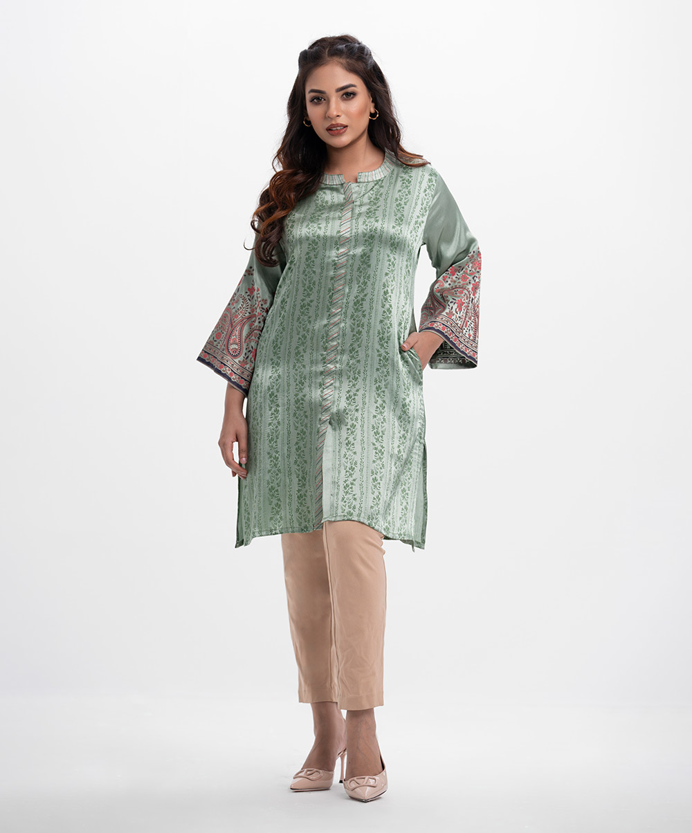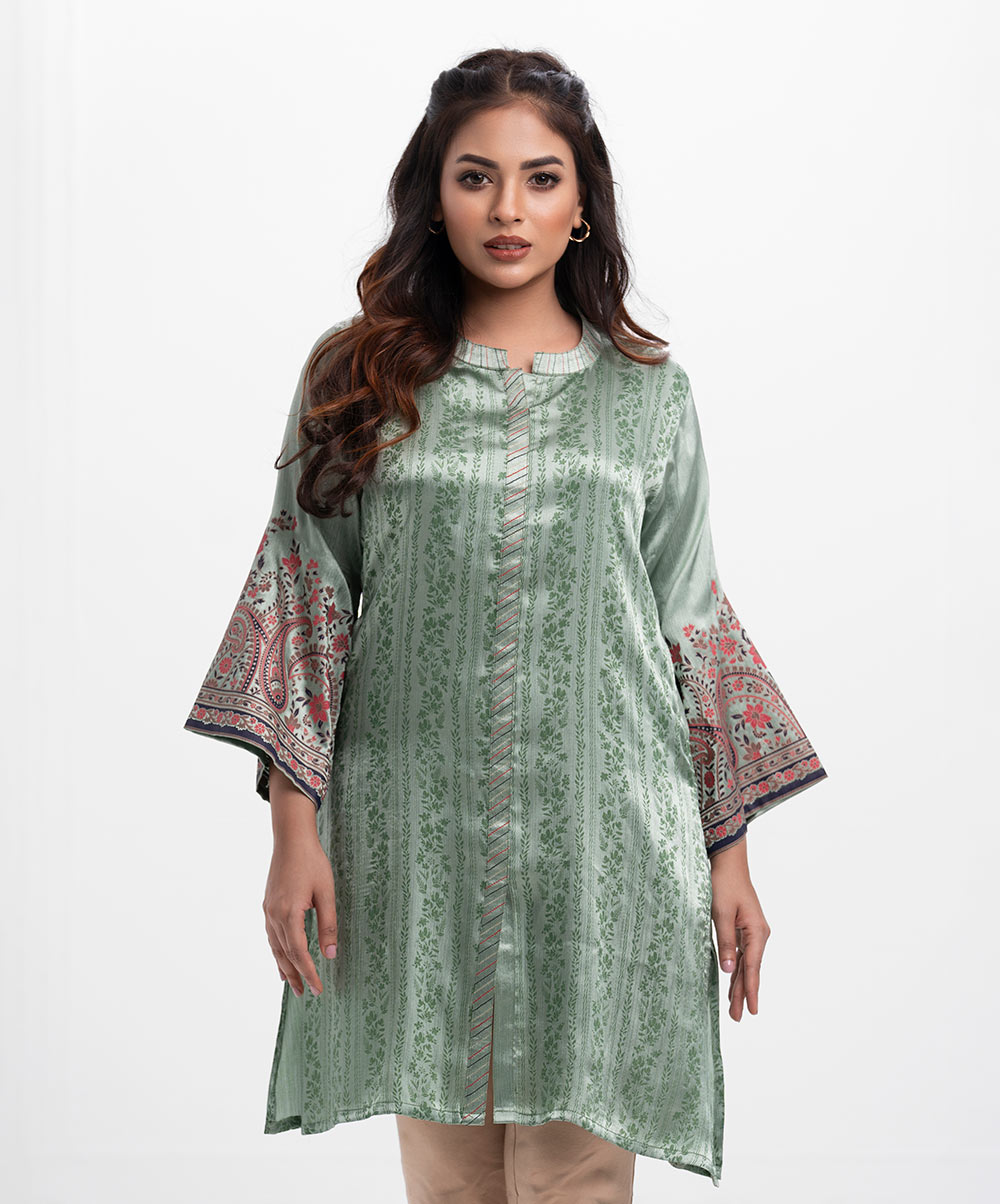 Bell-sleeved tunic in satin georgette fabric. Mock neck, inseam side pockets.