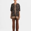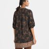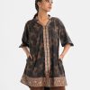 Women’s straight long tunic in printed georgette fabric. Mandarin collar with v placket, bishop sleeves. Patchwork at front.