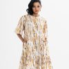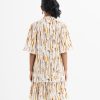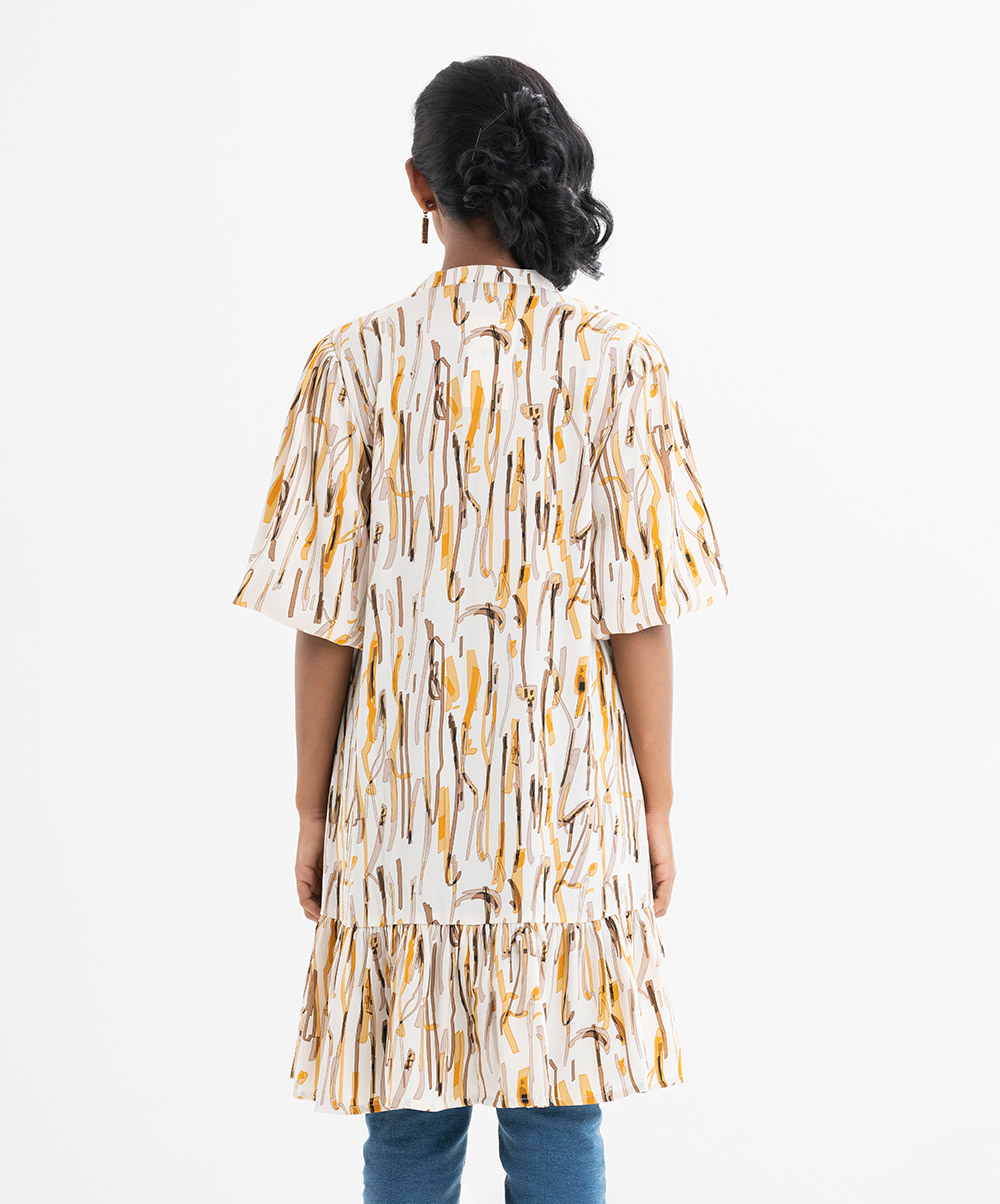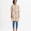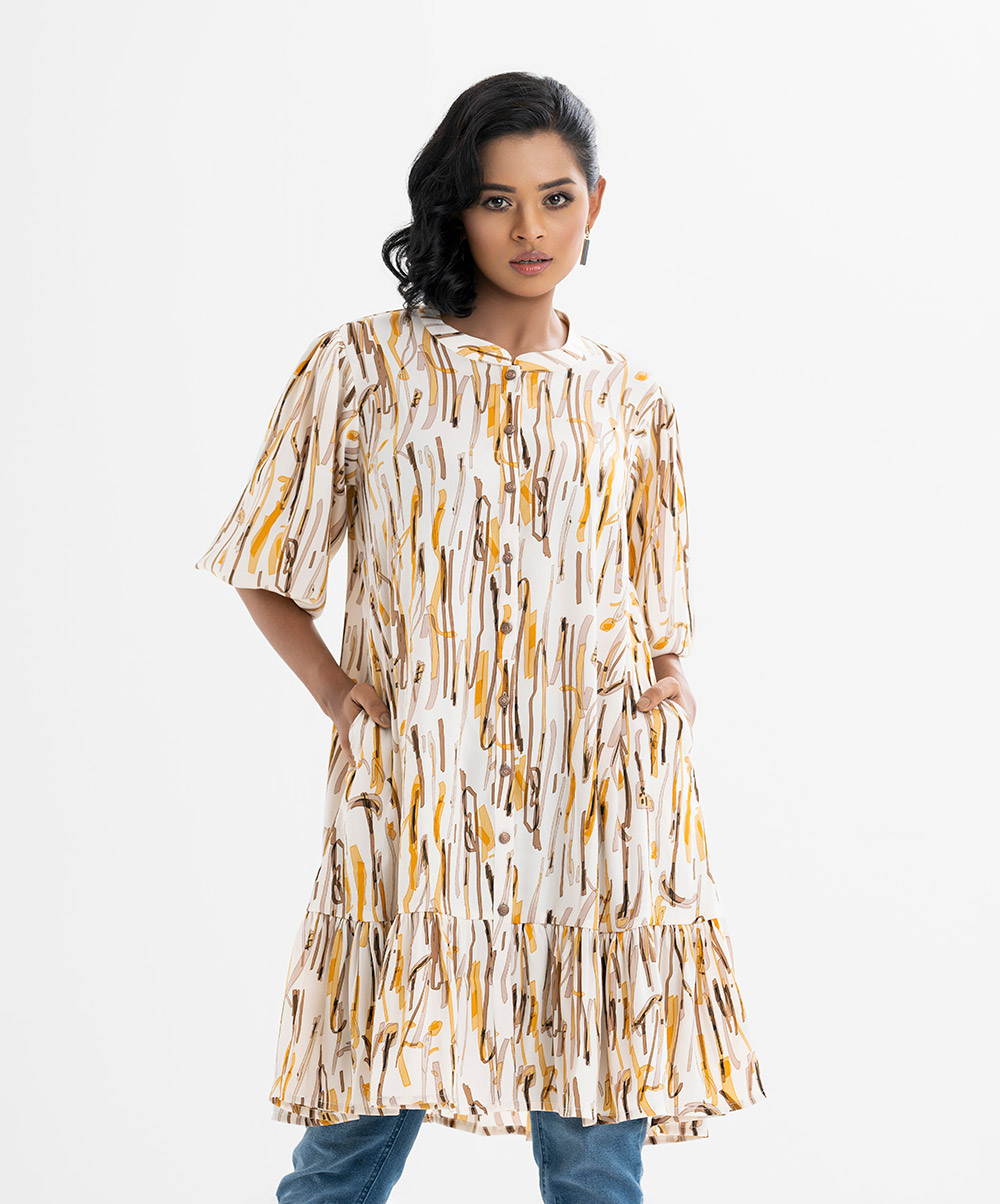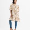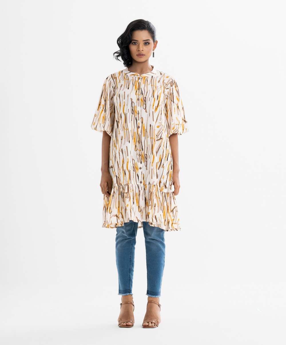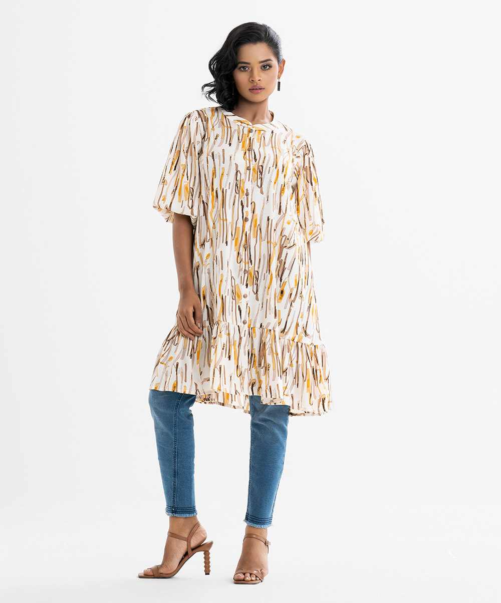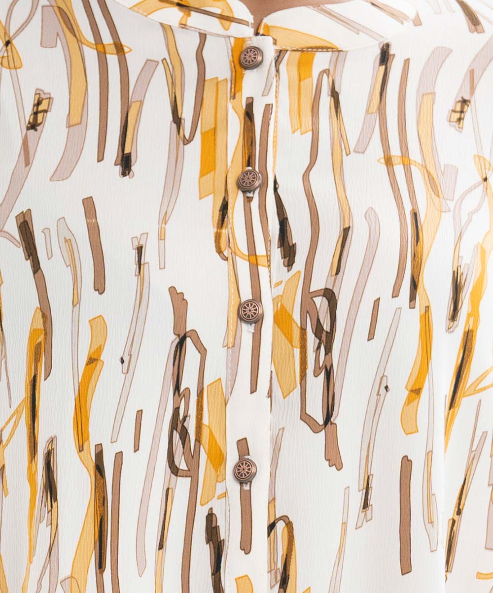 Women’s printed tent-style tunic in georgette fabric. Stand collar, balloon-sleeved and button fastening at the front.