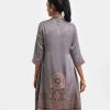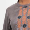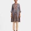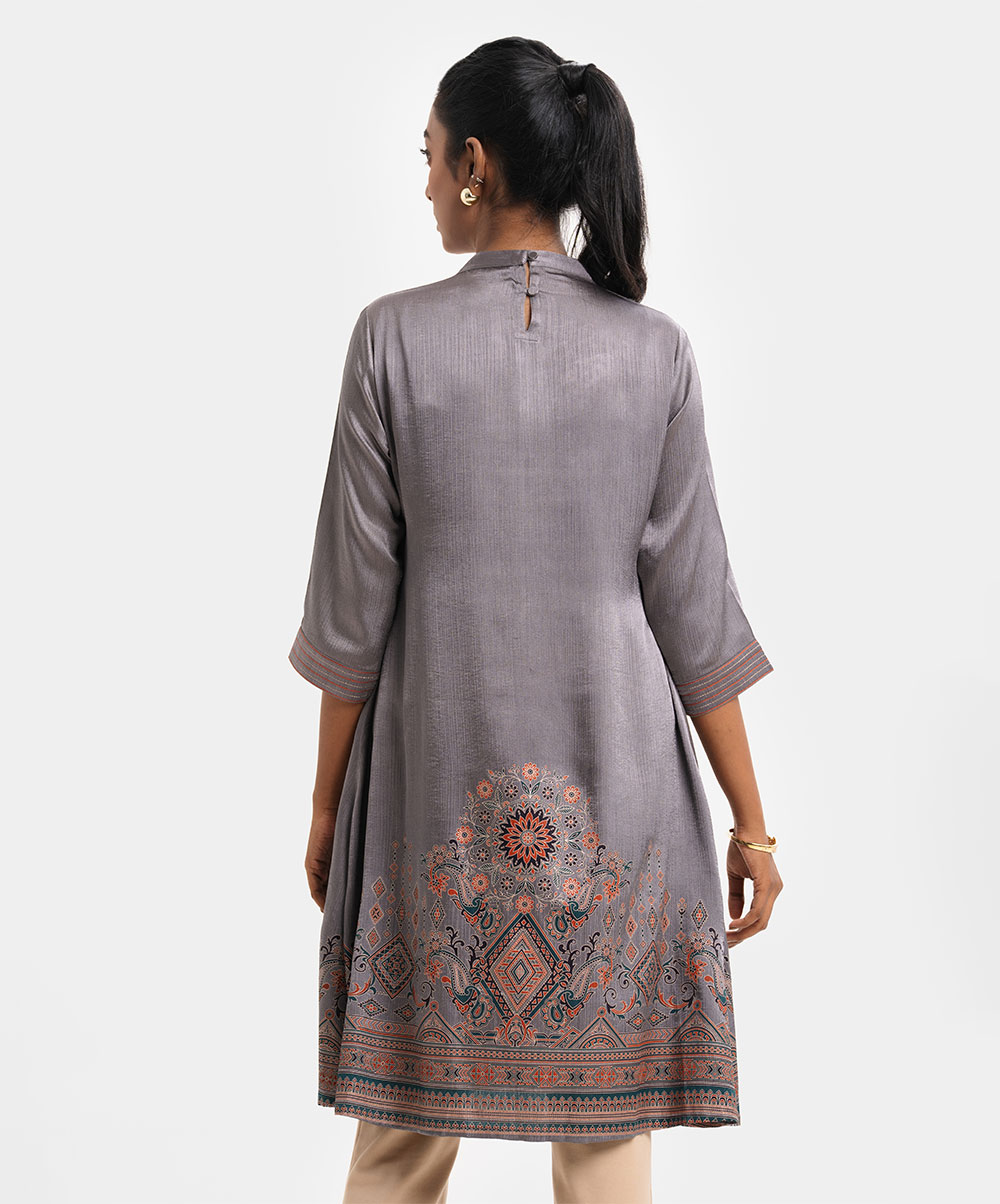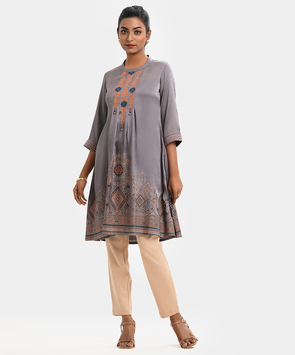 Women’s A-line tunic in textured georgette fabric. Mock neck, three-quarter sleeves. Embroidery with tassels and box pleated at front. Print detail at hemline.
