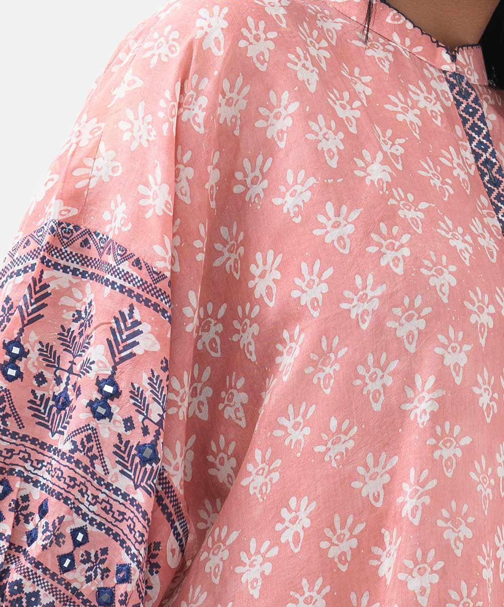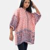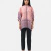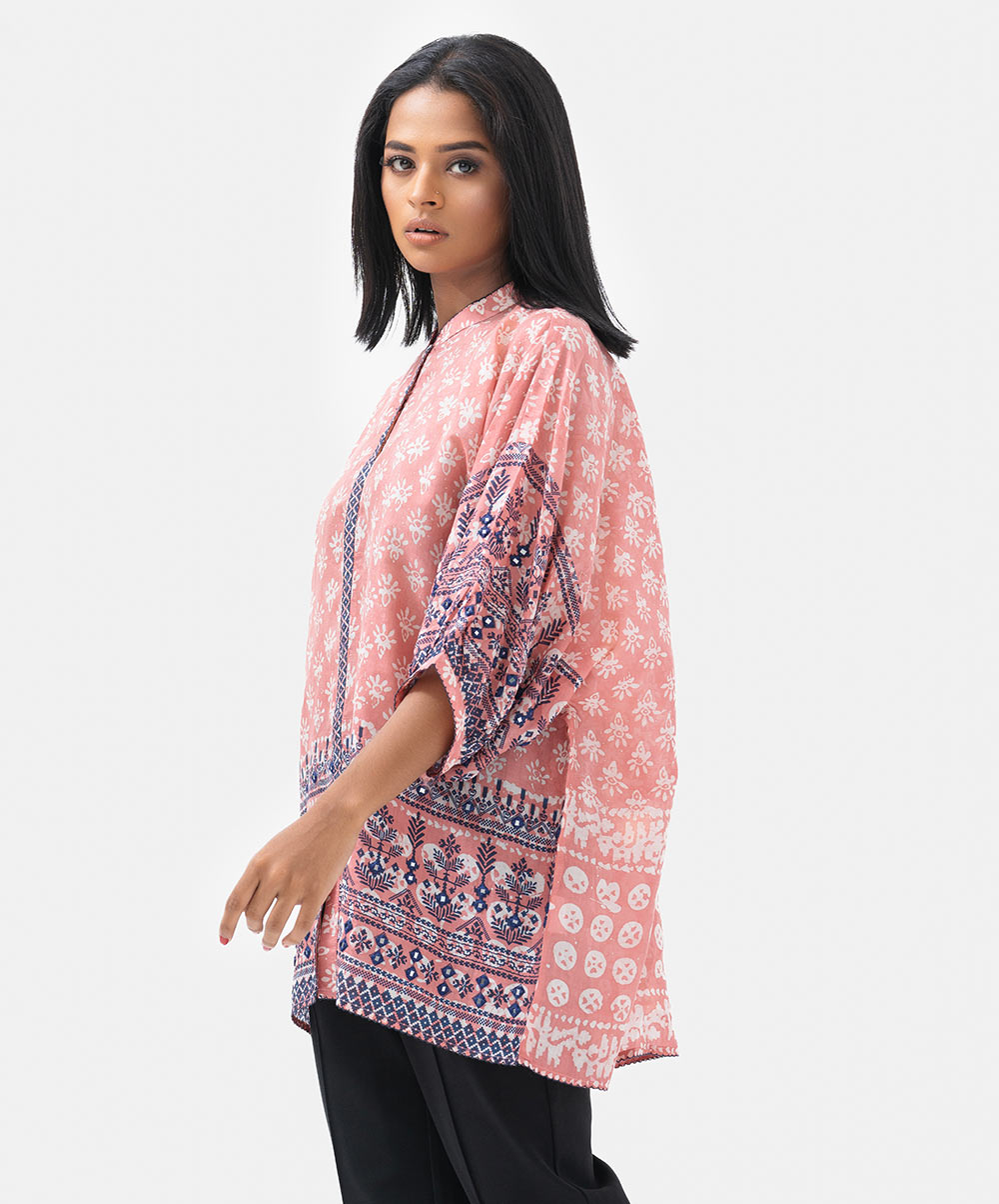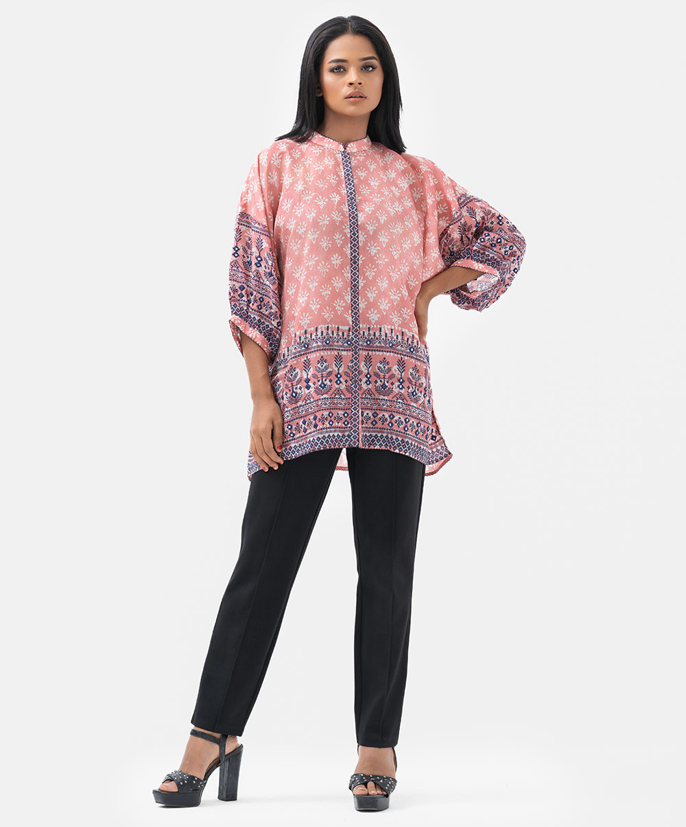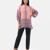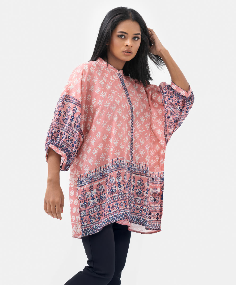 Women’s tie-dye short tunic in blended cotton fabric. Stand collar, short sleeves and karchupi at the hemline.