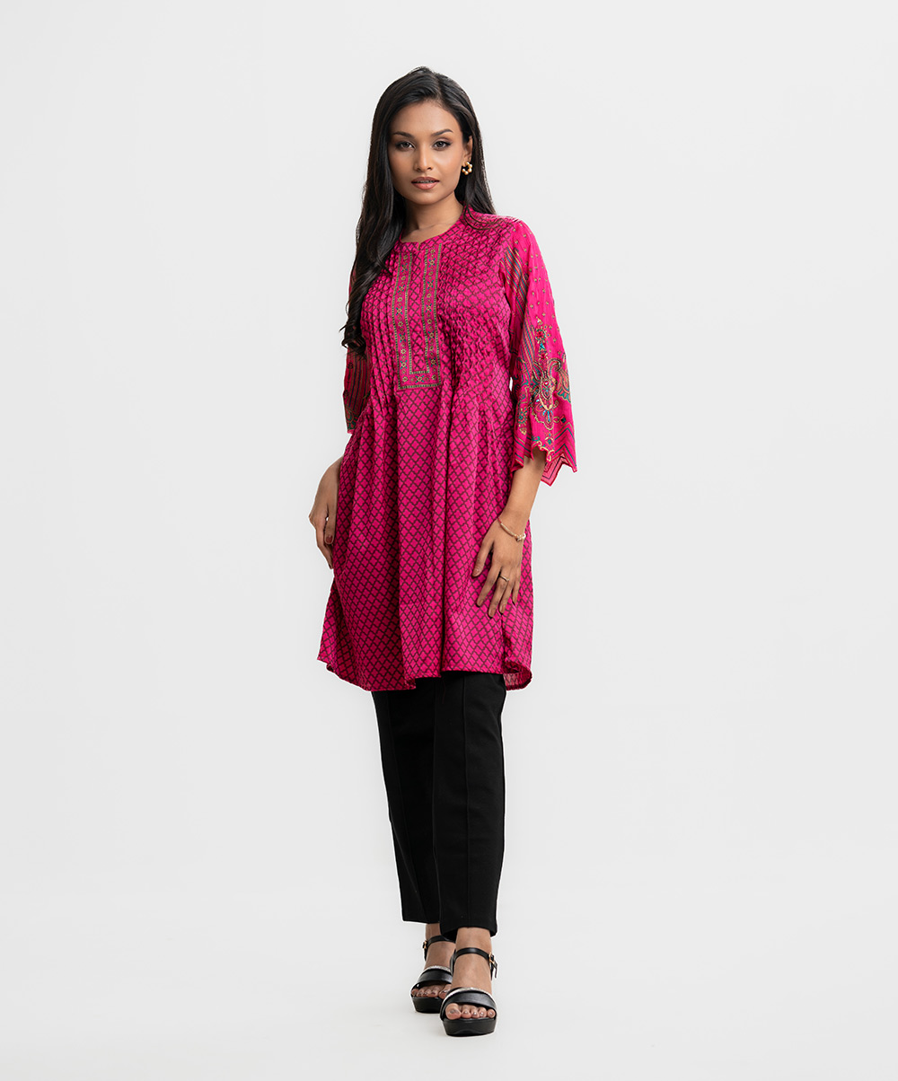 Band collar tunic in soft satin georgette fabric. Scallop cut at cuffs. Pintuck and karchupi detailed.