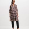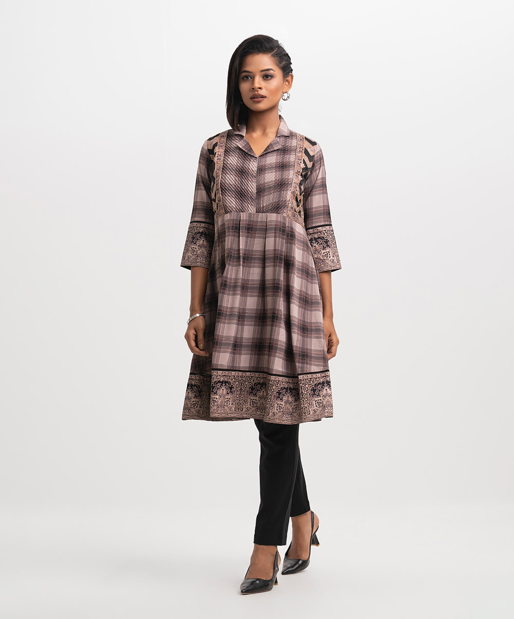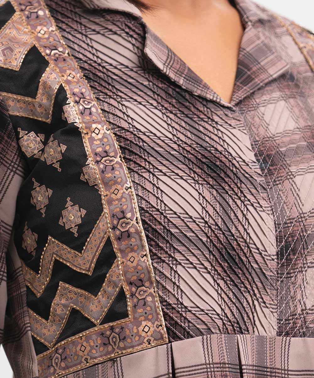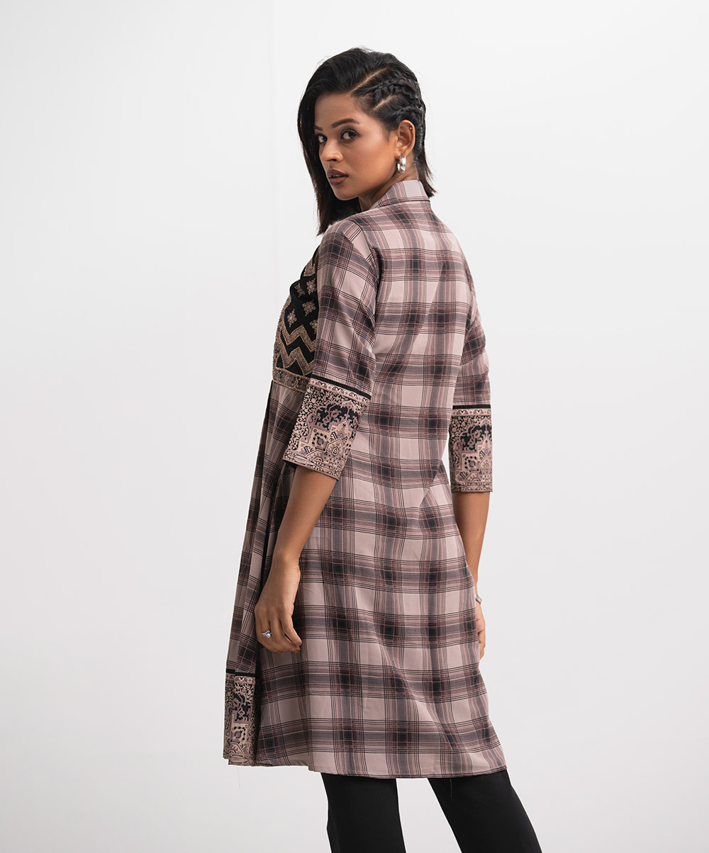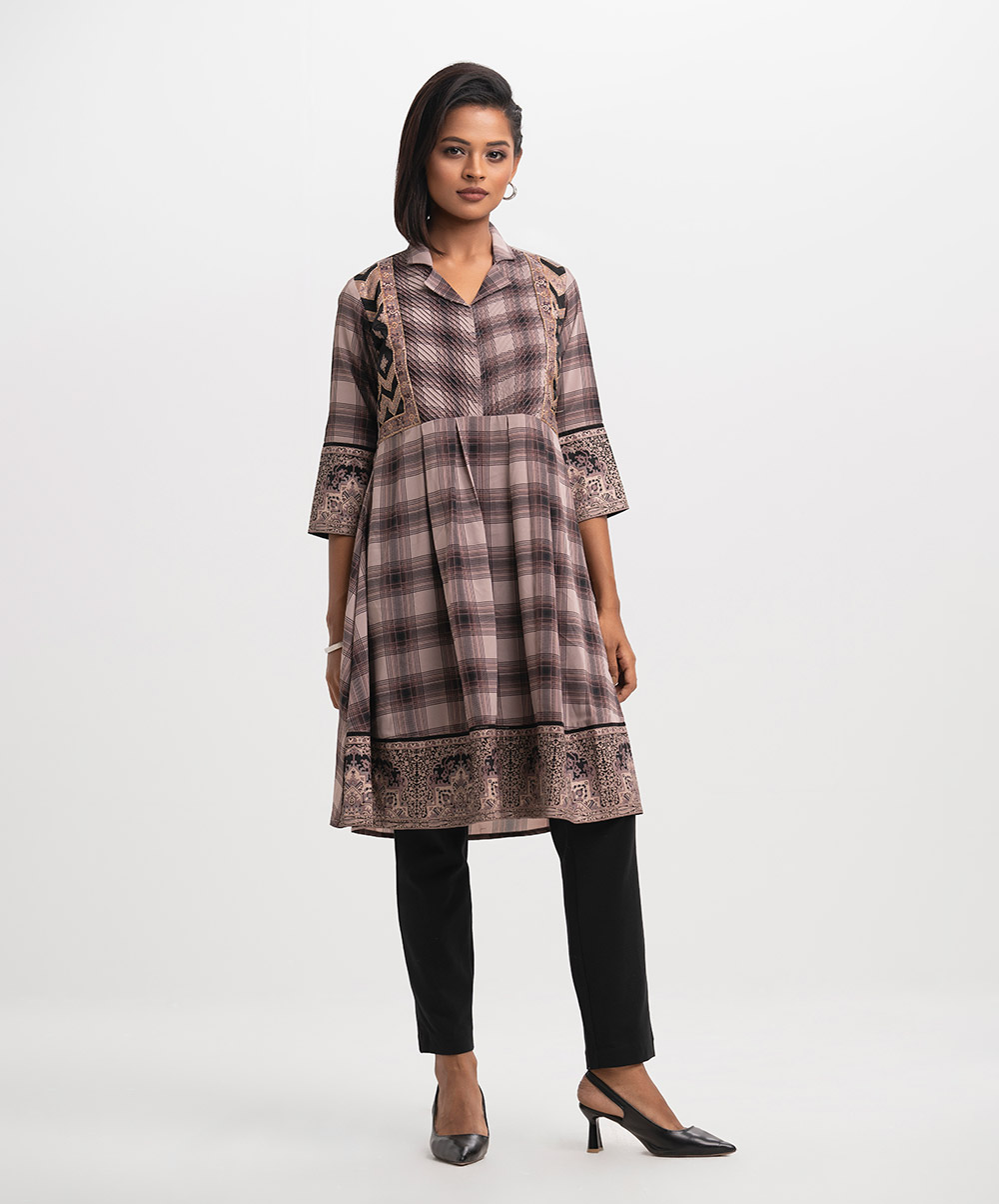Lapel collar A-line tunic in check faille fabric. Box pleated, pintuck and karchupi details at the front.