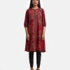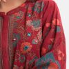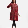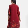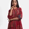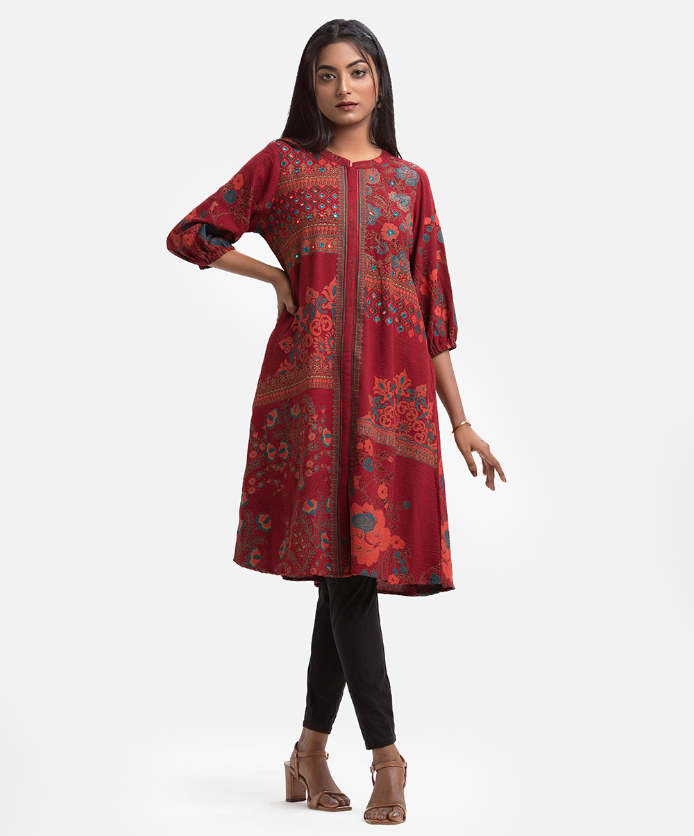 Women’s printed A-line tunic in stretchable georgette fabric. Stand collar, three-quarter sleeves. Mirror karchupi works at front.