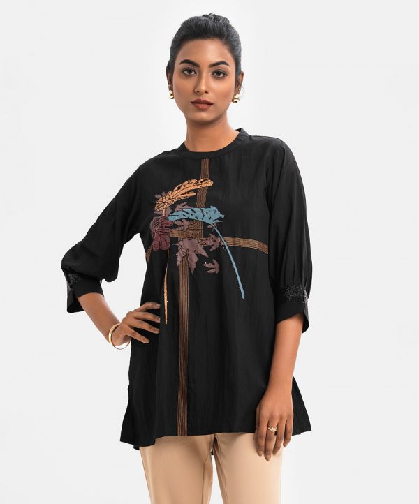 Women’s short style tunic in rayon blended fabric. Mock neck, bishop sleeves with sequins fabric patchwork. Print detail with karchupi at front.