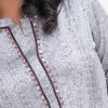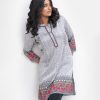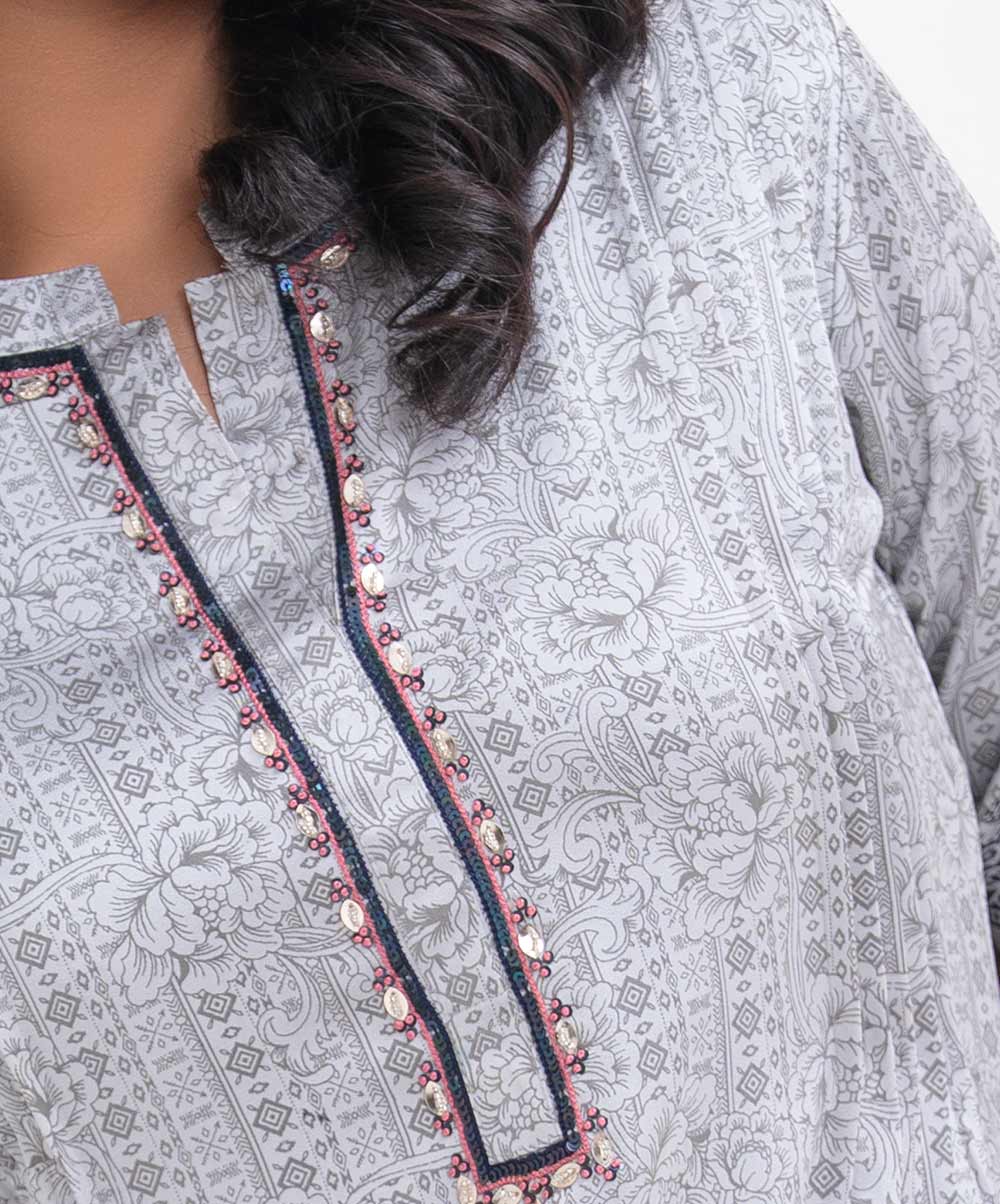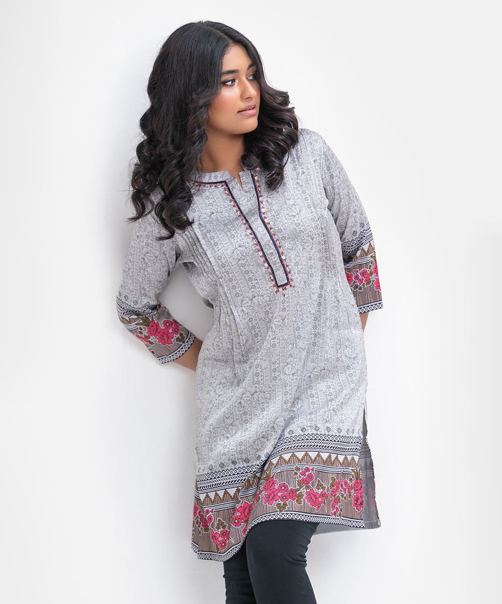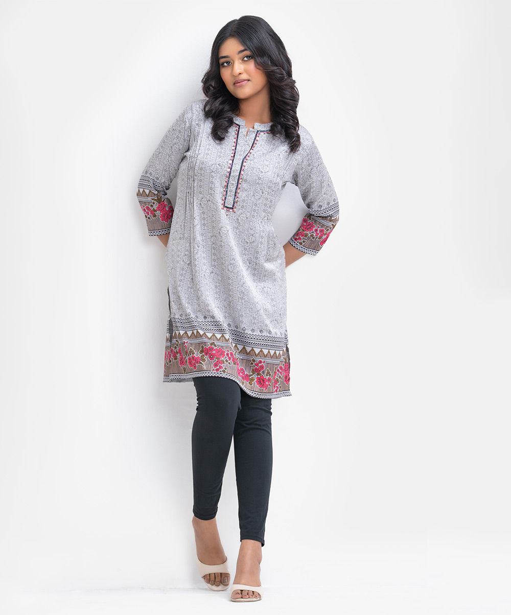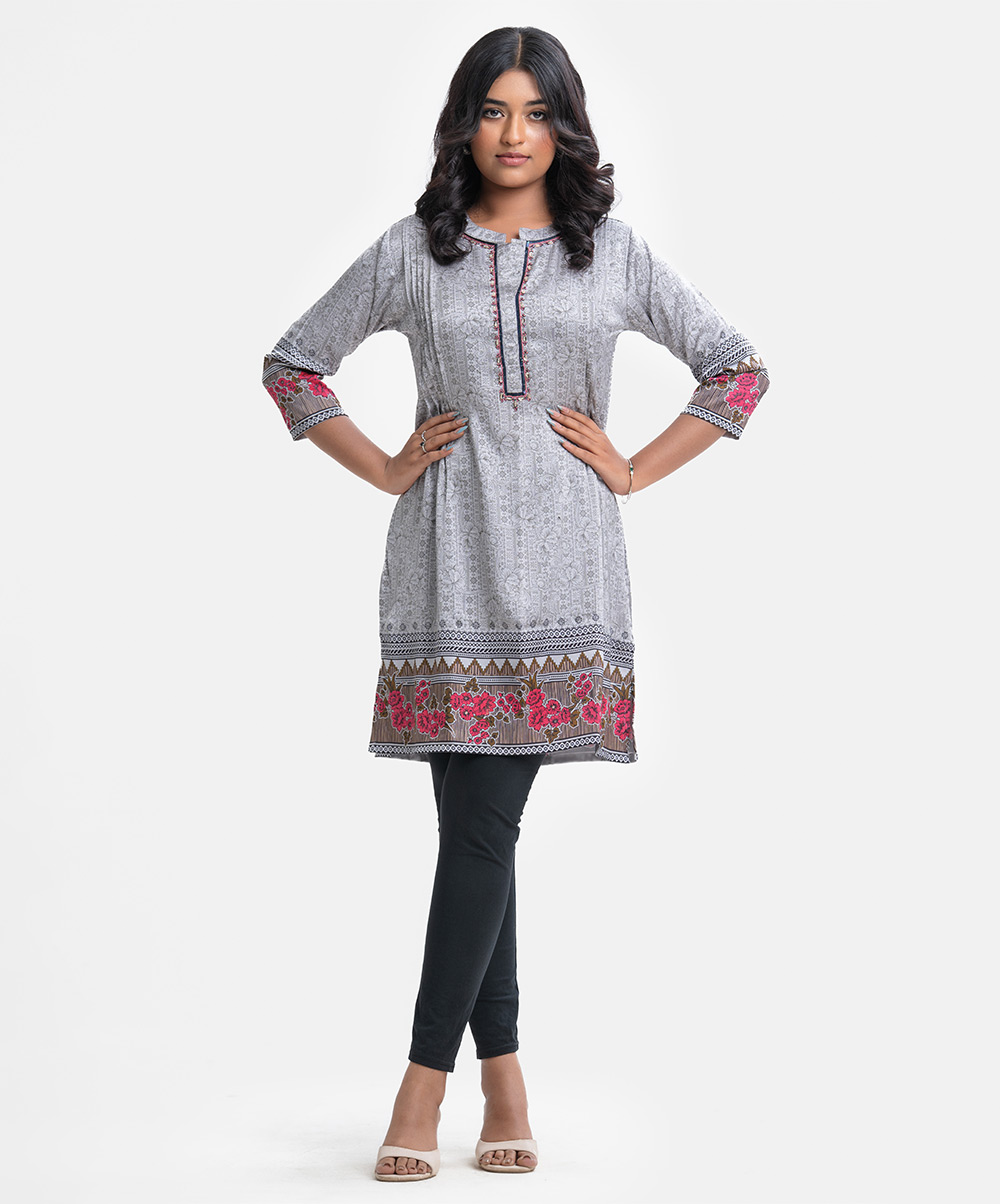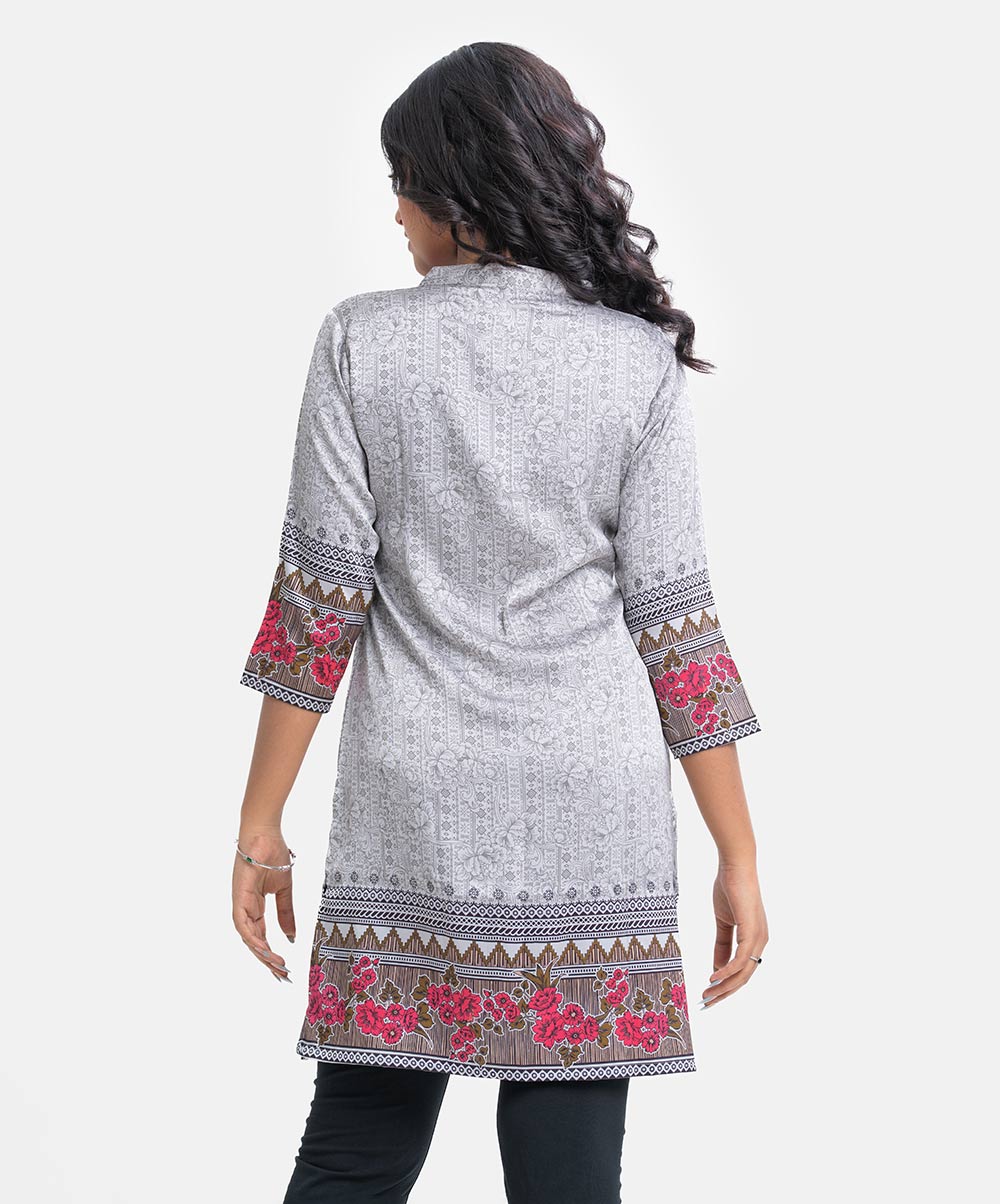 Women’s printed tunic in georgette fabric. Stand collar, three-quarter sleeves. Karchupi and pintuck at front.