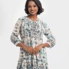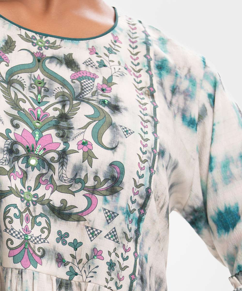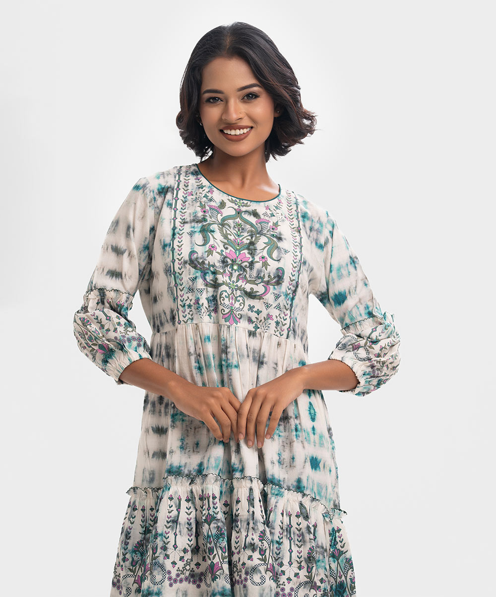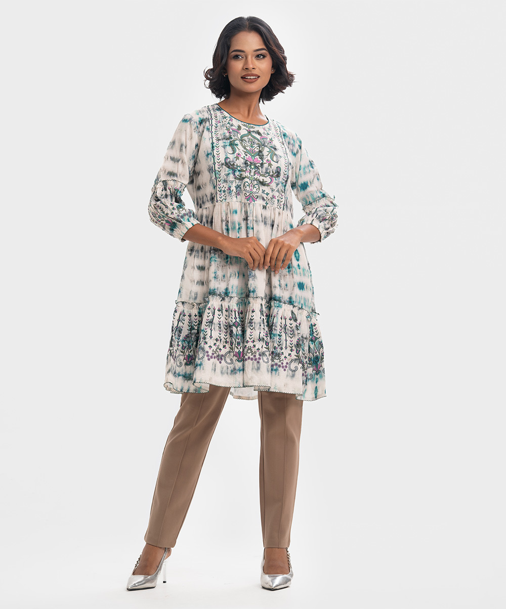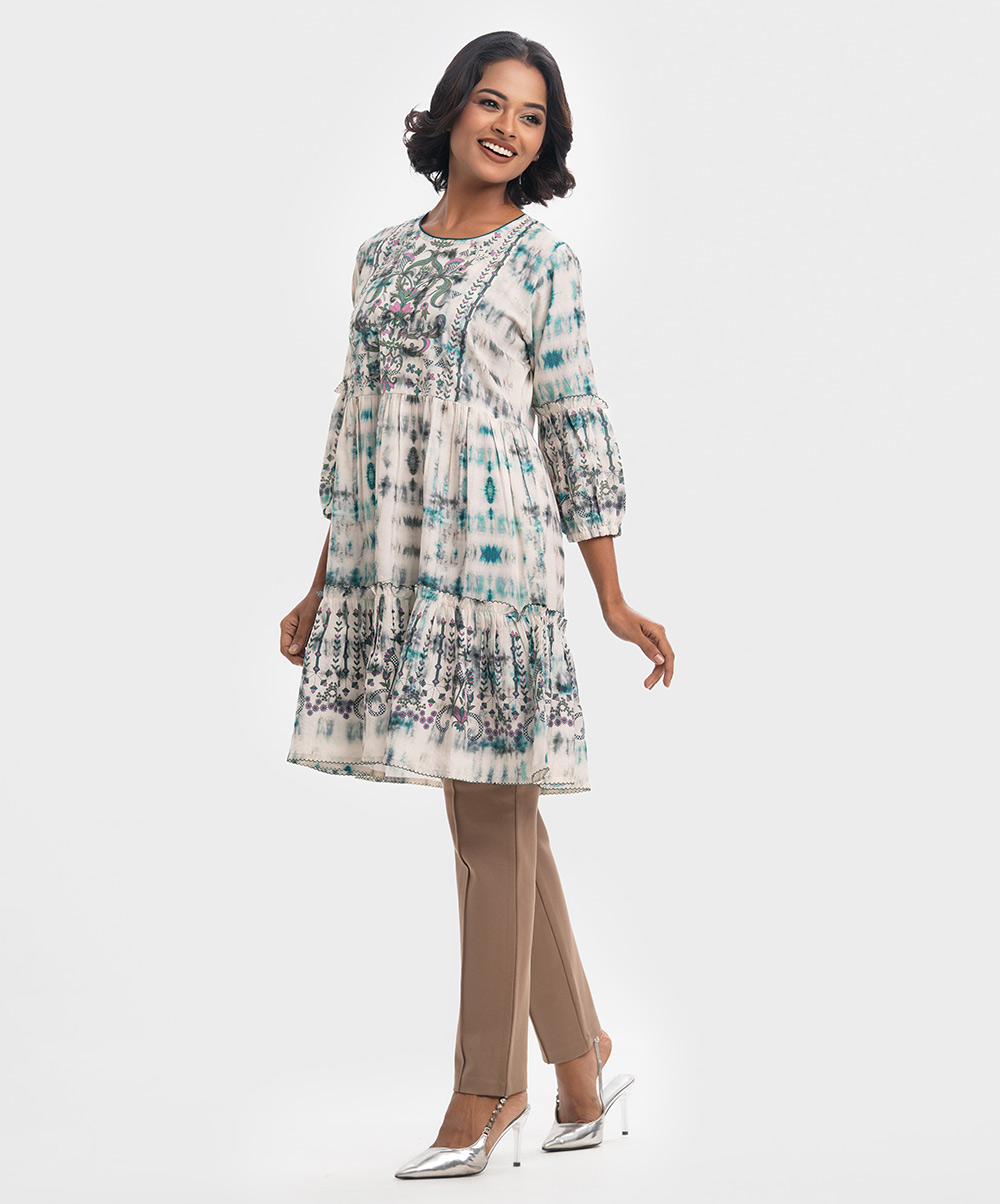 Round neck A-line tunic in cotton-blend fabric. Long frilled hemline. Three-quarter lantern sleeves with karchupi at the front.