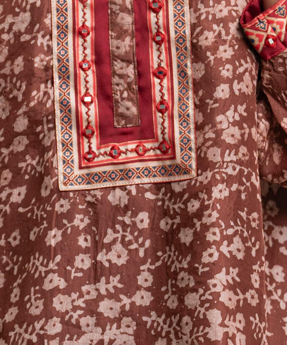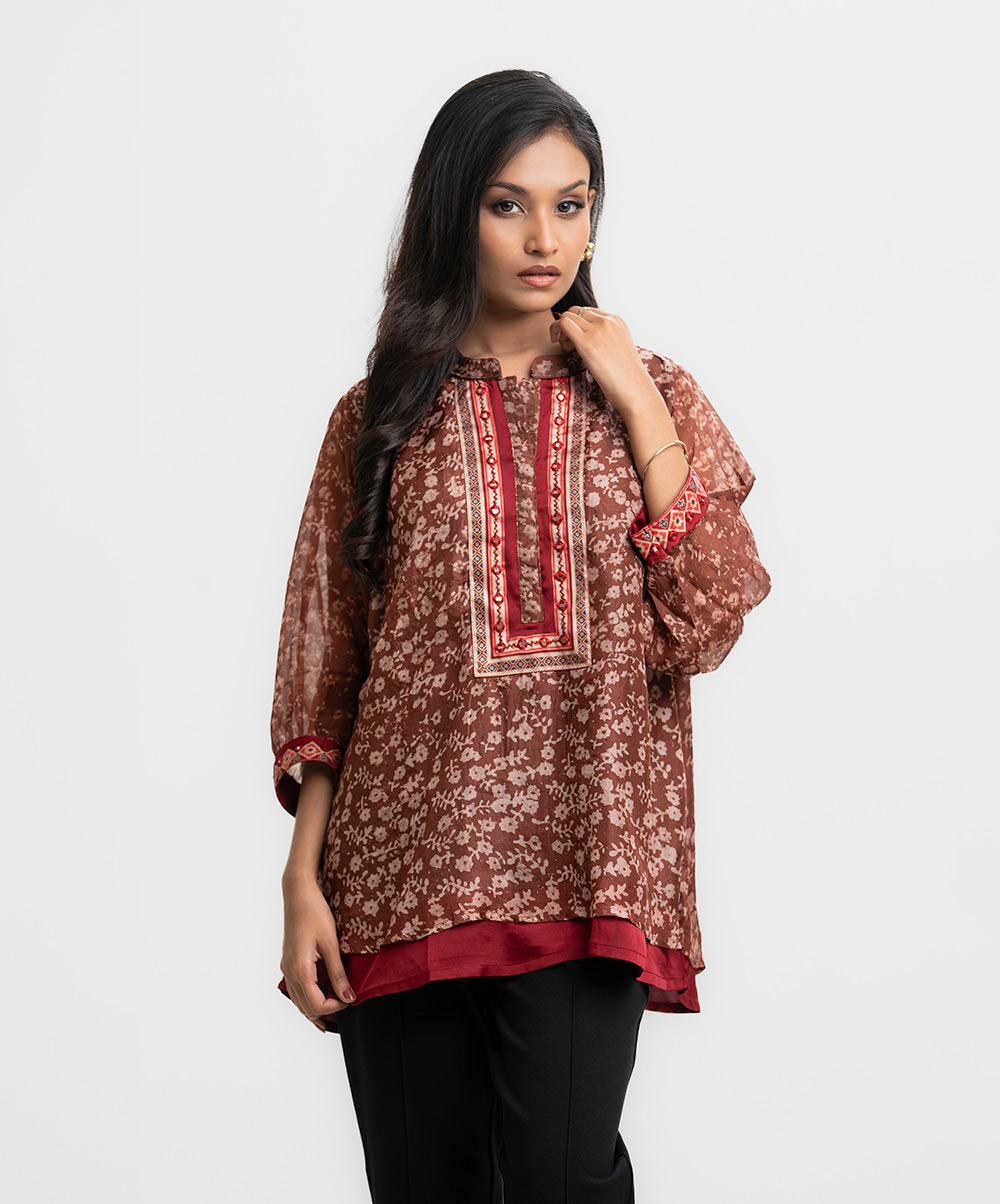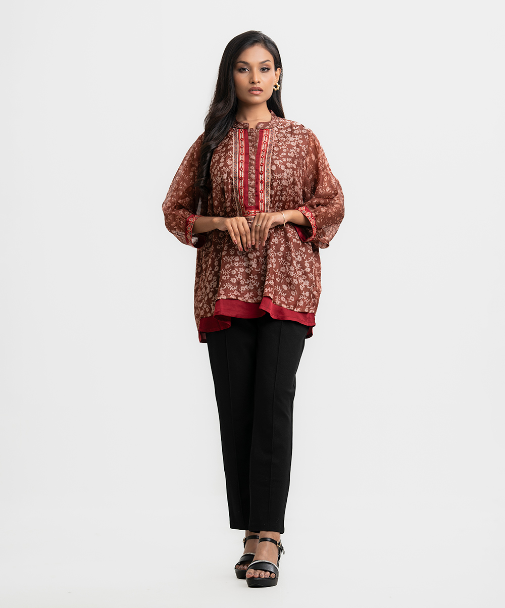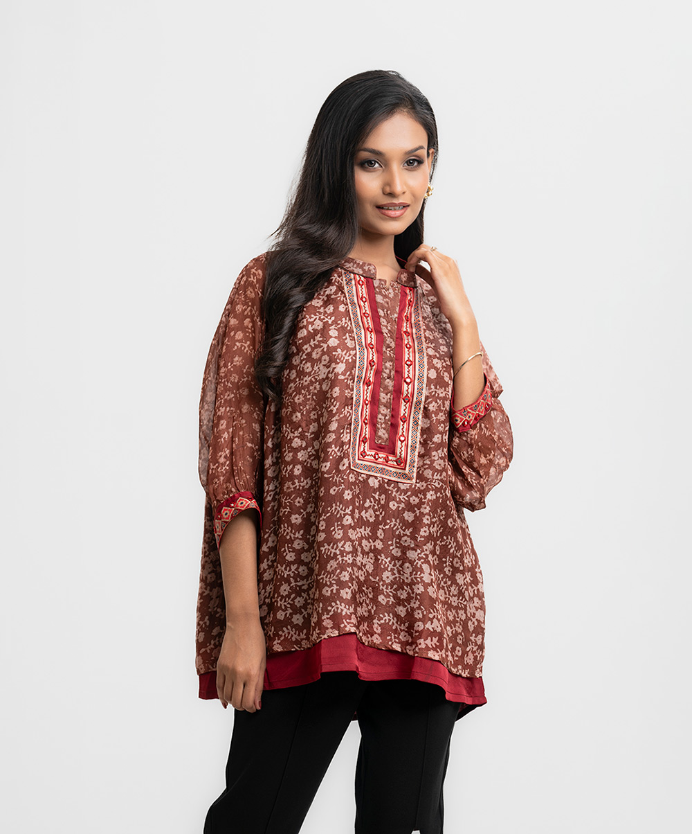 Exclusive layered dyed tunic from Nargisus by Le Reve in muslin fabric with crepe lining. Mandarin collar, batwing sleeves. Patch and embroidery at front & sleeves cuff.
