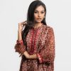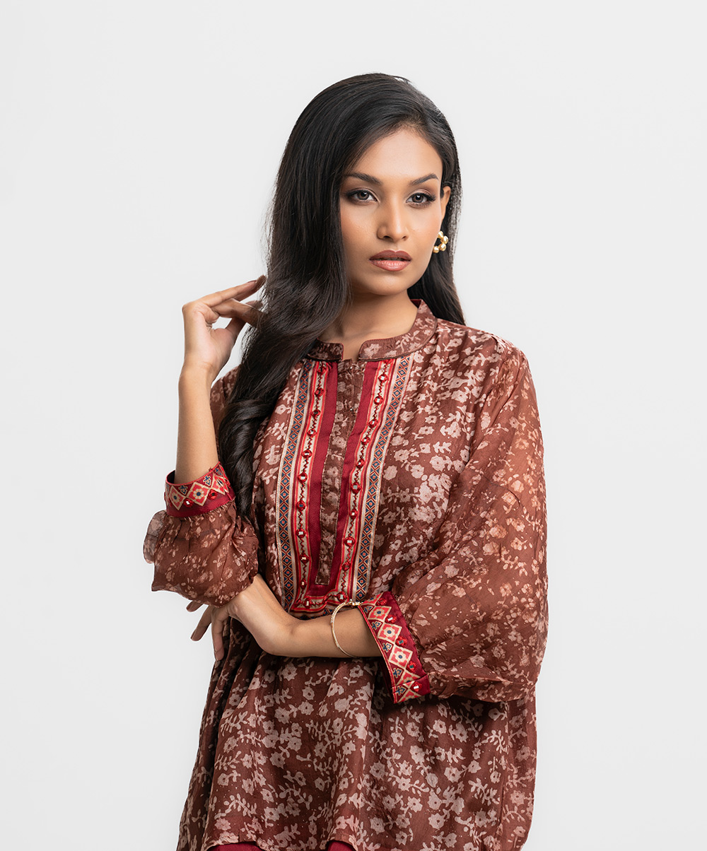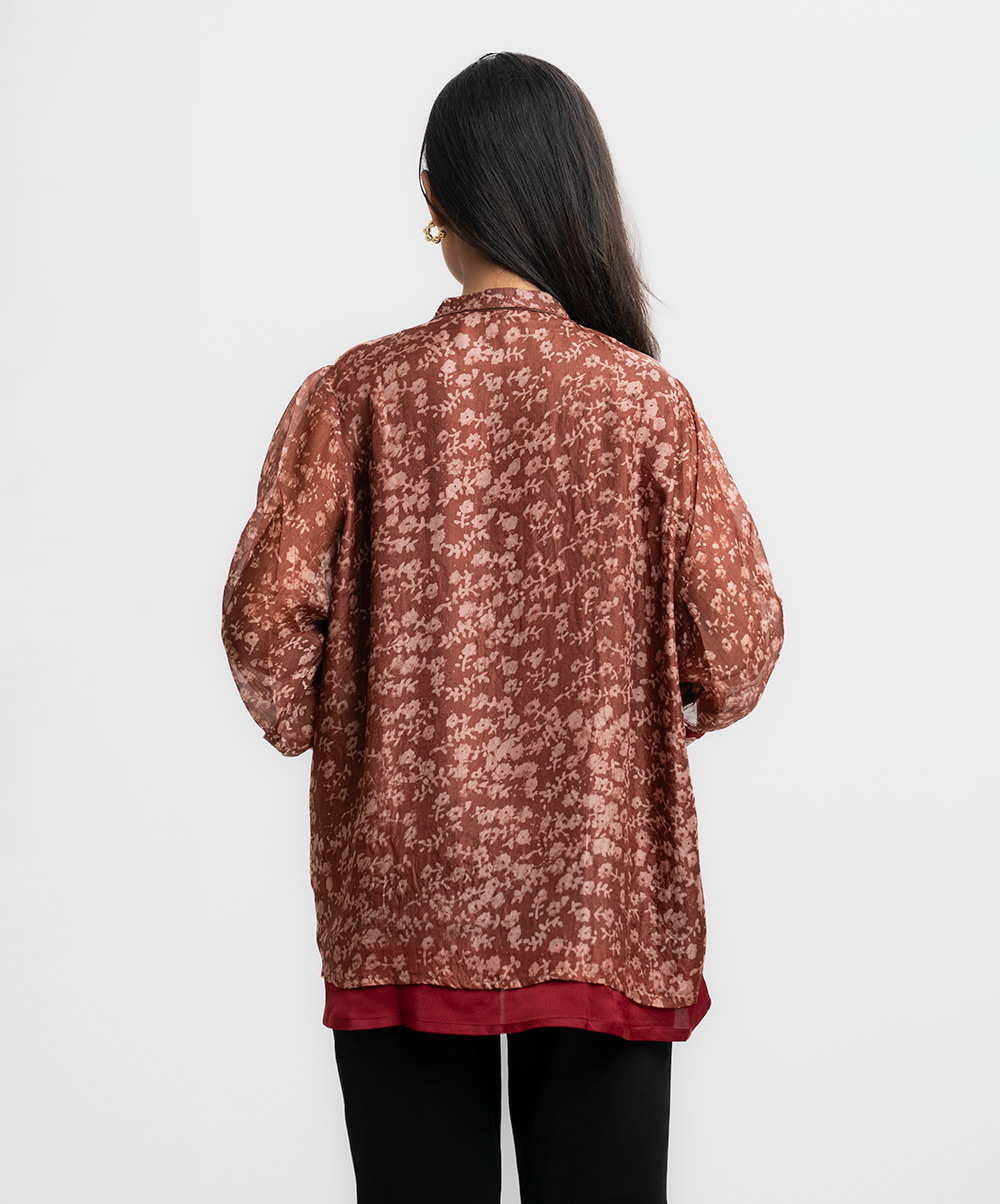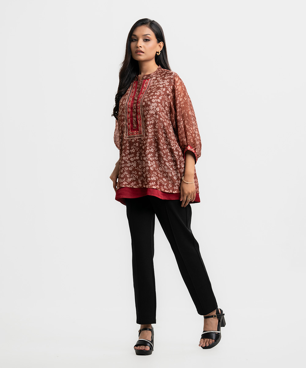 Exclusive layered dyed tunic from Nargisus by Le Reve in muslin fabric with crepe lining. Mandarin collar, batwing sleeves. Patch and embroidery at front & sleeves cuff.