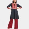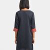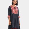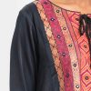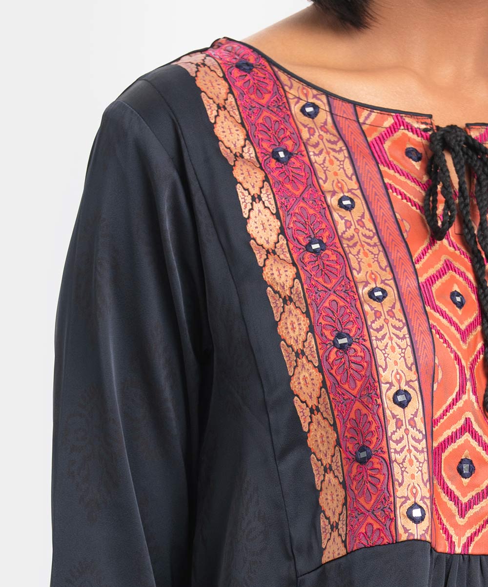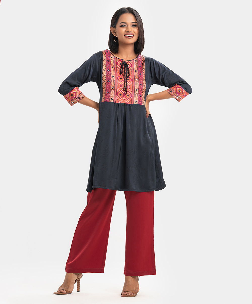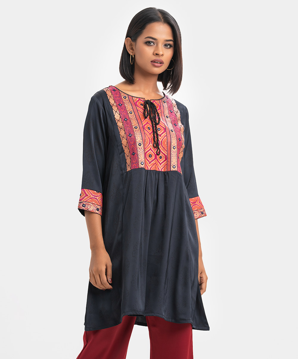 Women’s printed A-line tunic in georgette fabric. Three-quarter sleeves and round neck with slit attached tassel tie. Print detail with karchupi at the front and sleeves.