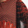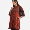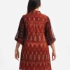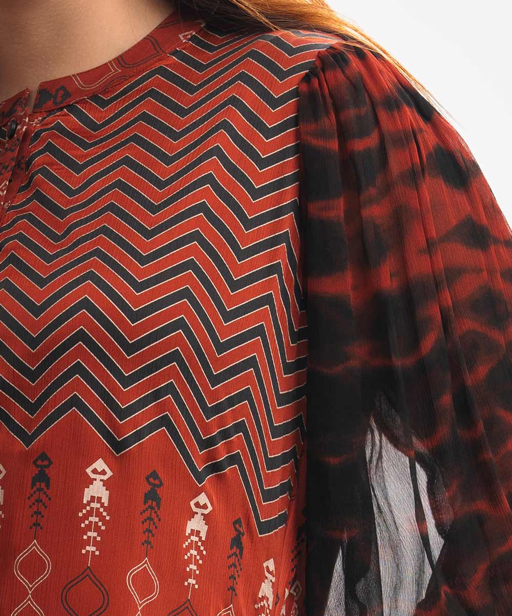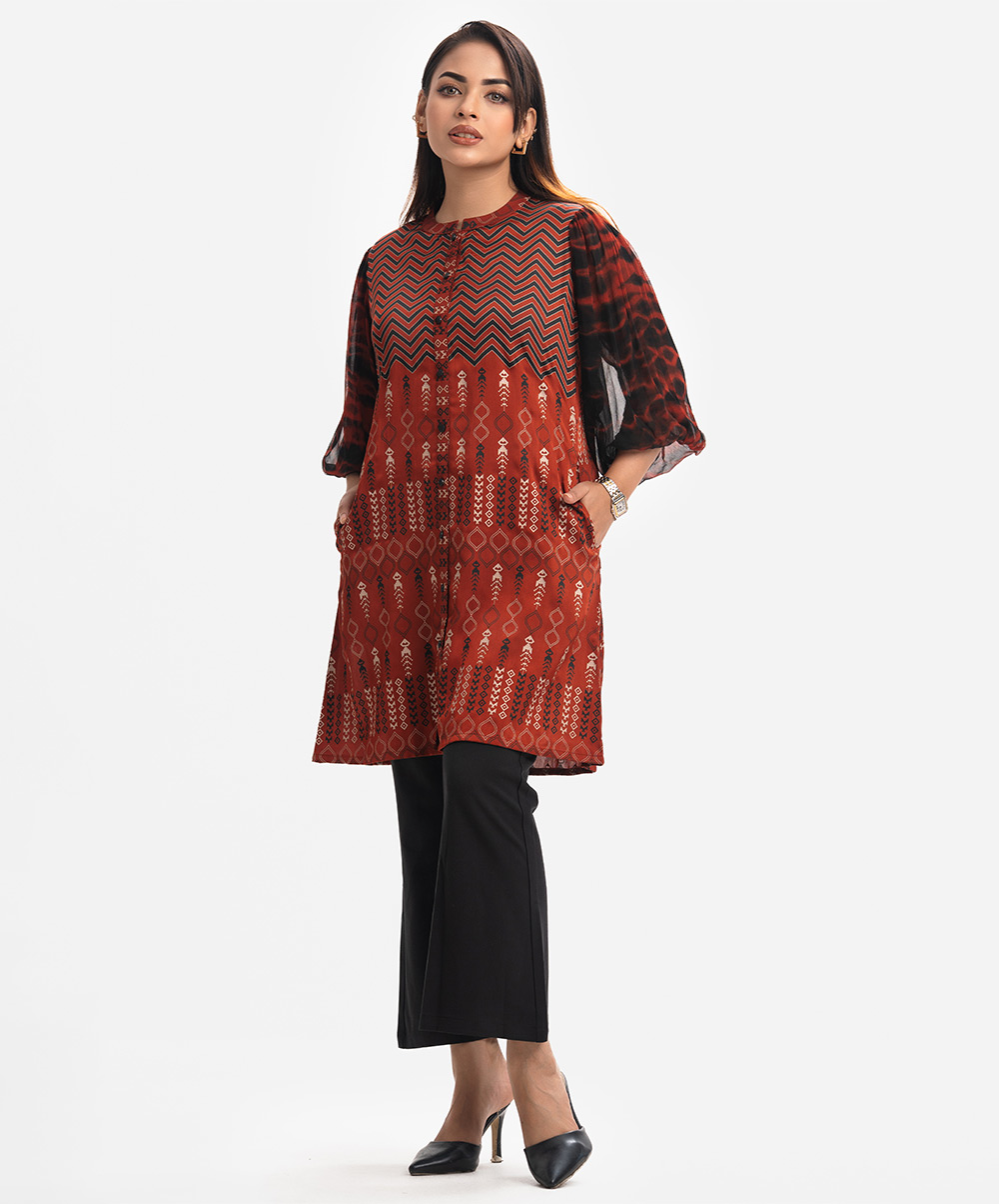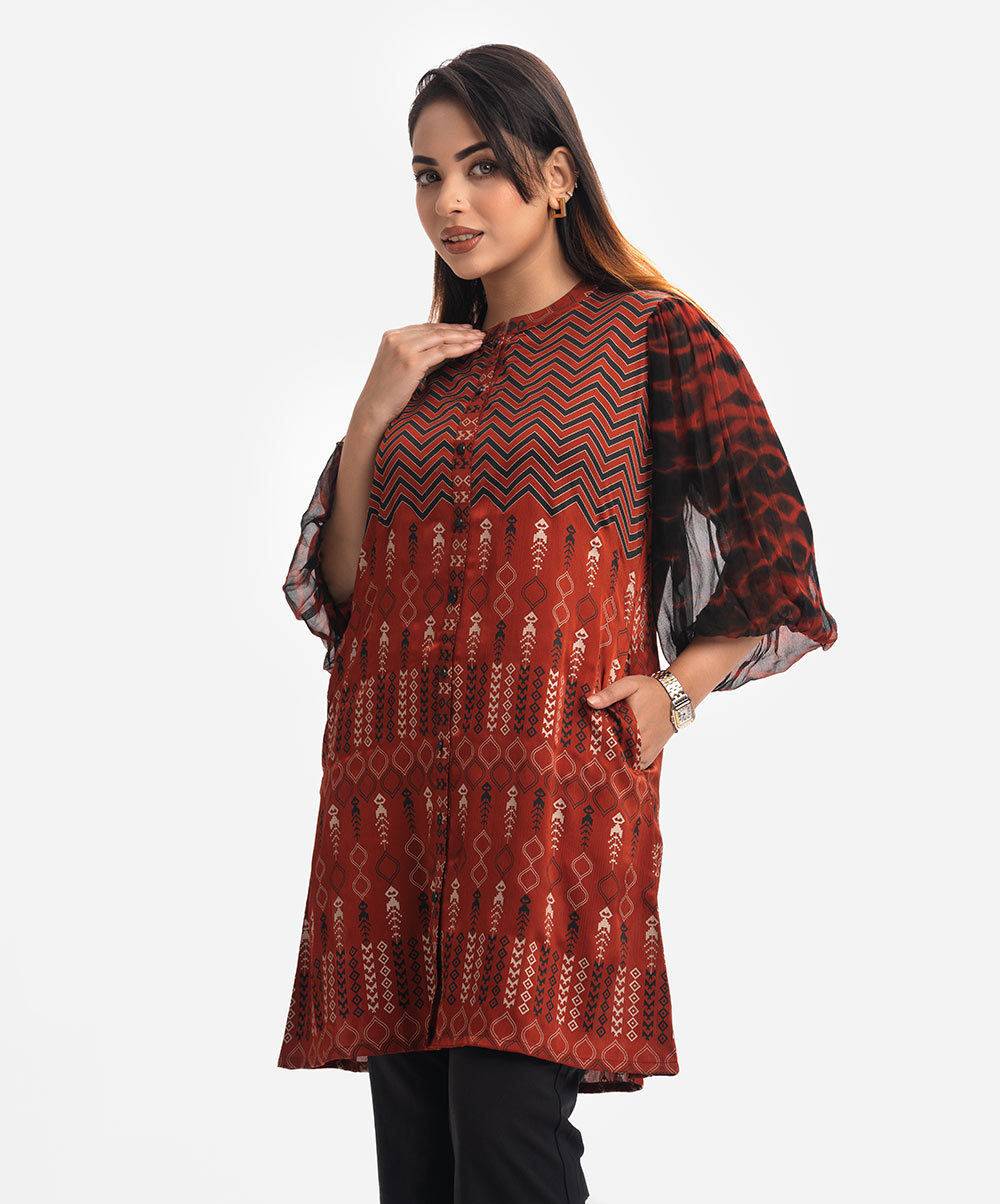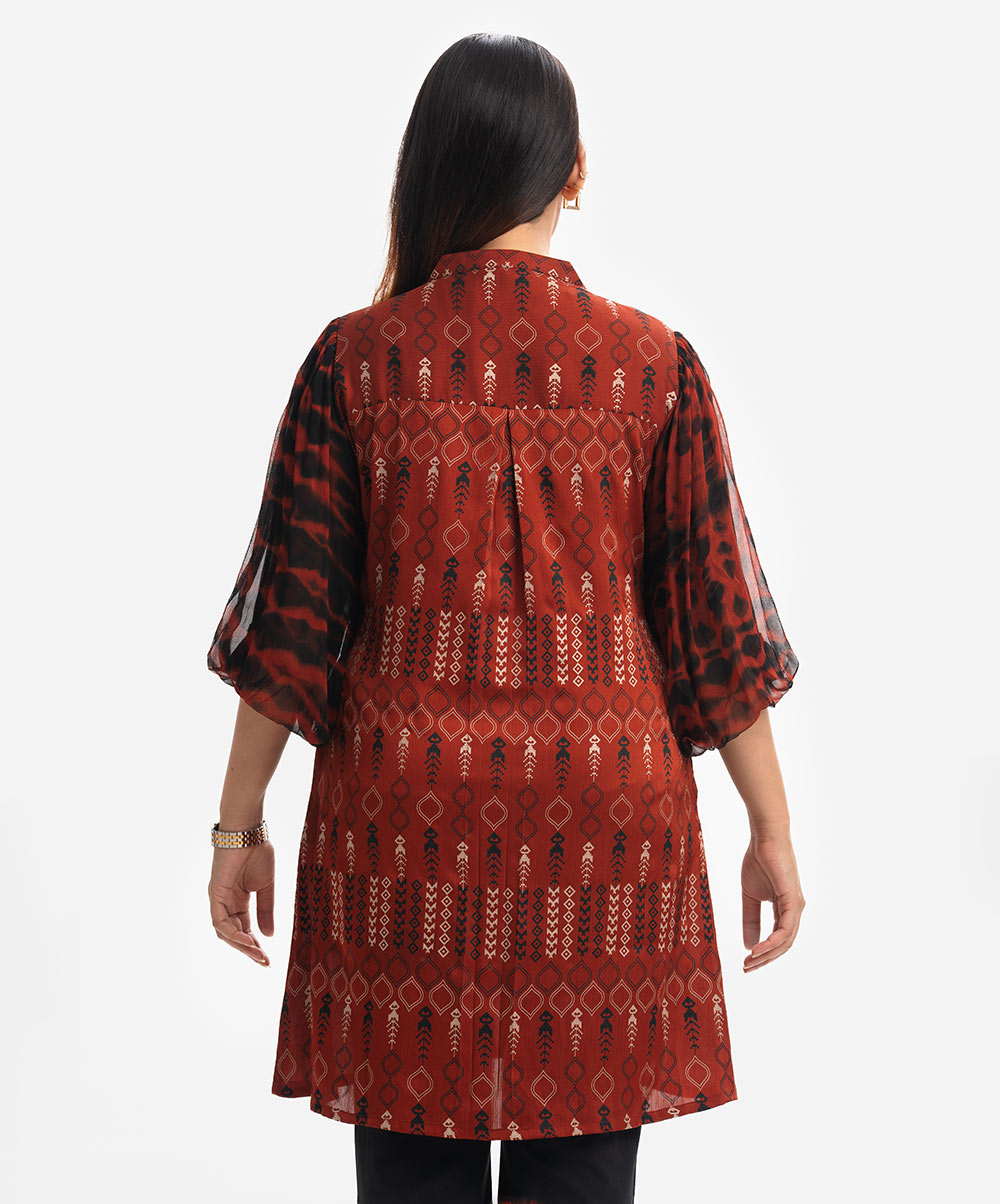 Band collar A-line tunic in soft georgette fabric. Balloon puff tie-dye sleeves, inseam side pockets.