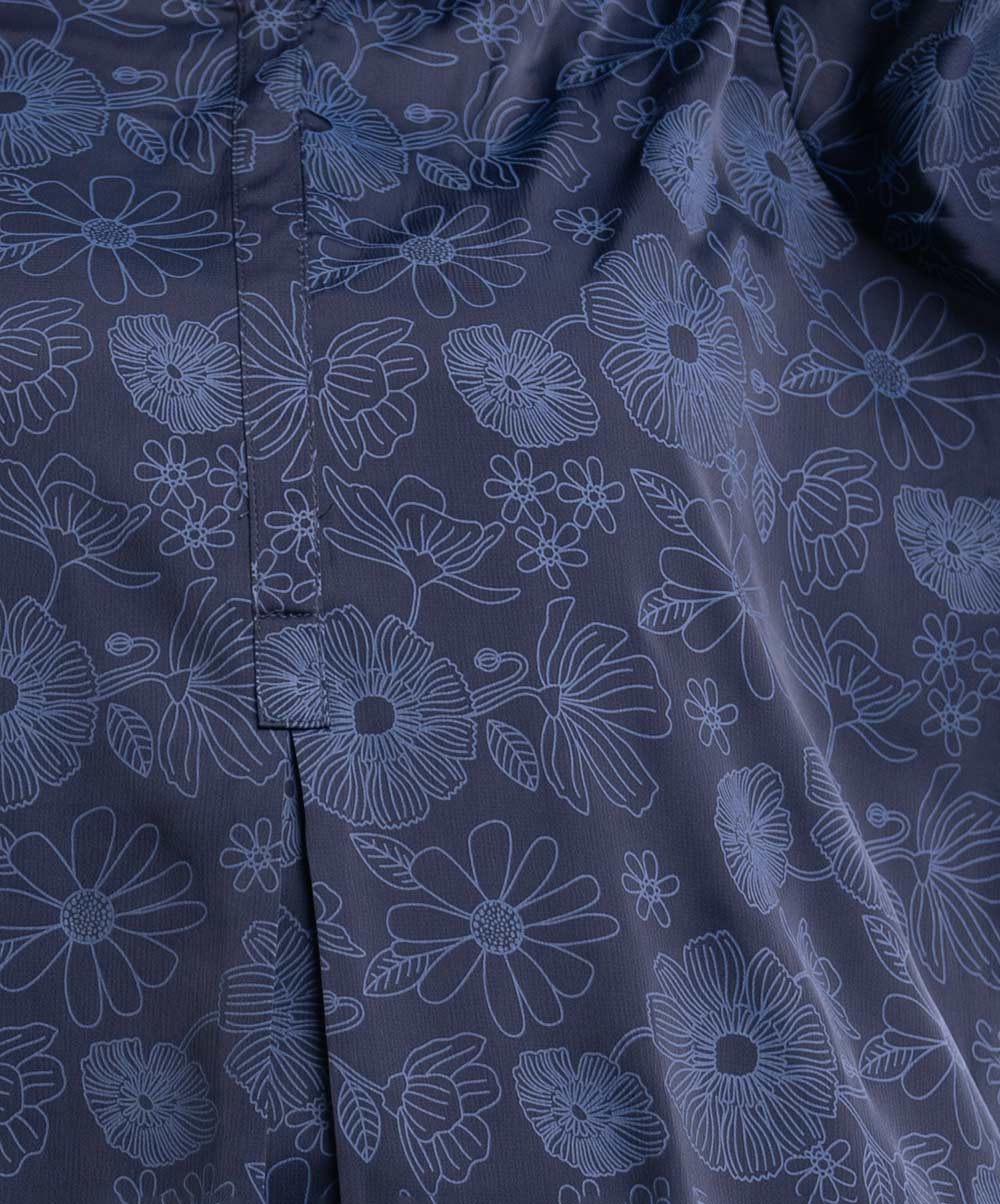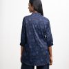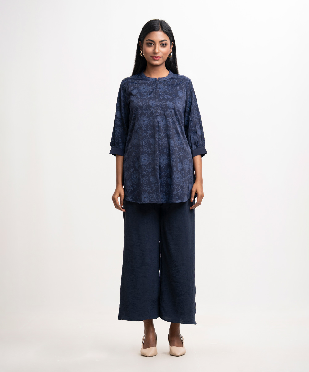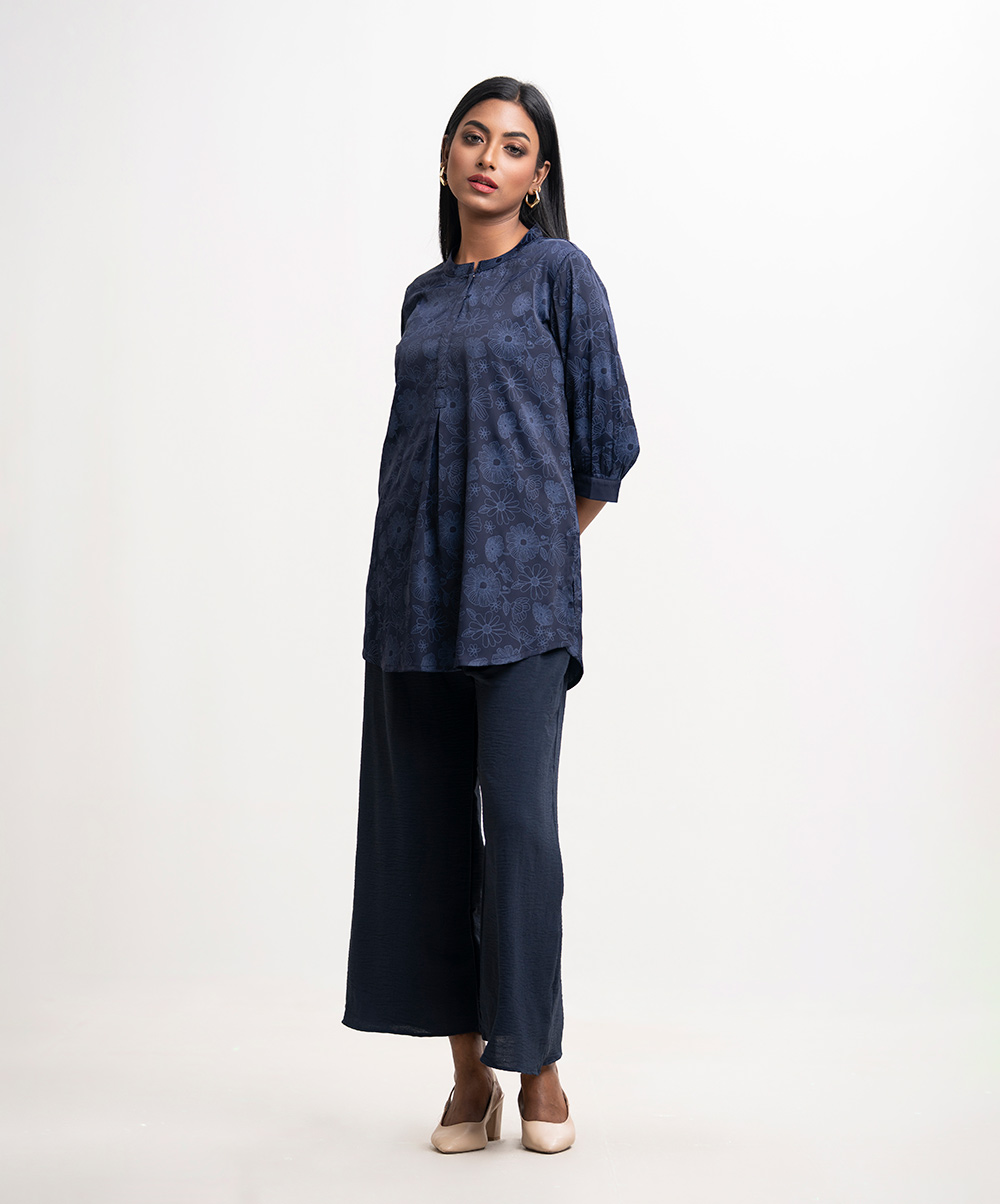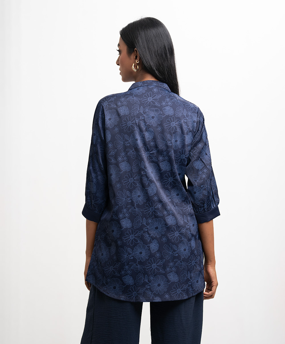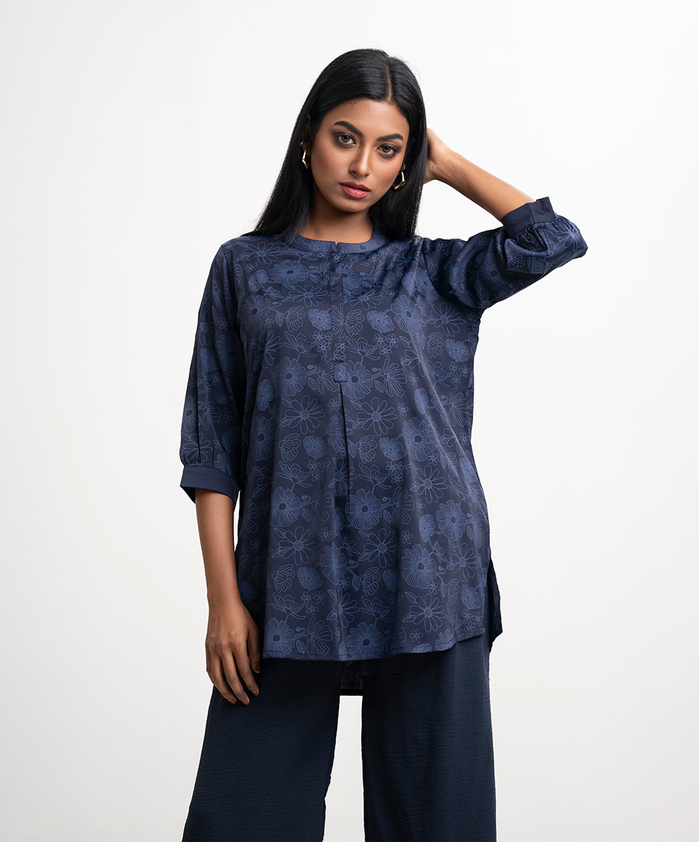 Stand collar shirt-style tunic in joom fabric. Three-quarter sleeves.