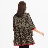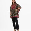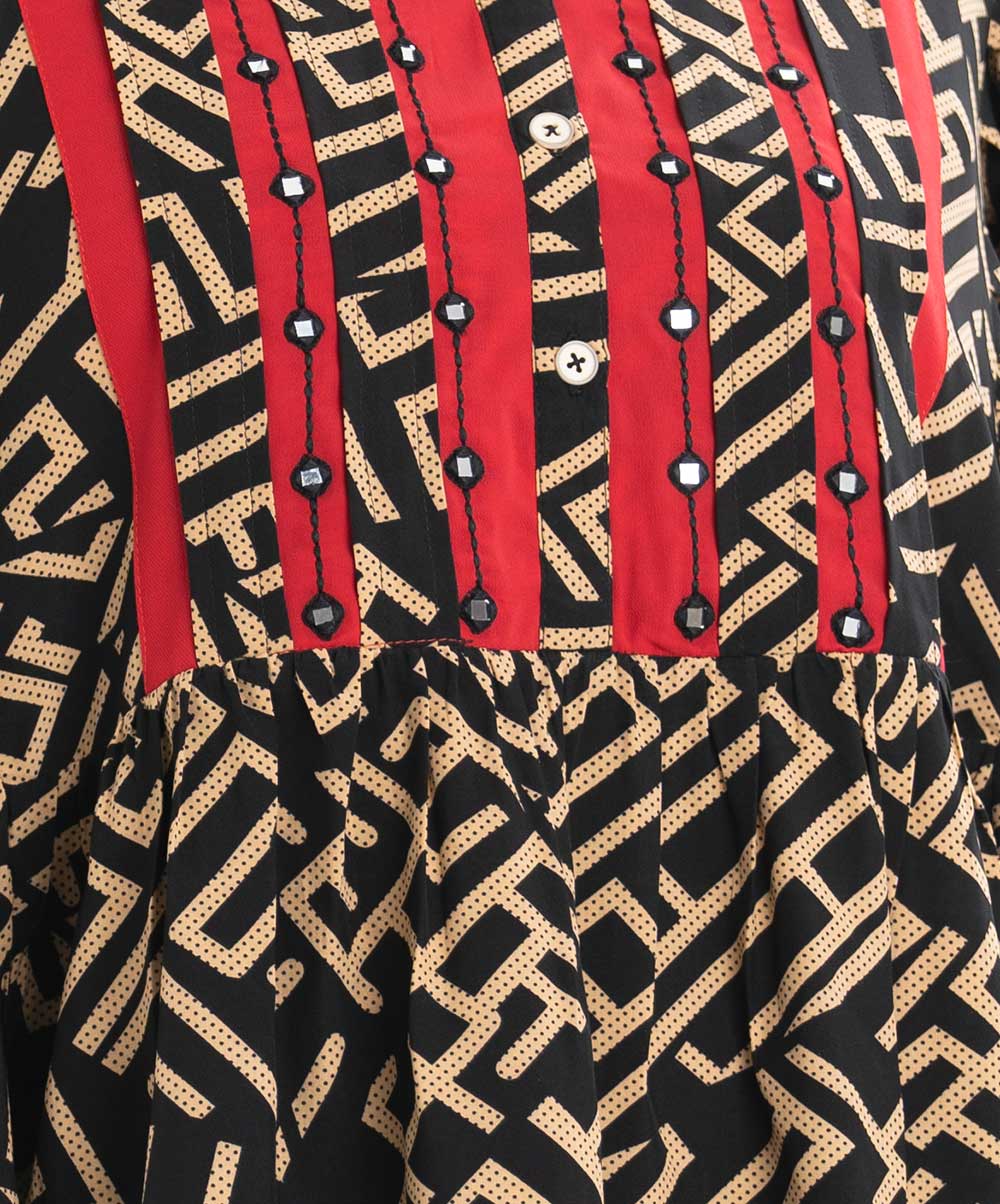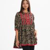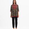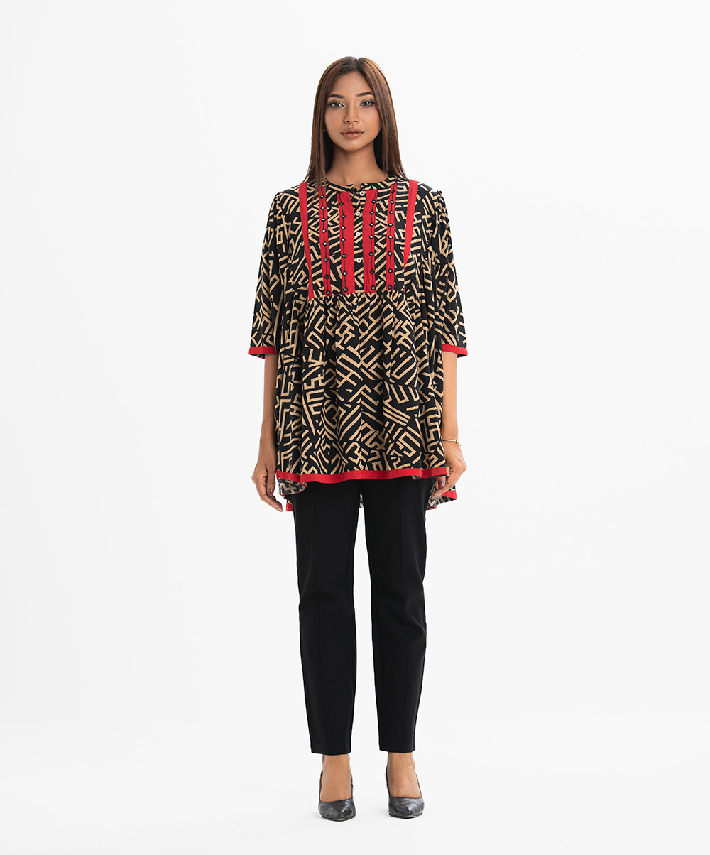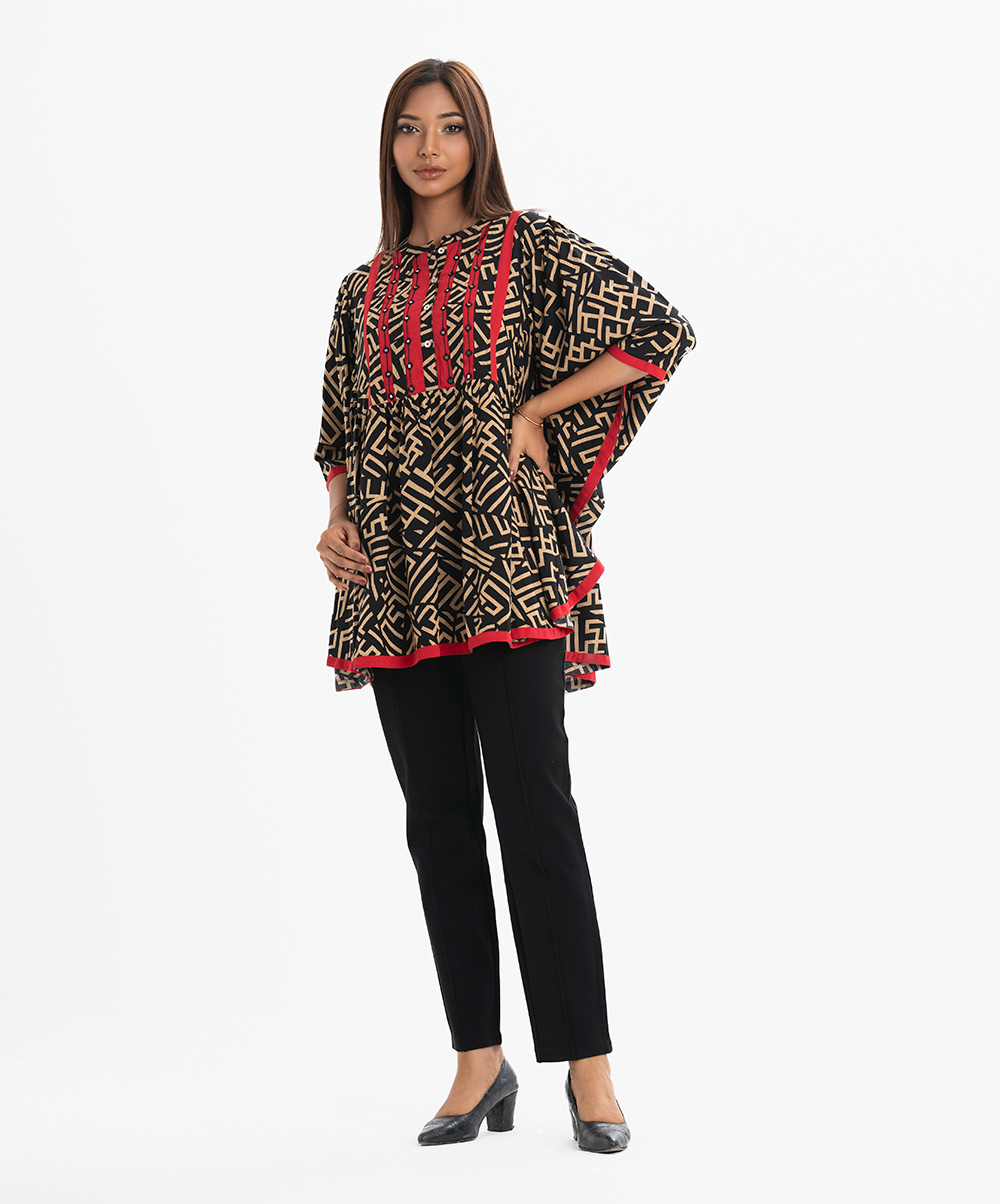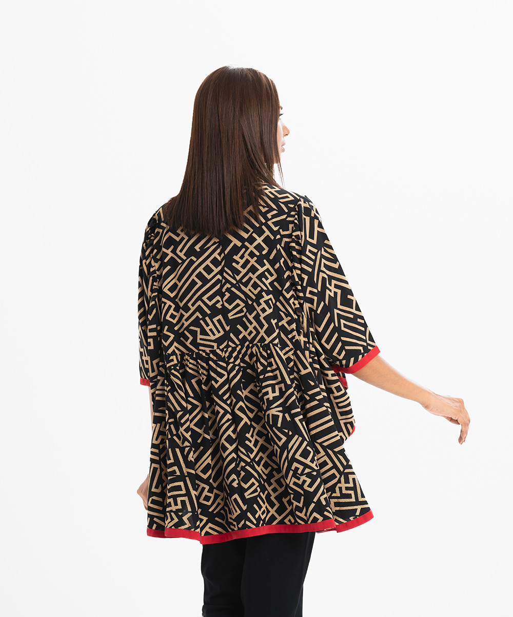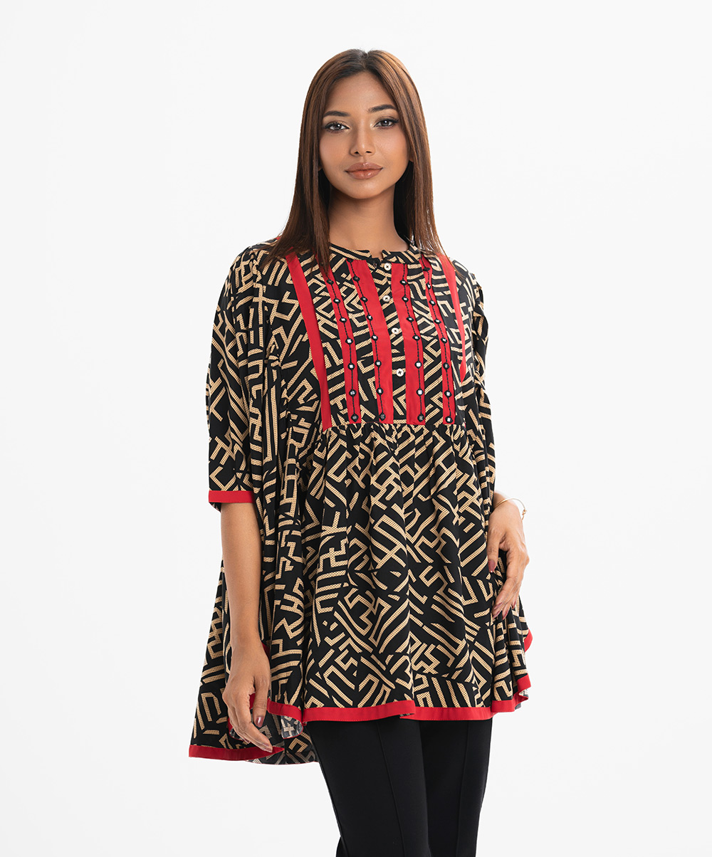 Women’s abaya style tunic in printed georgette fabric. Stand collar with buttons placket. Karchupi at front.