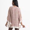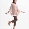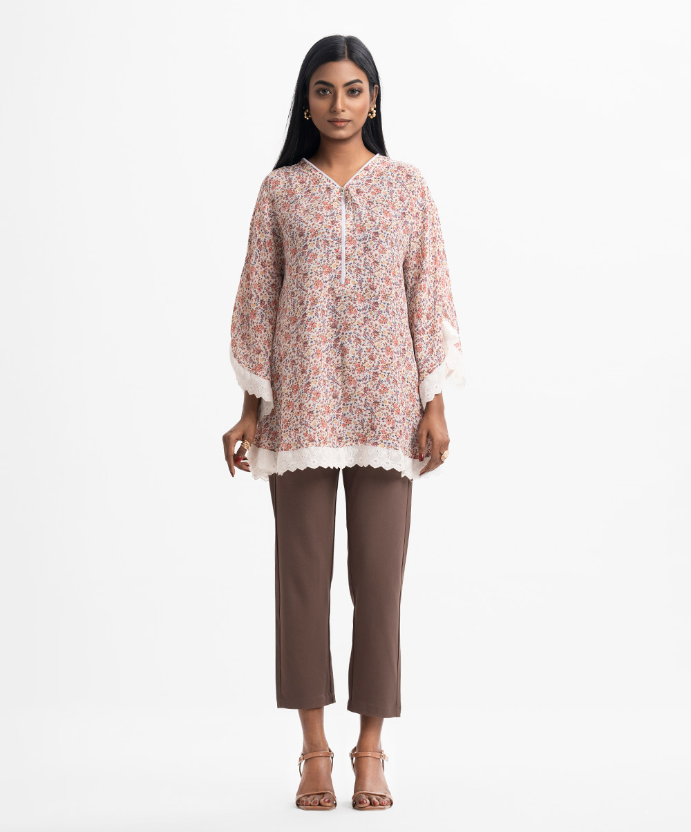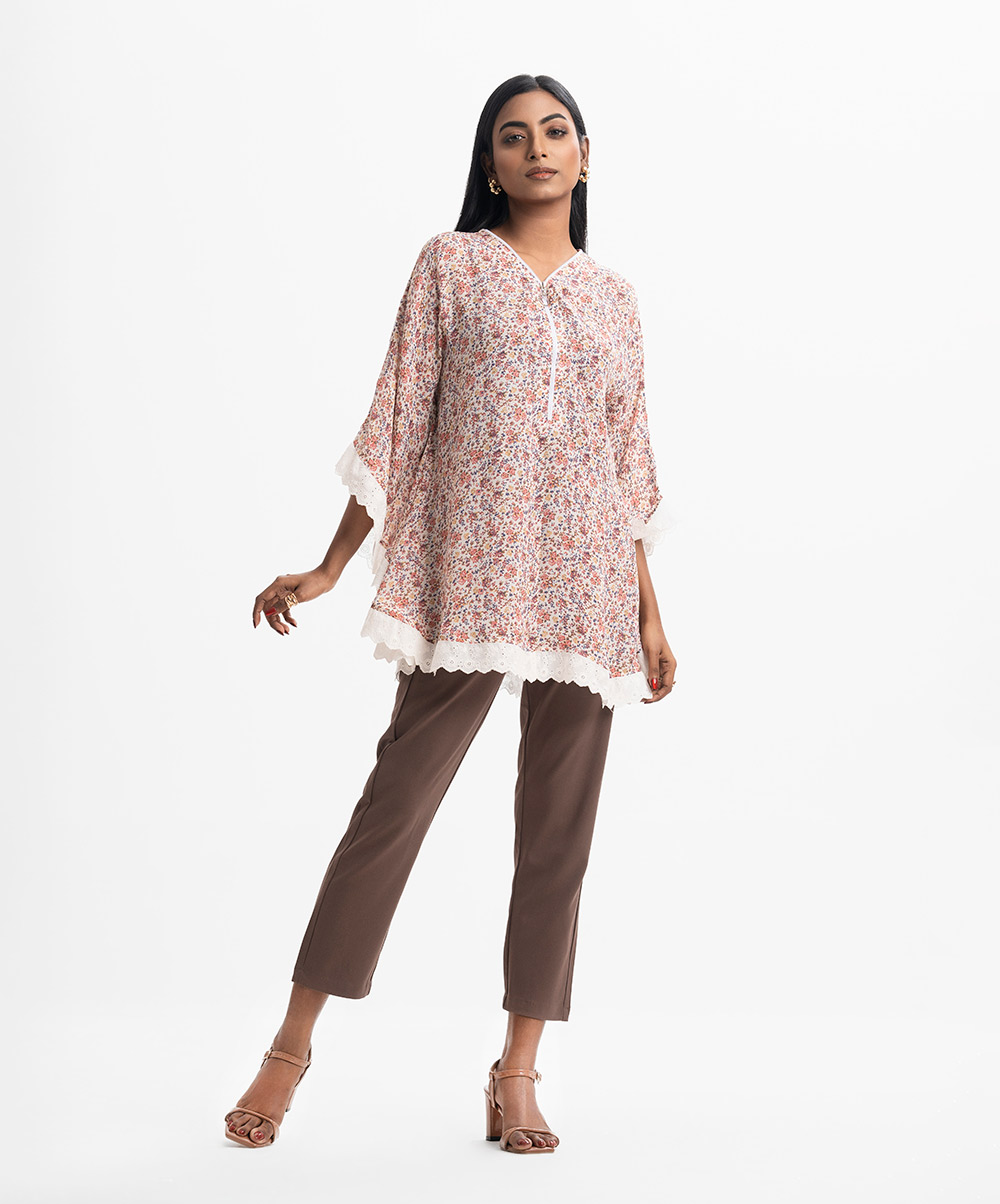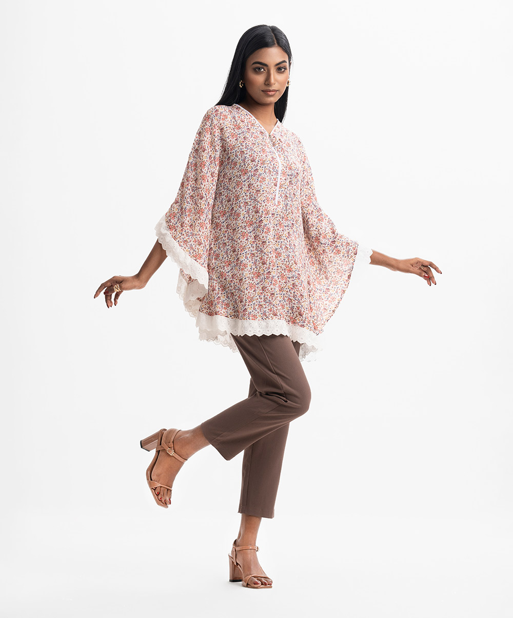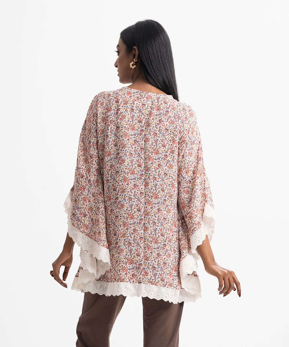 V-neck zipper close cape in georgette fabric. White lace attached on the borders.