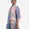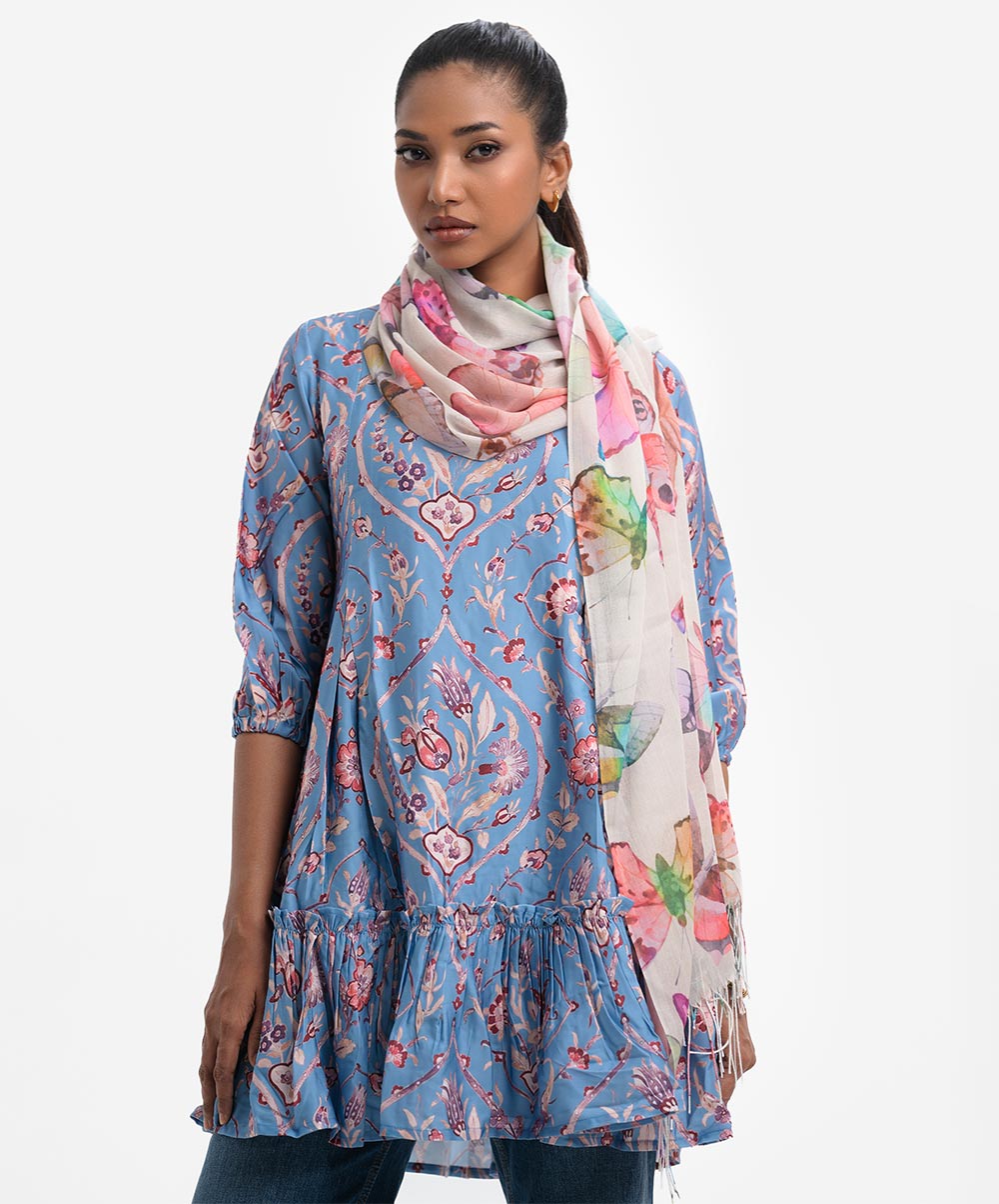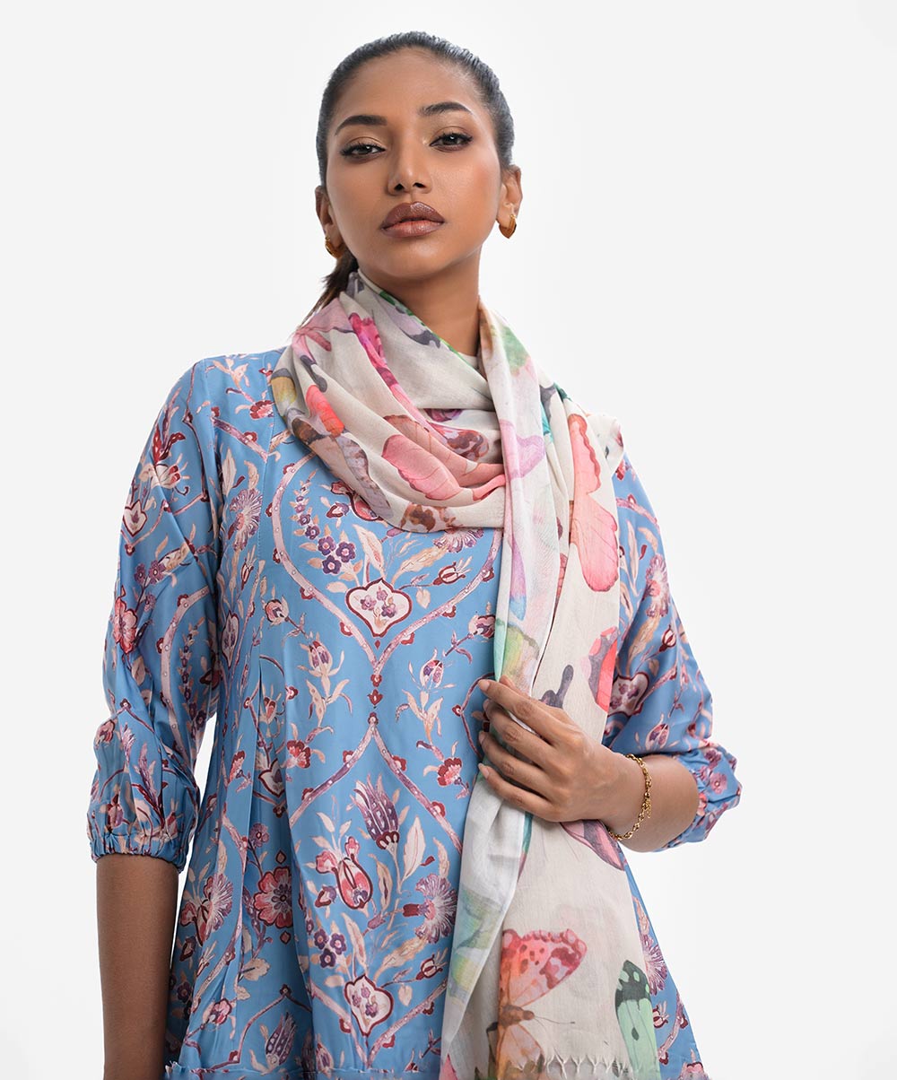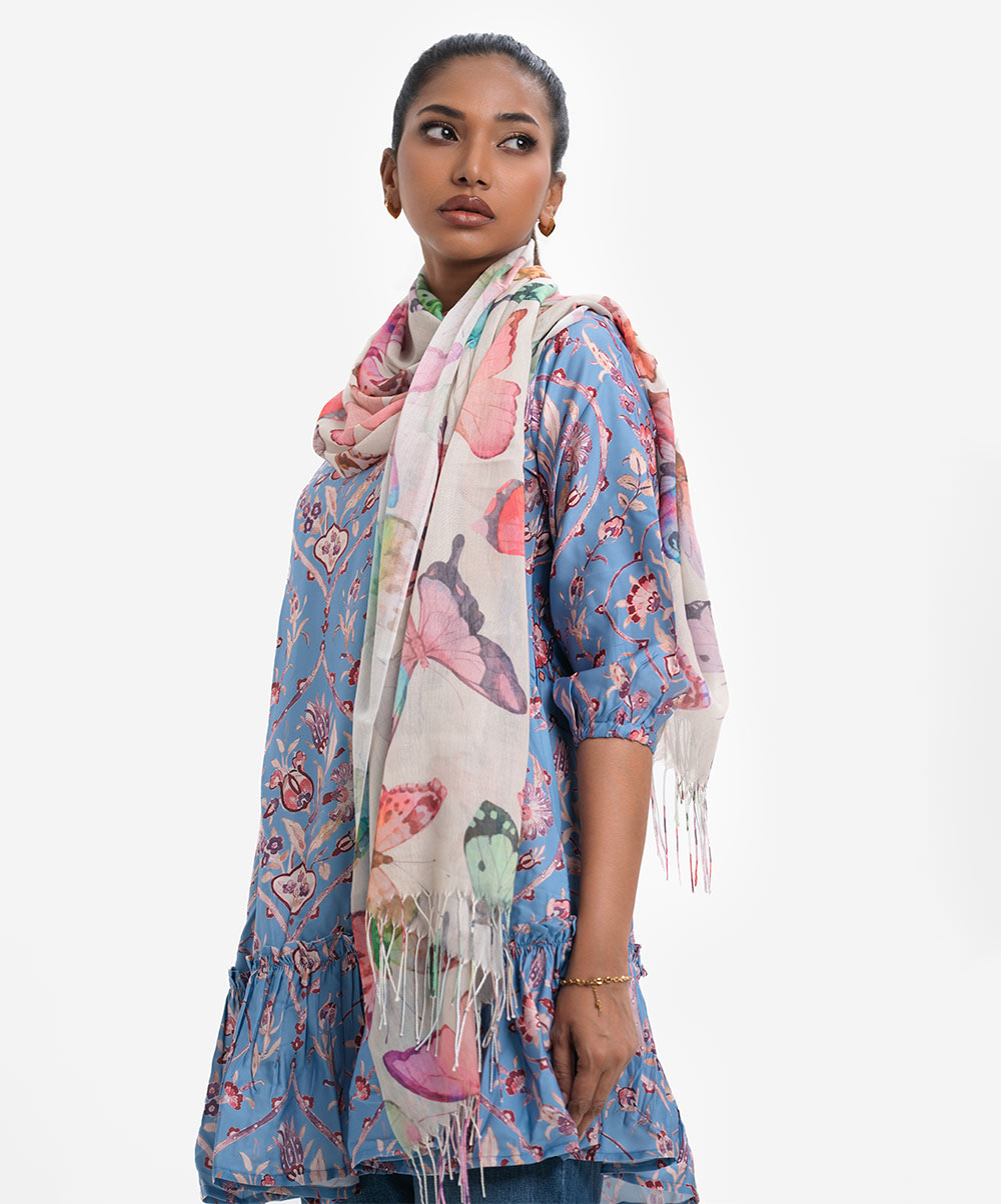 Women’s butterfly printed scarf in blended cotton fabric. Fringe trim at the border.