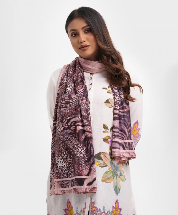 Multi-color long rectangle scarf in stretchable blended fabric.