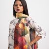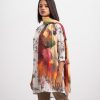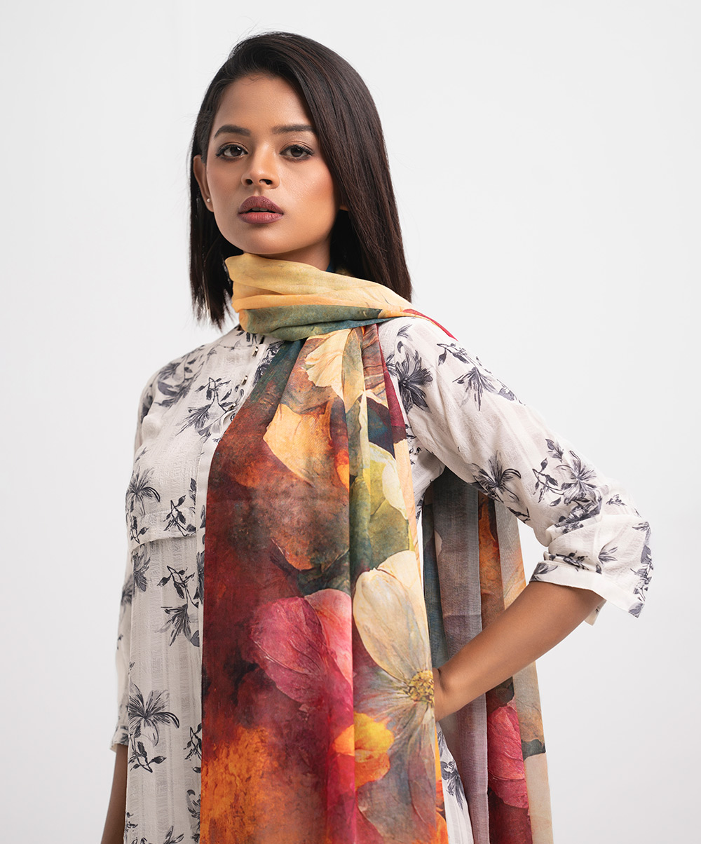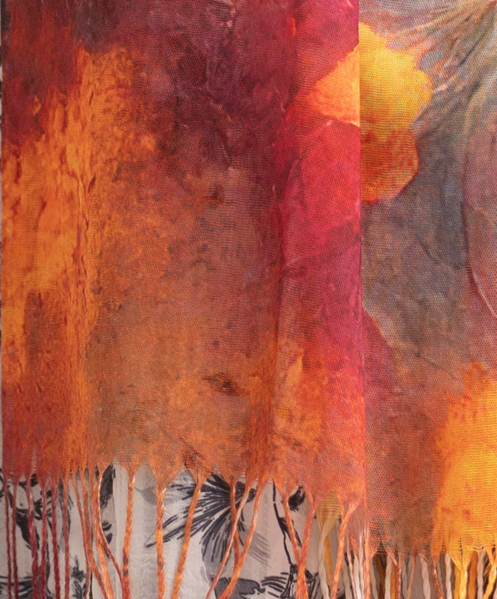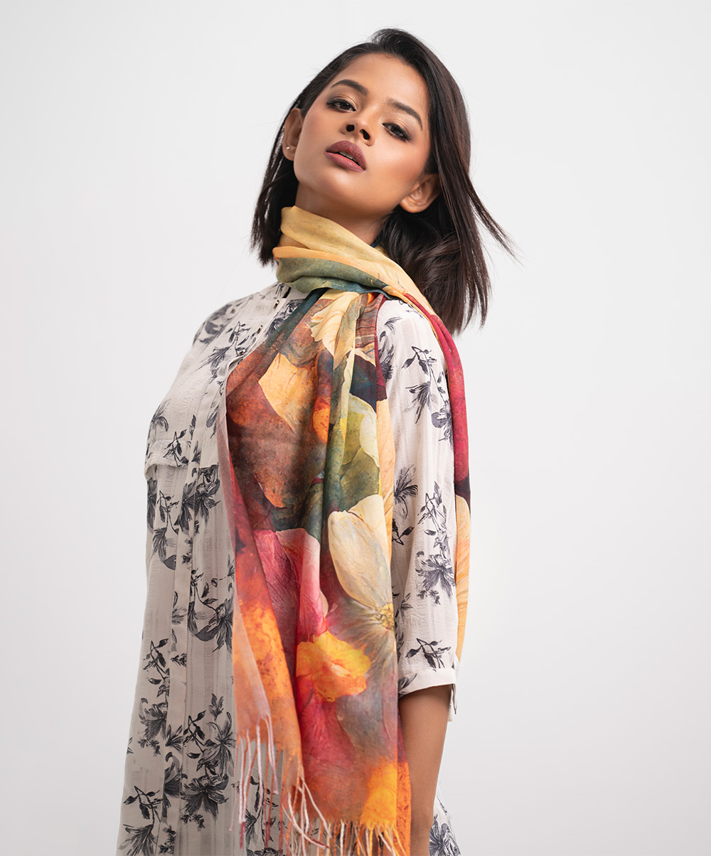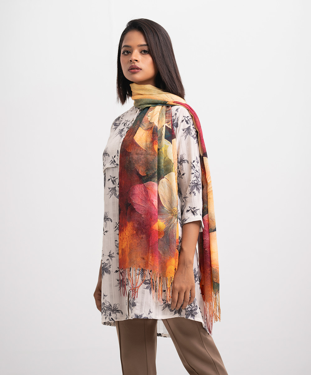 Women’s printed scarf in blended cotton fabric. Fringe trim at the border.