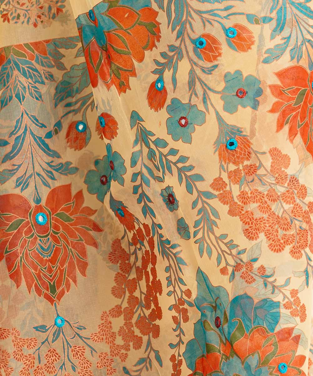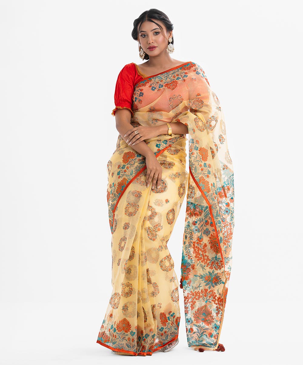 Women’s printed exclusive saree in muslin fabric. All over karchupi with beautiful tassels.