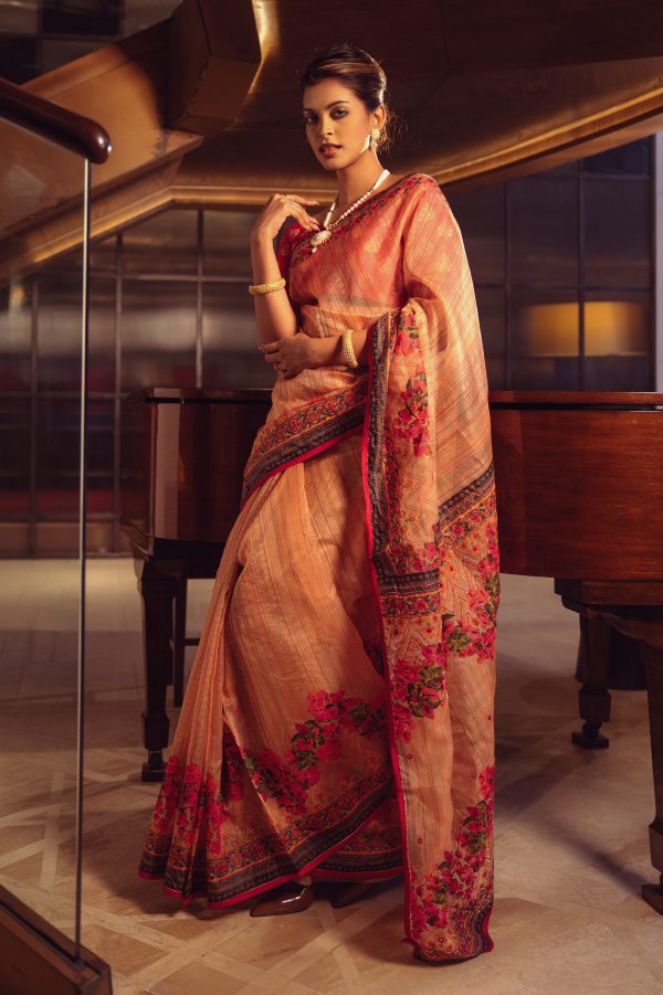 Women’s exclusive printed saree in muslin fabric. Heavy Karchupi at achal, patchwork at the border and added tassels.