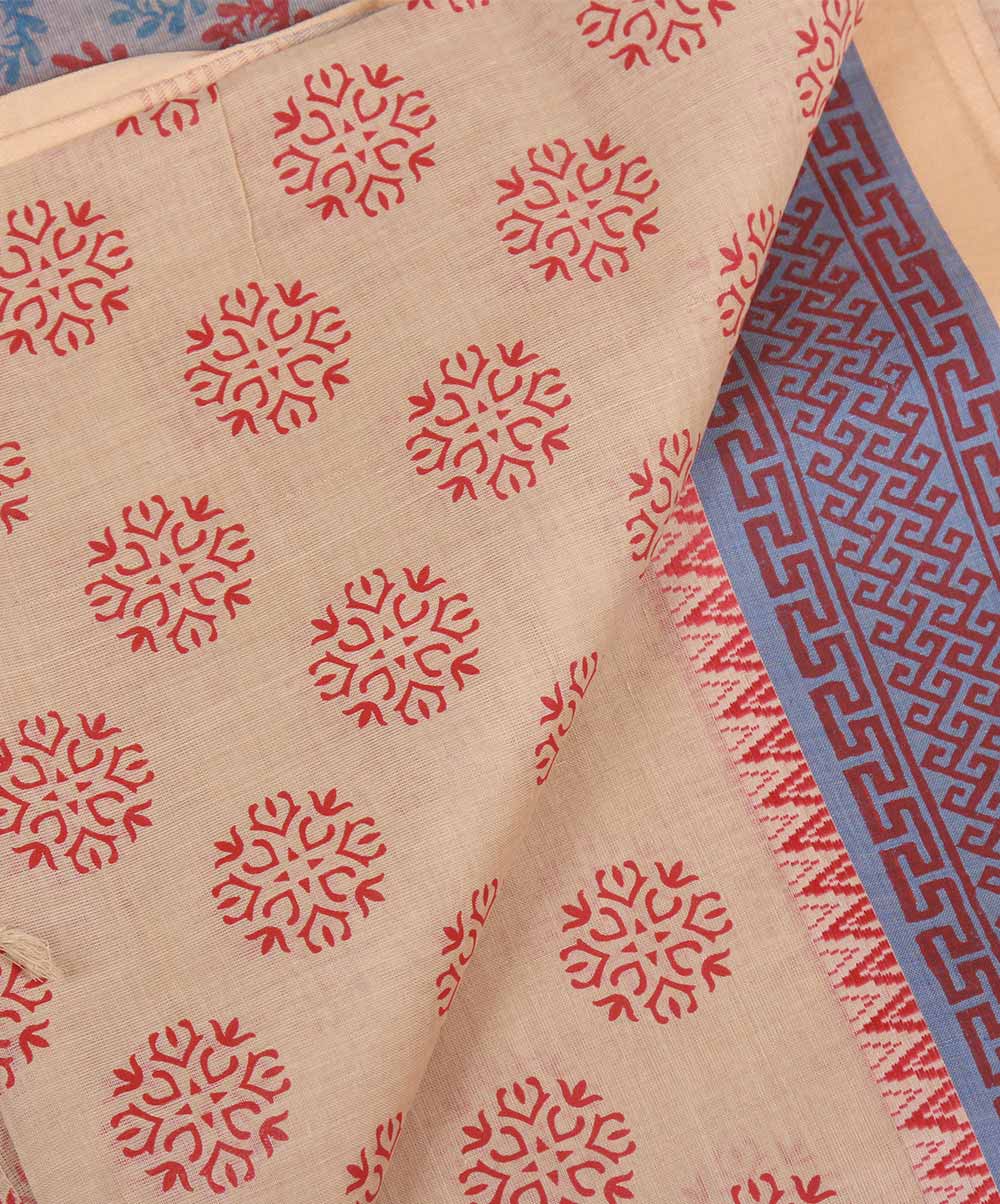 Light brown cotton saree with allover block print and embroidery on anchal.