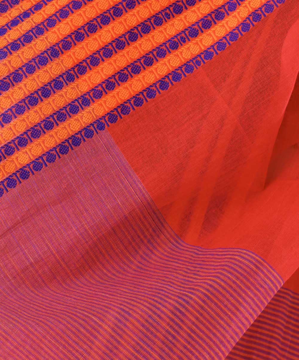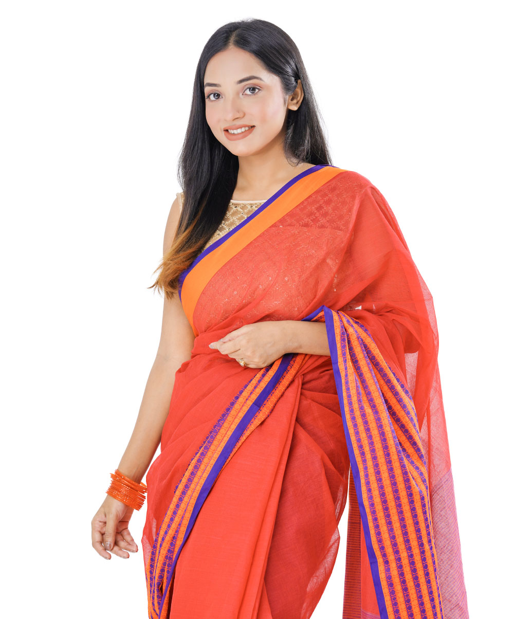 Red Cotton Saree with contrast orange and blue thread woven paar.
