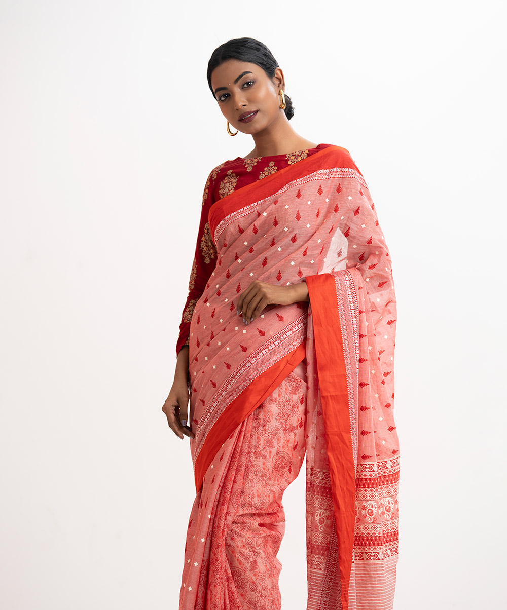 All-over printing details saree in cotton fabric. Karchupi & tassels at the Aanchal.