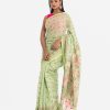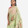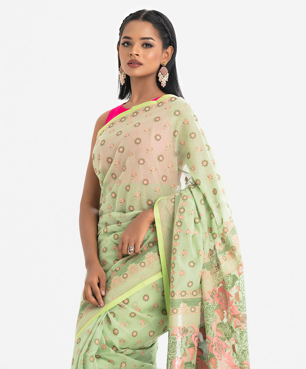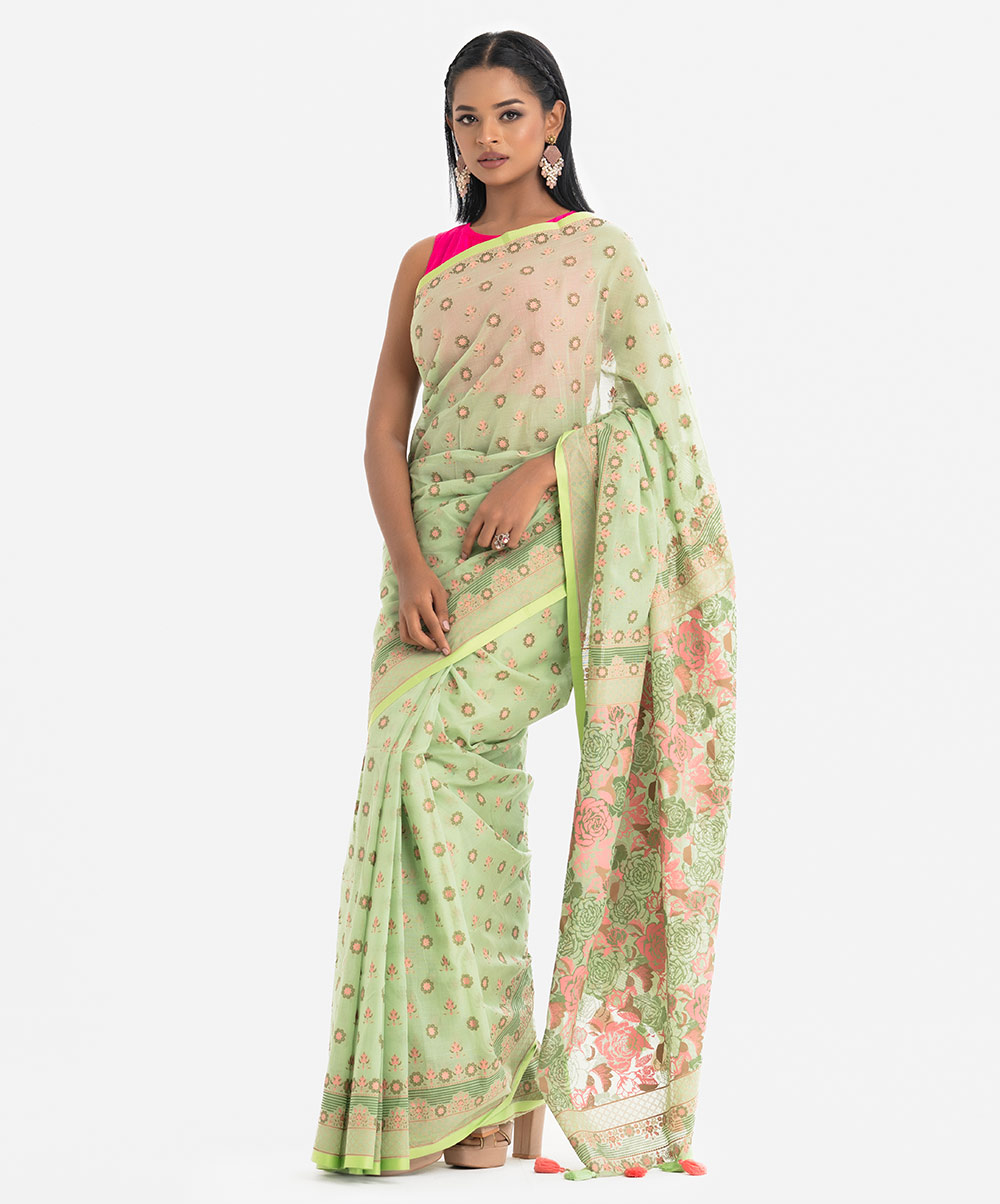 Women’s ethnic themed cotton saree with weaving details and tassel tie.