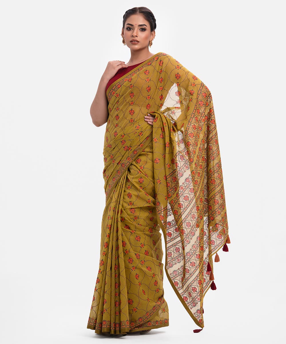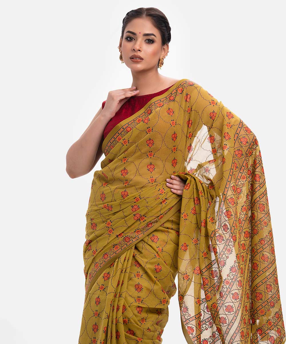 Women’s printed cotton saree with weaving details.