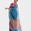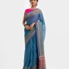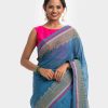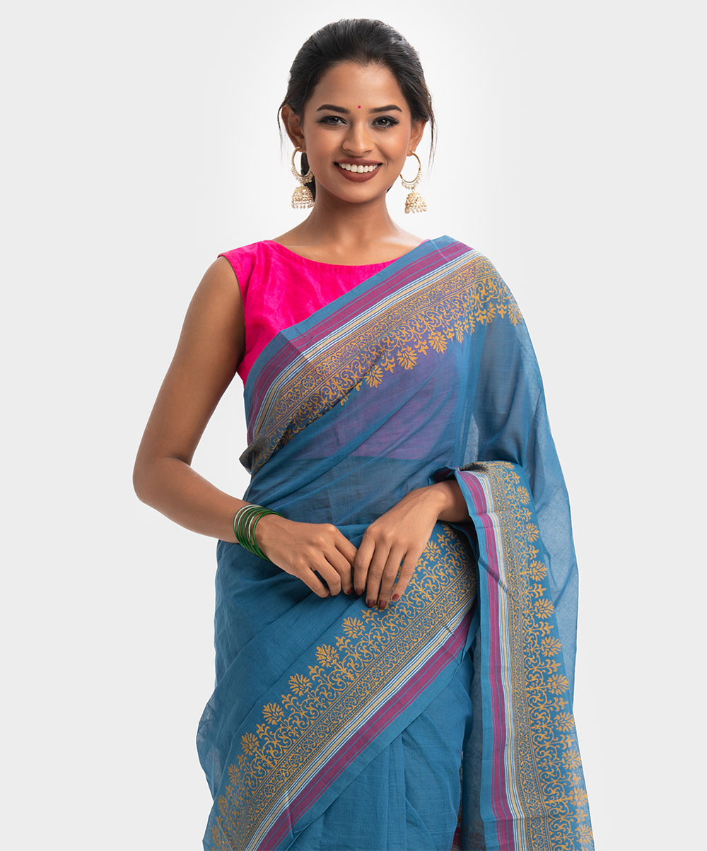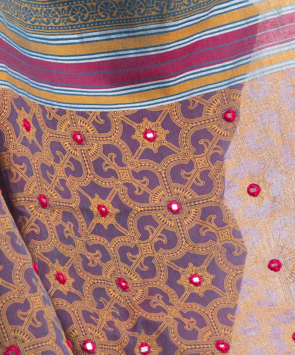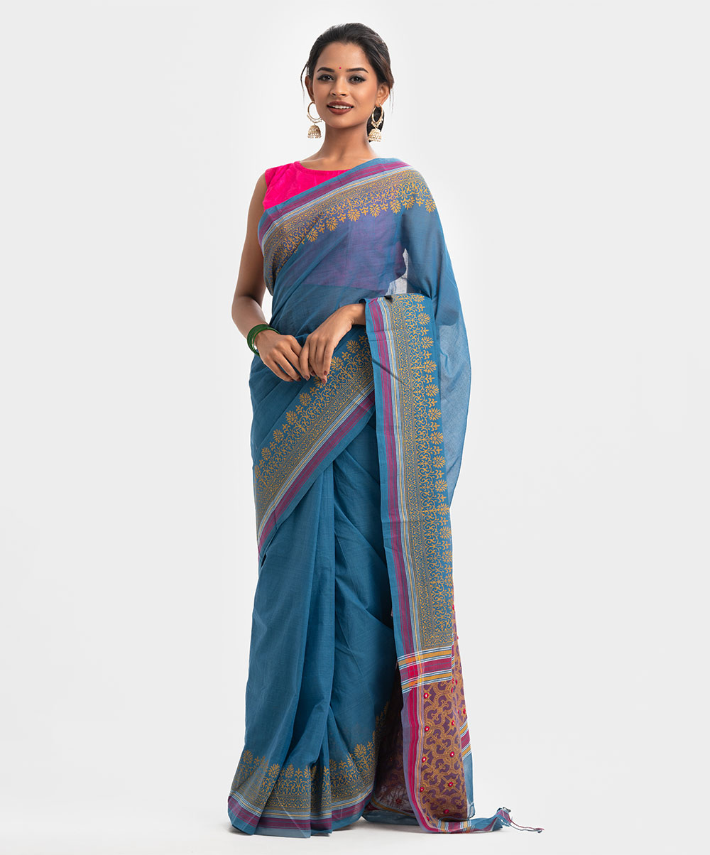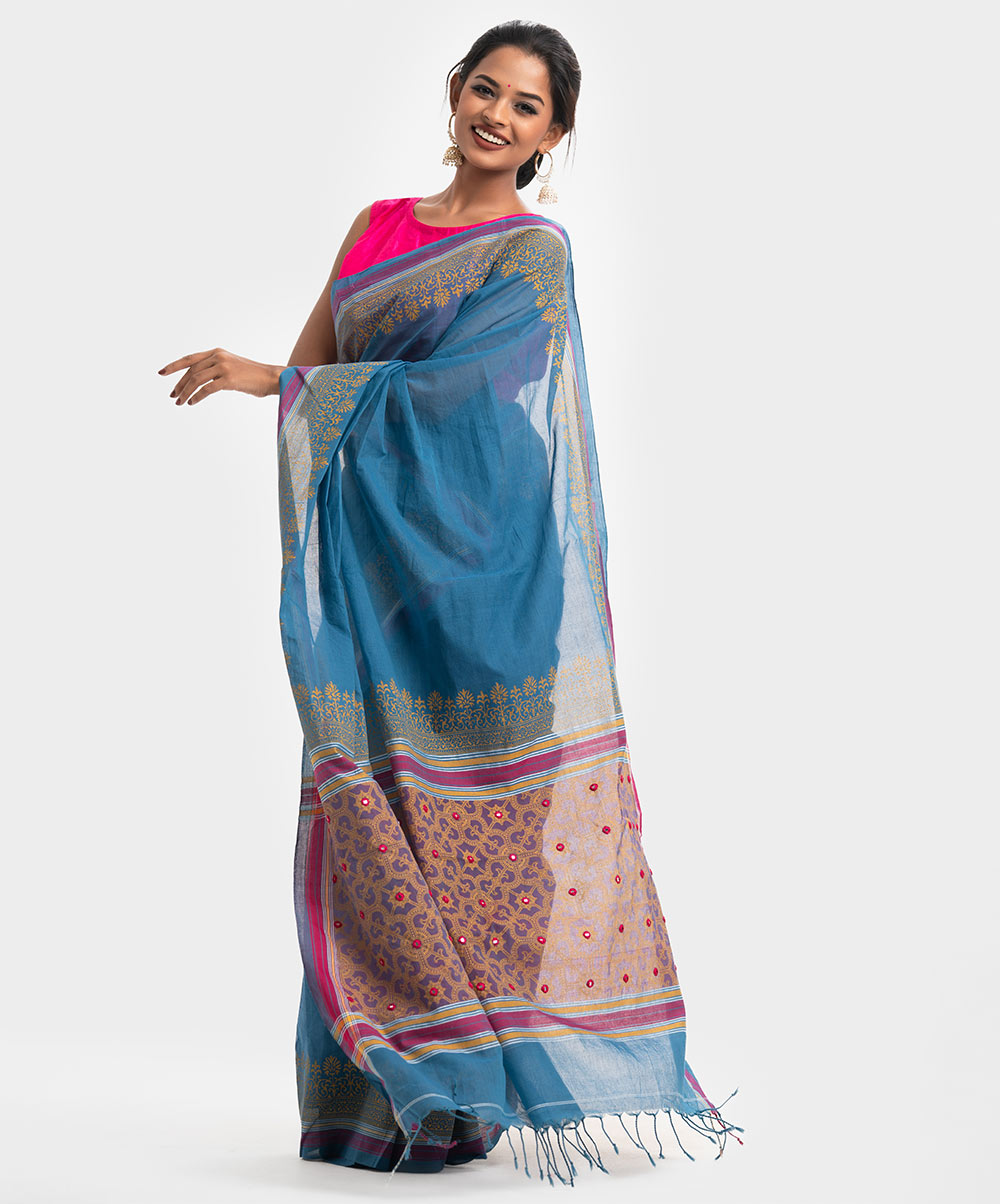 Women’s printed Saree in cotton fabric. Embellished with karchupi and fringe trim at the border of Aanchal.