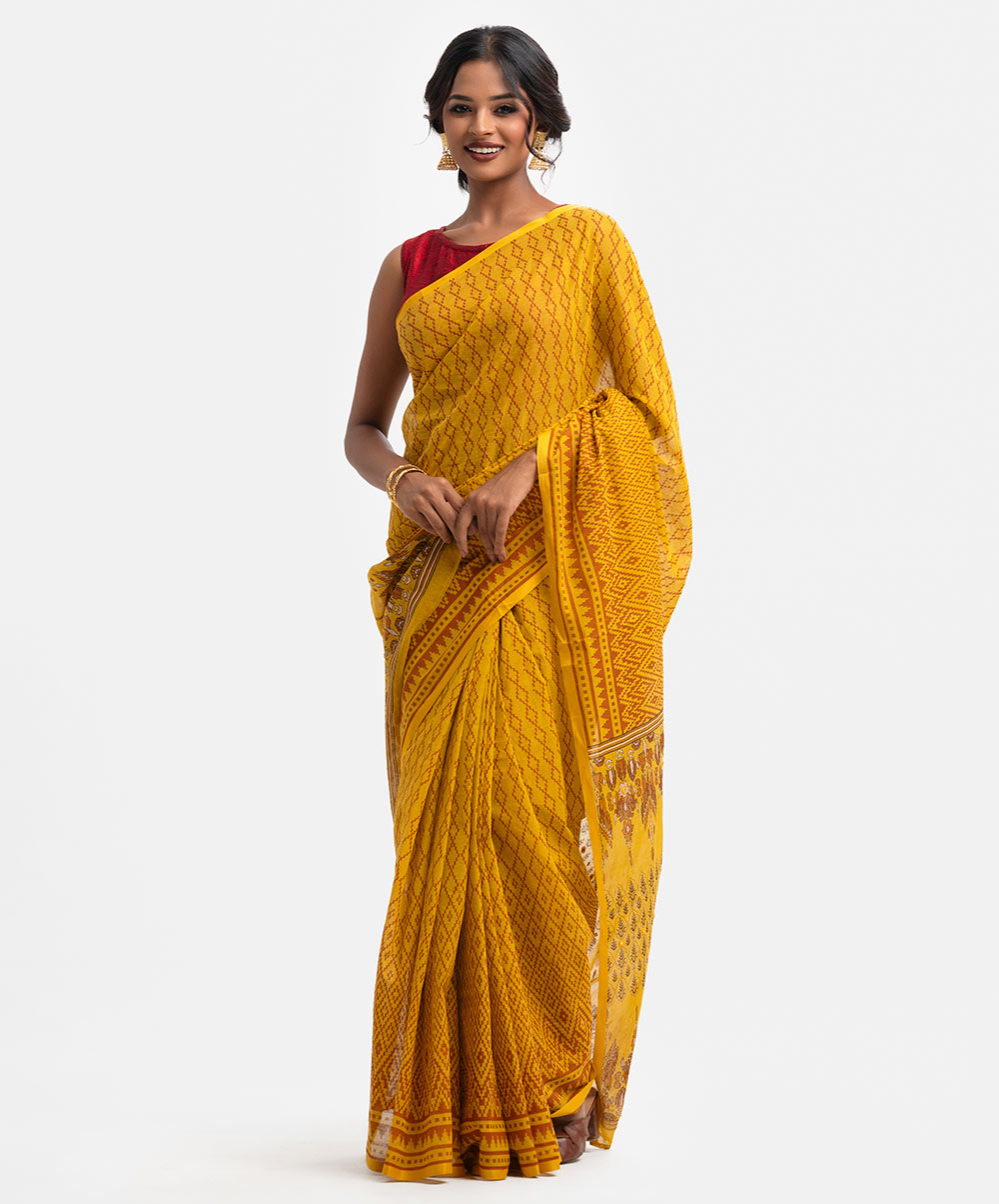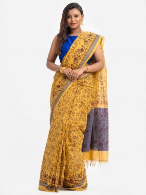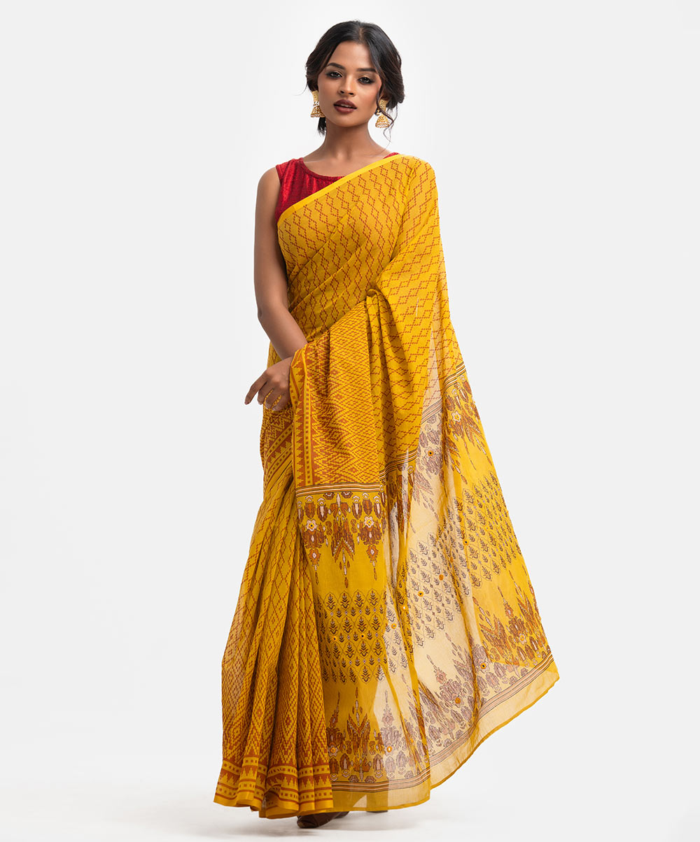 Women’s all-over printed Saree in Cotton fabric. Comes with karchupi at the Aanchal.