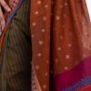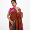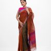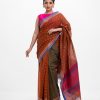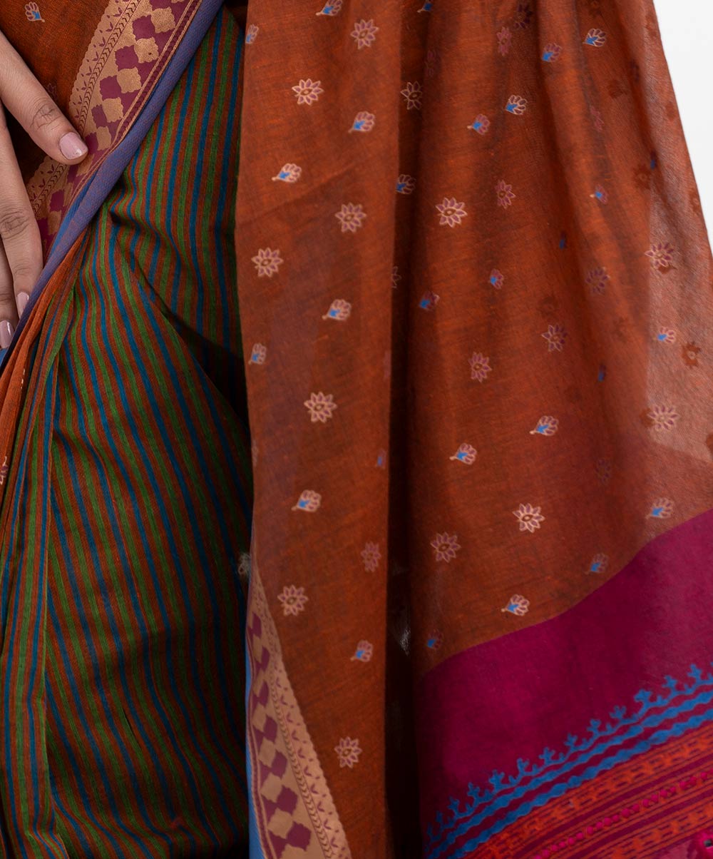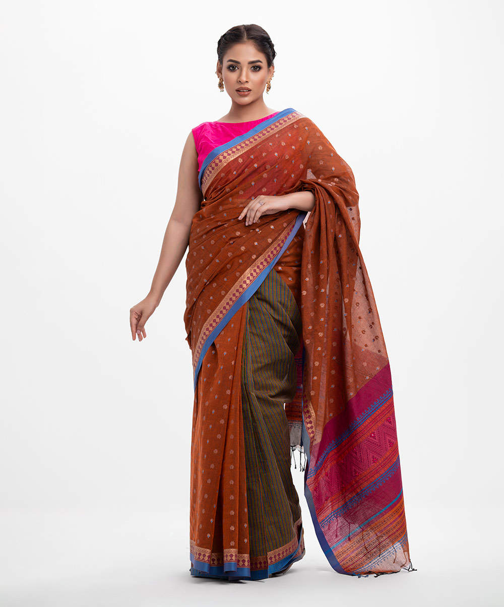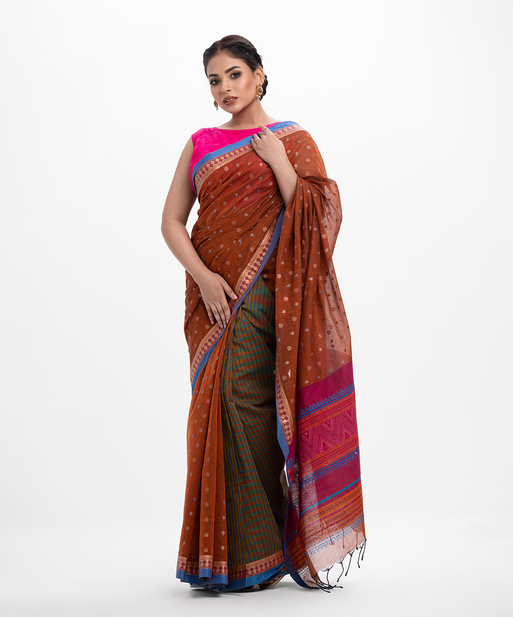 Women’s printed Saree in cotton fabric. Embellished with embroidery and fringe trim at the border of Aanchal.