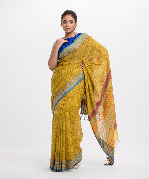 Women’s printed Saree in cotton fabric. Embellished with karchupi and fringe trim at the border of Aanchal.