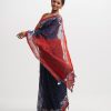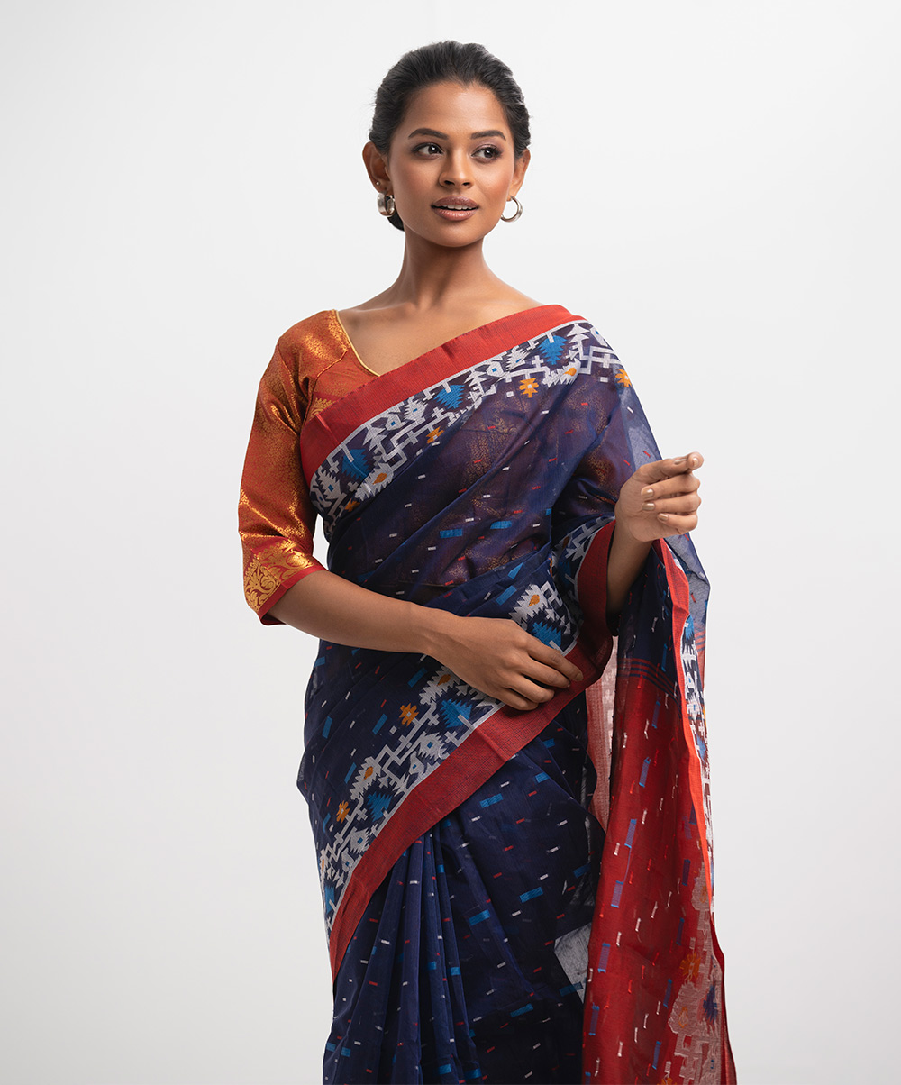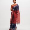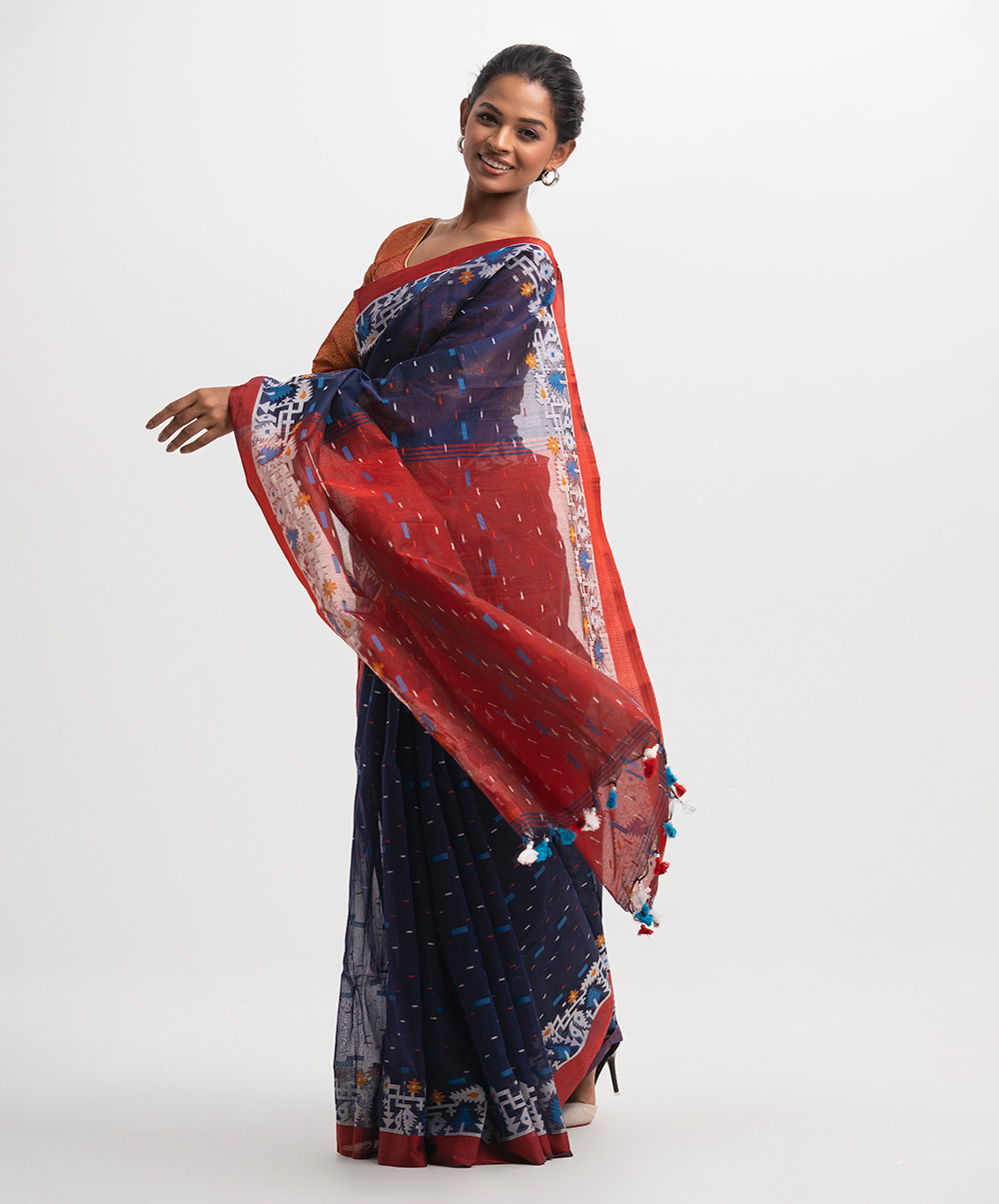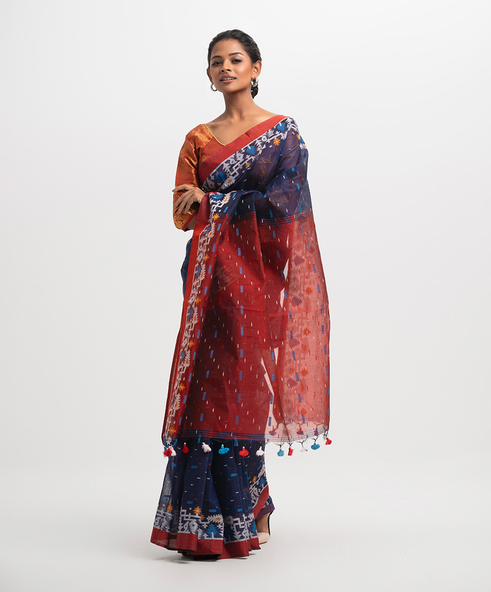 All-over weaving details saree in half-silk fabric. Fringe trim at the border of Aanchal.