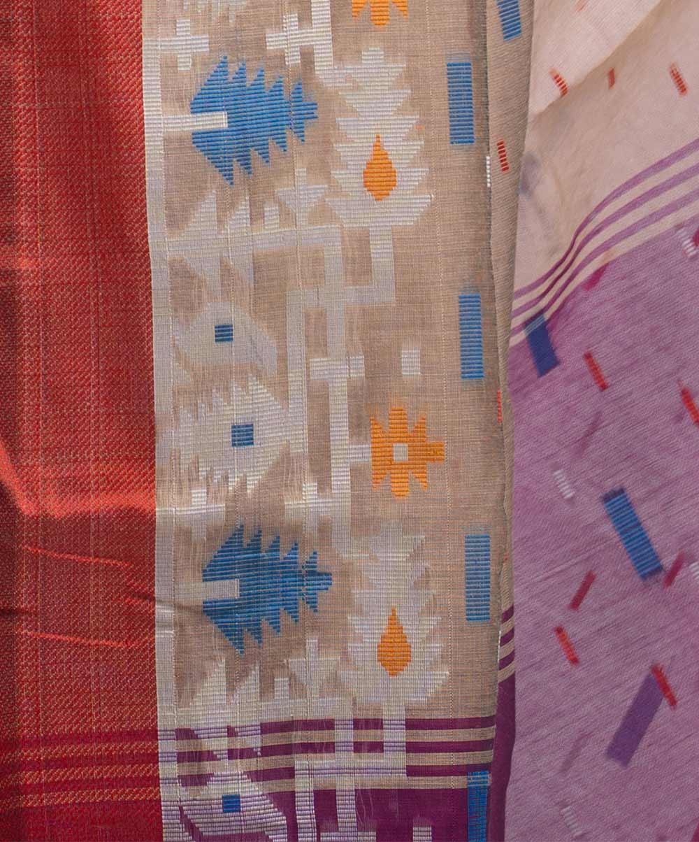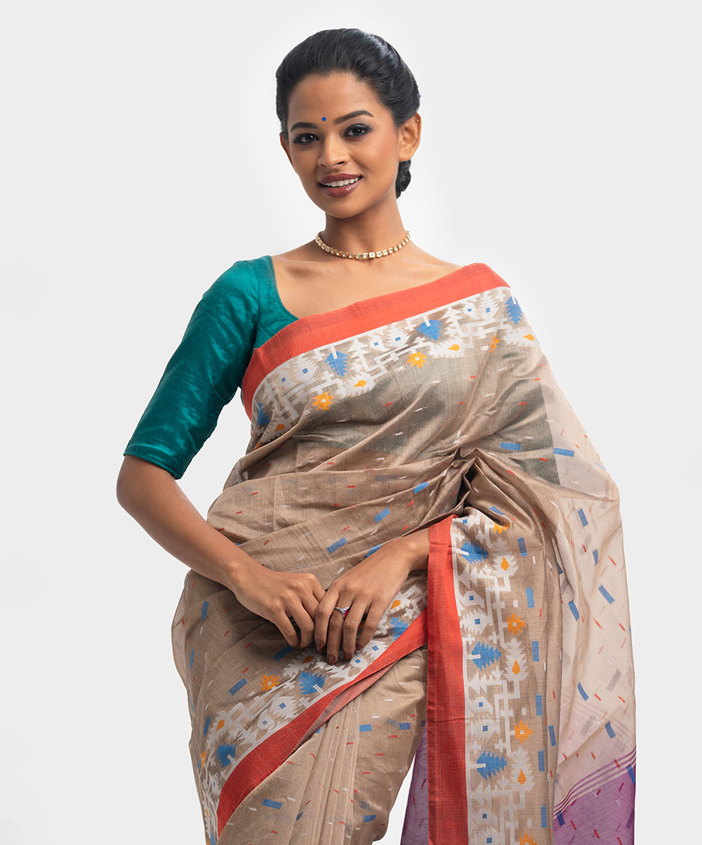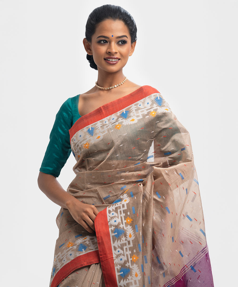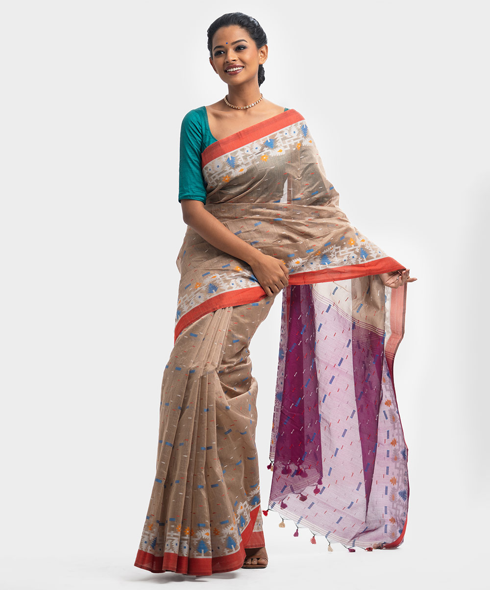 All-over weaving details saree in half-silk fabric. Tassels at the border of Aanchal.