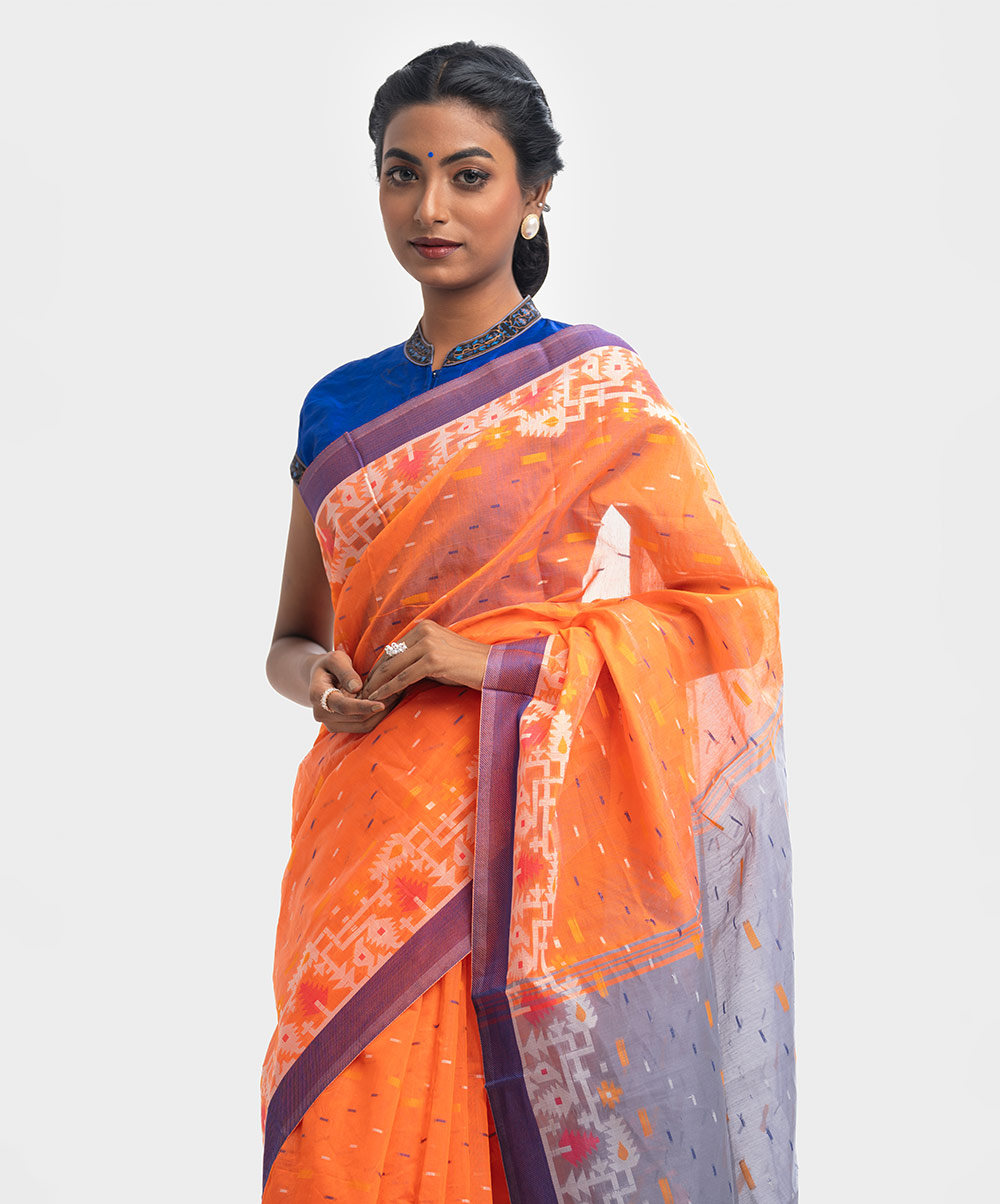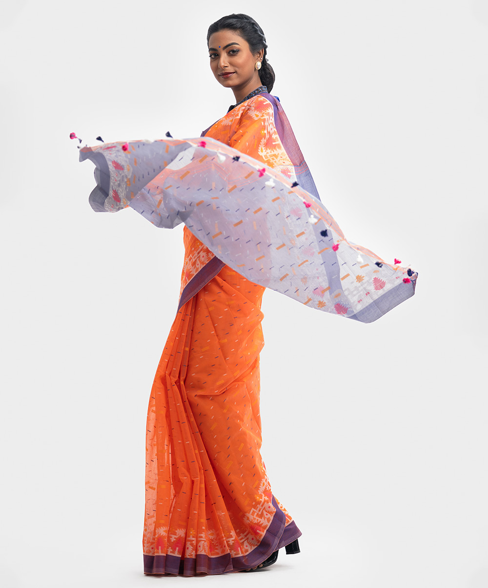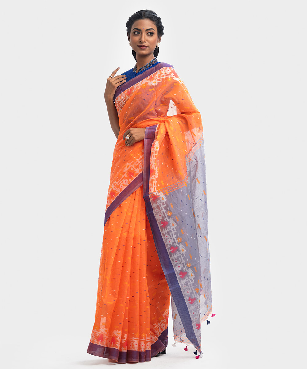 All-over weaving details saree in half-silk fabric. Tassels at the border of Aanchal.