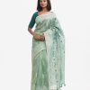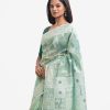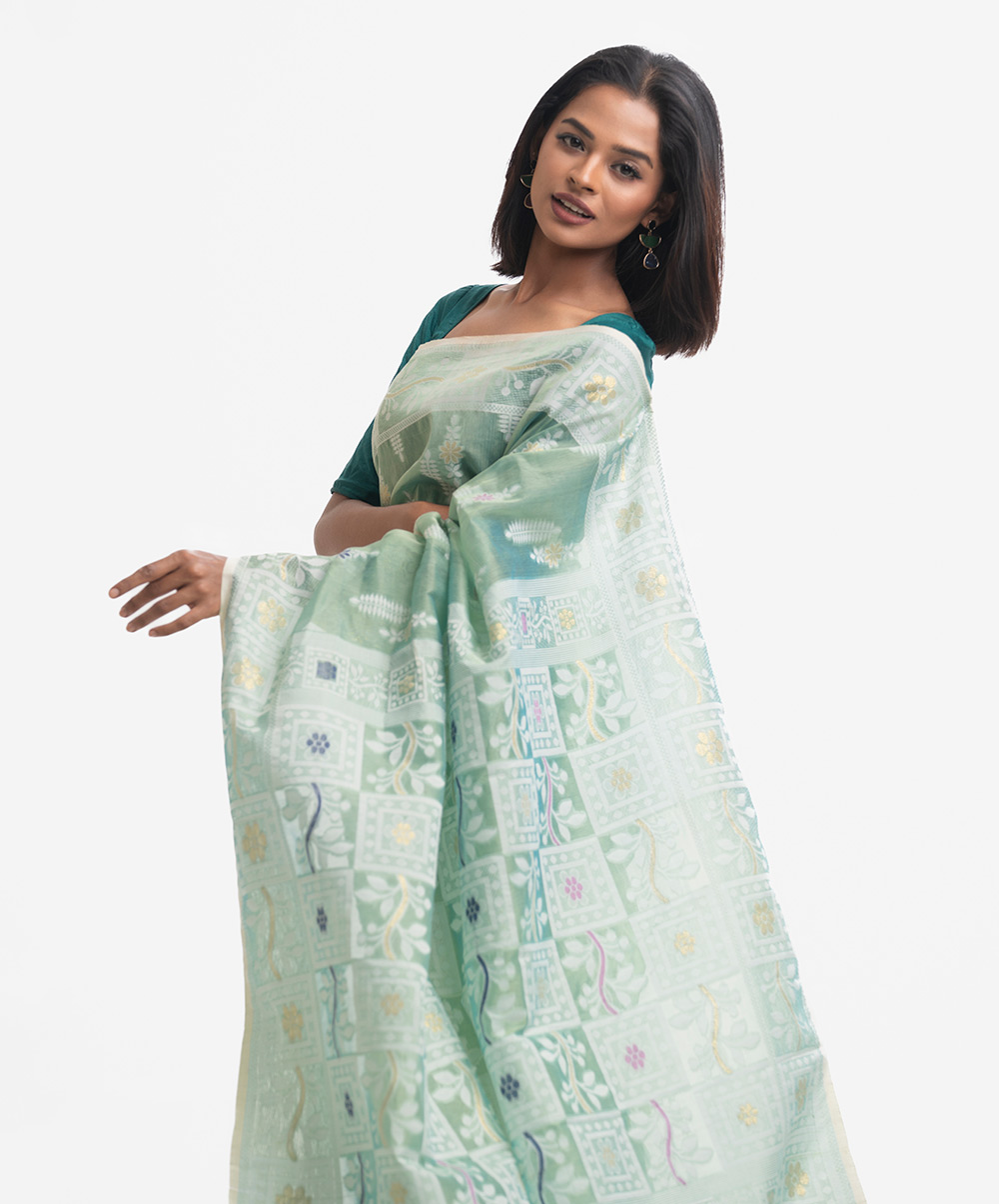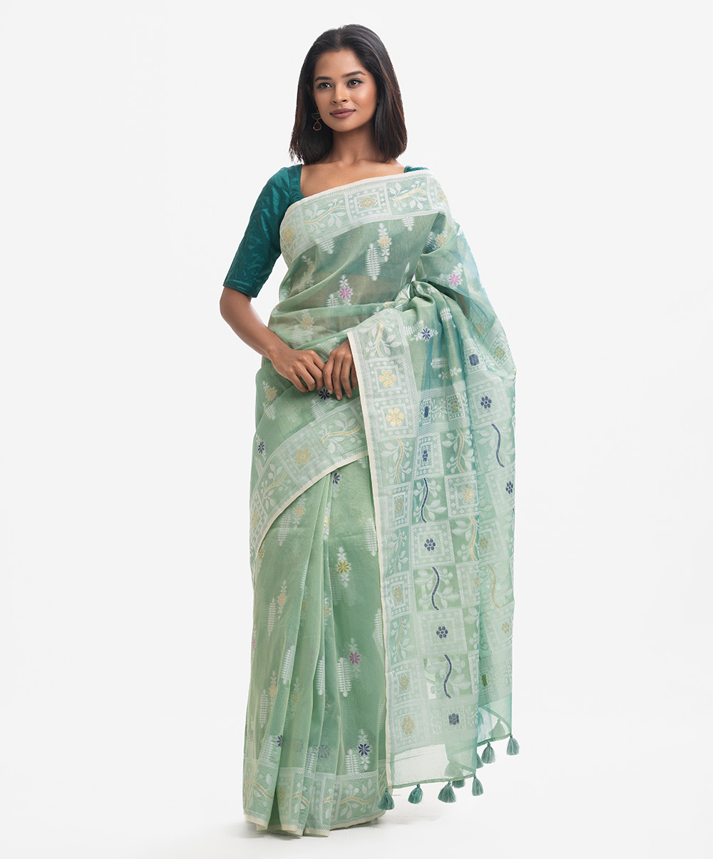 All-over weaving details saree in half-silk fabric. Golden thread detail & tassels at the Aanchal.