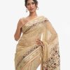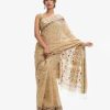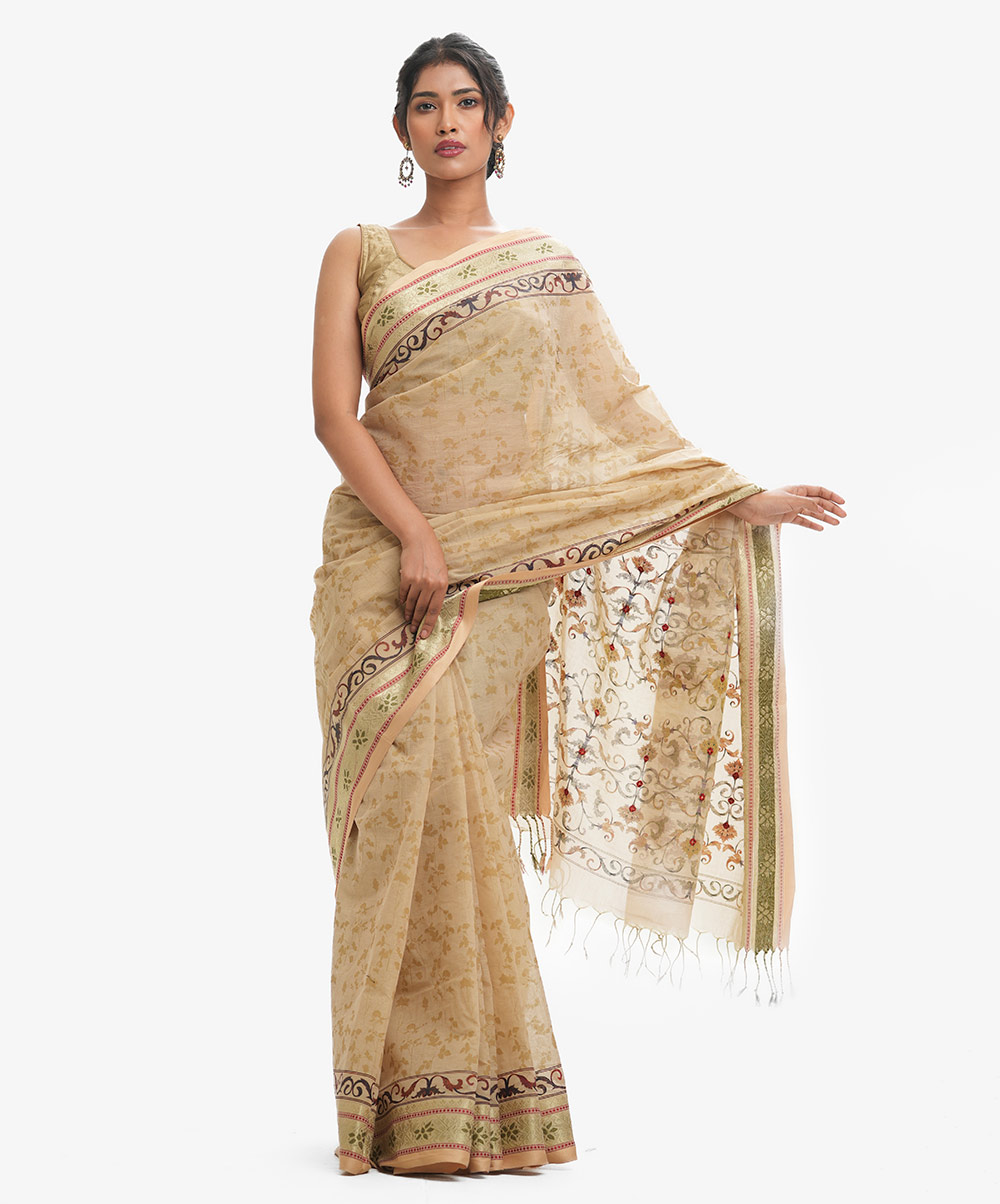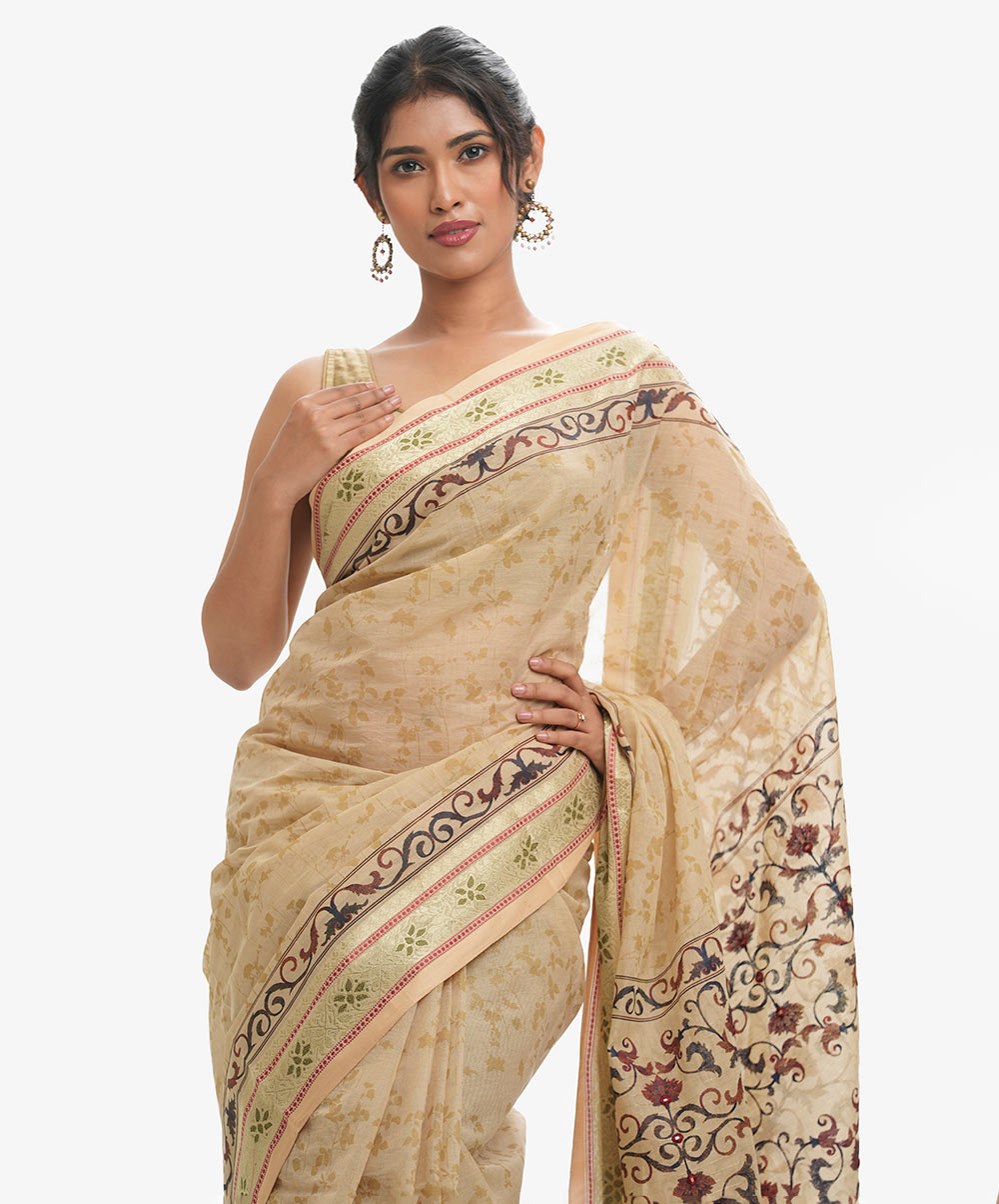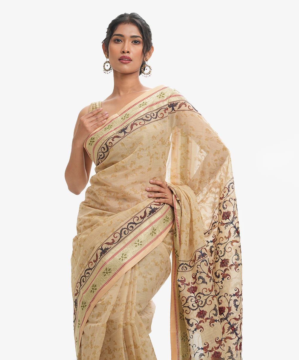 All-over printed details saree in cotton fabric. Karchupi and fringe trim at the Aanchal.