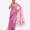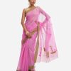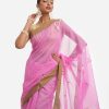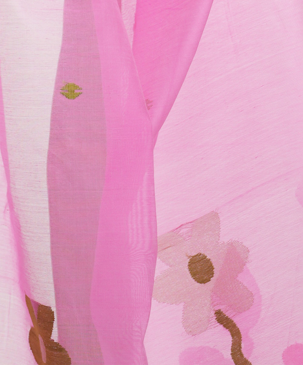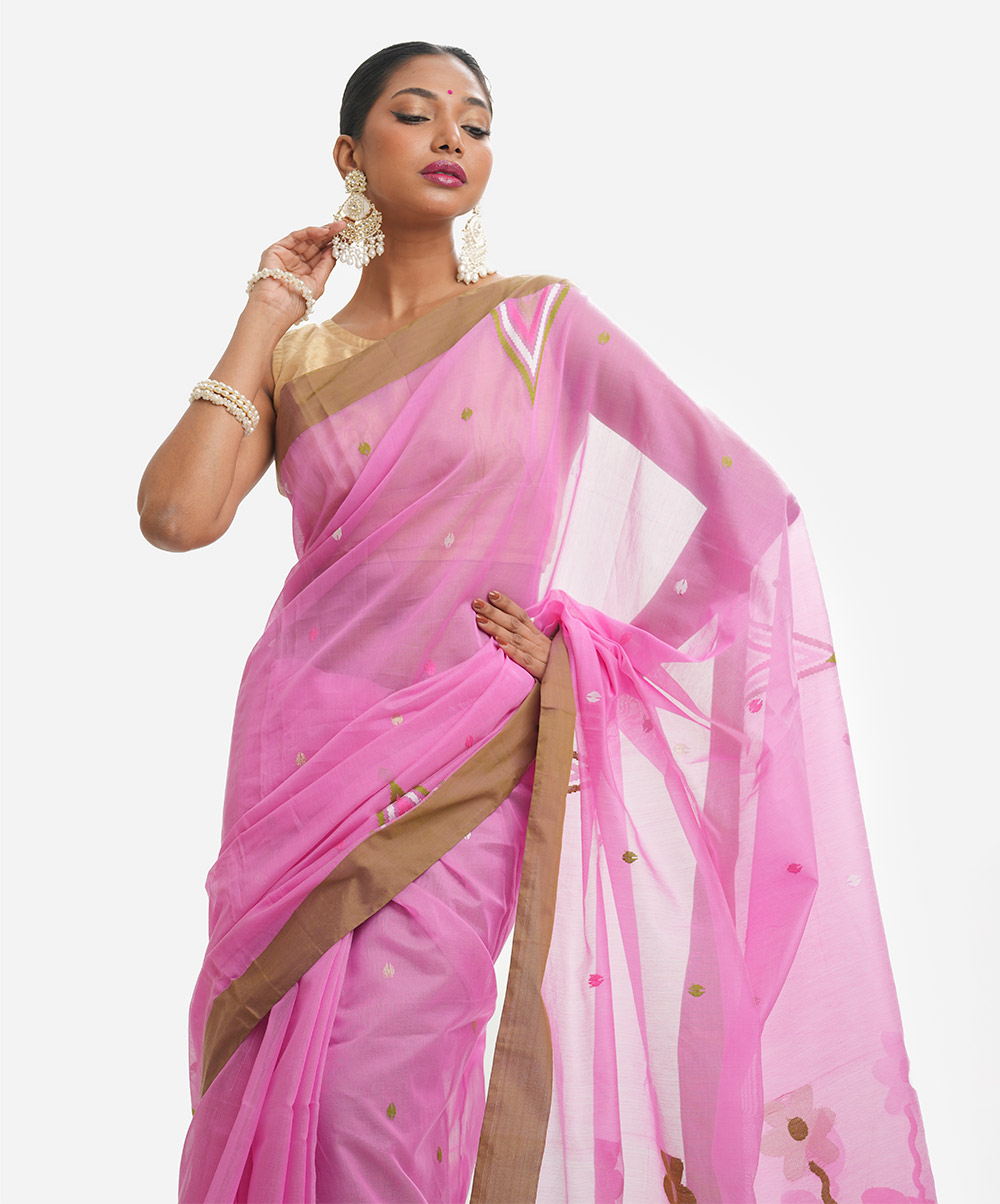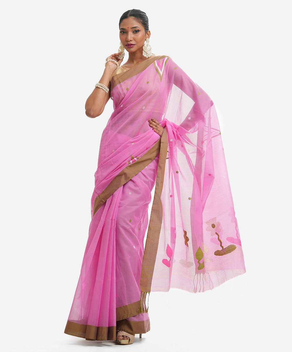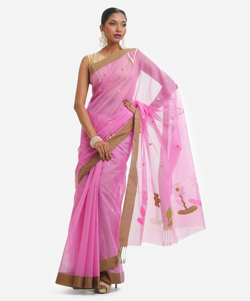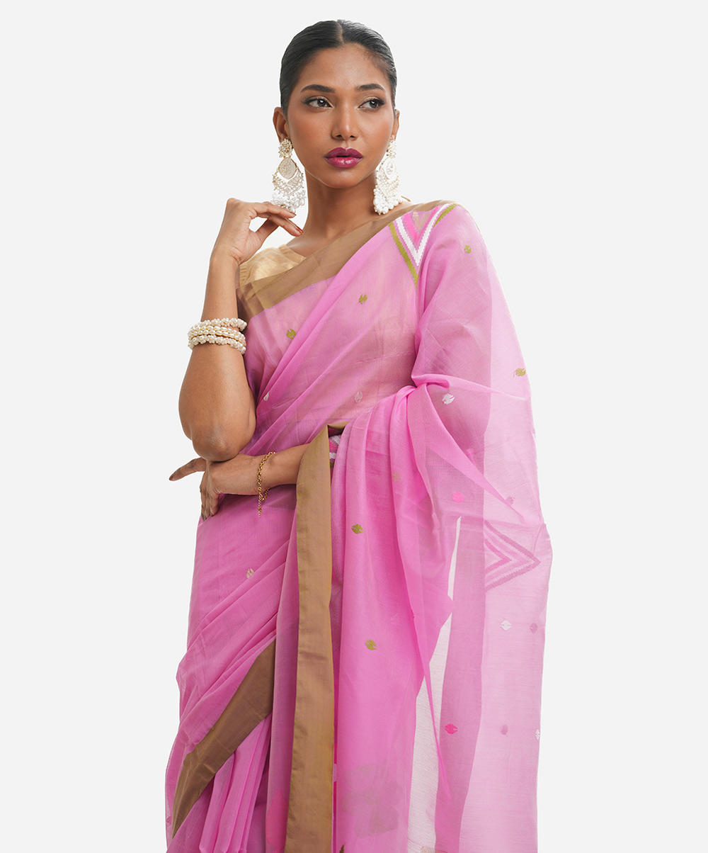 All-over weaving details saree in half-silk fabric. Golden thread detail & tassels at the Aanchal.