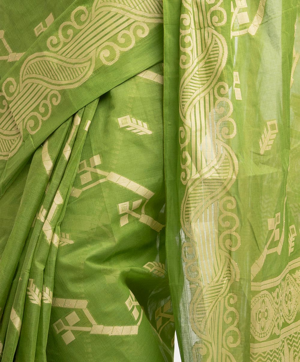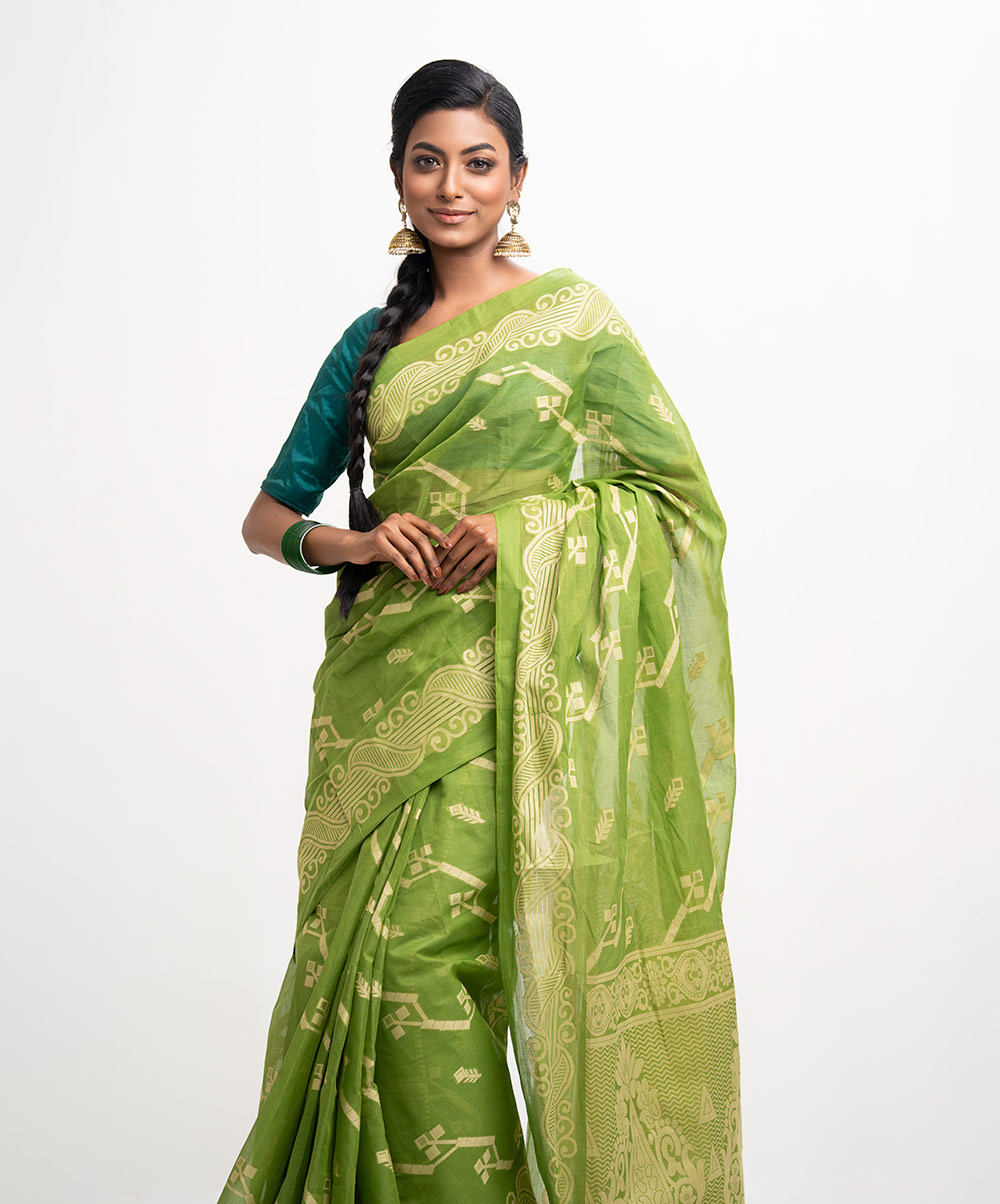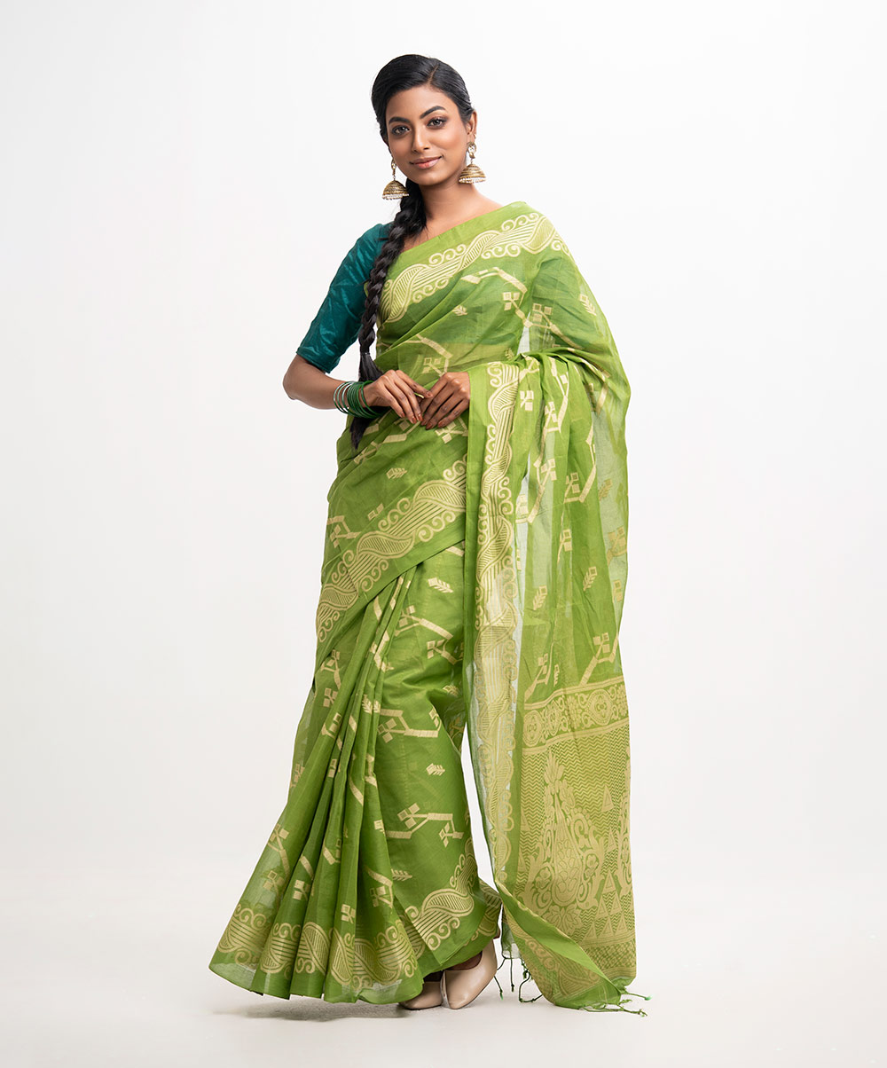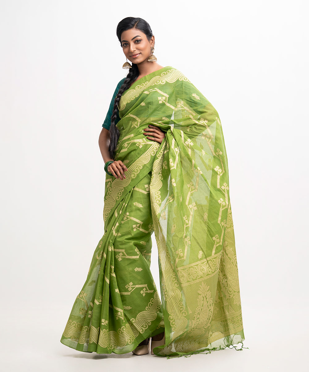 All-over weaving details saree in cotton fabric. Fringe trim at the Aanchal.