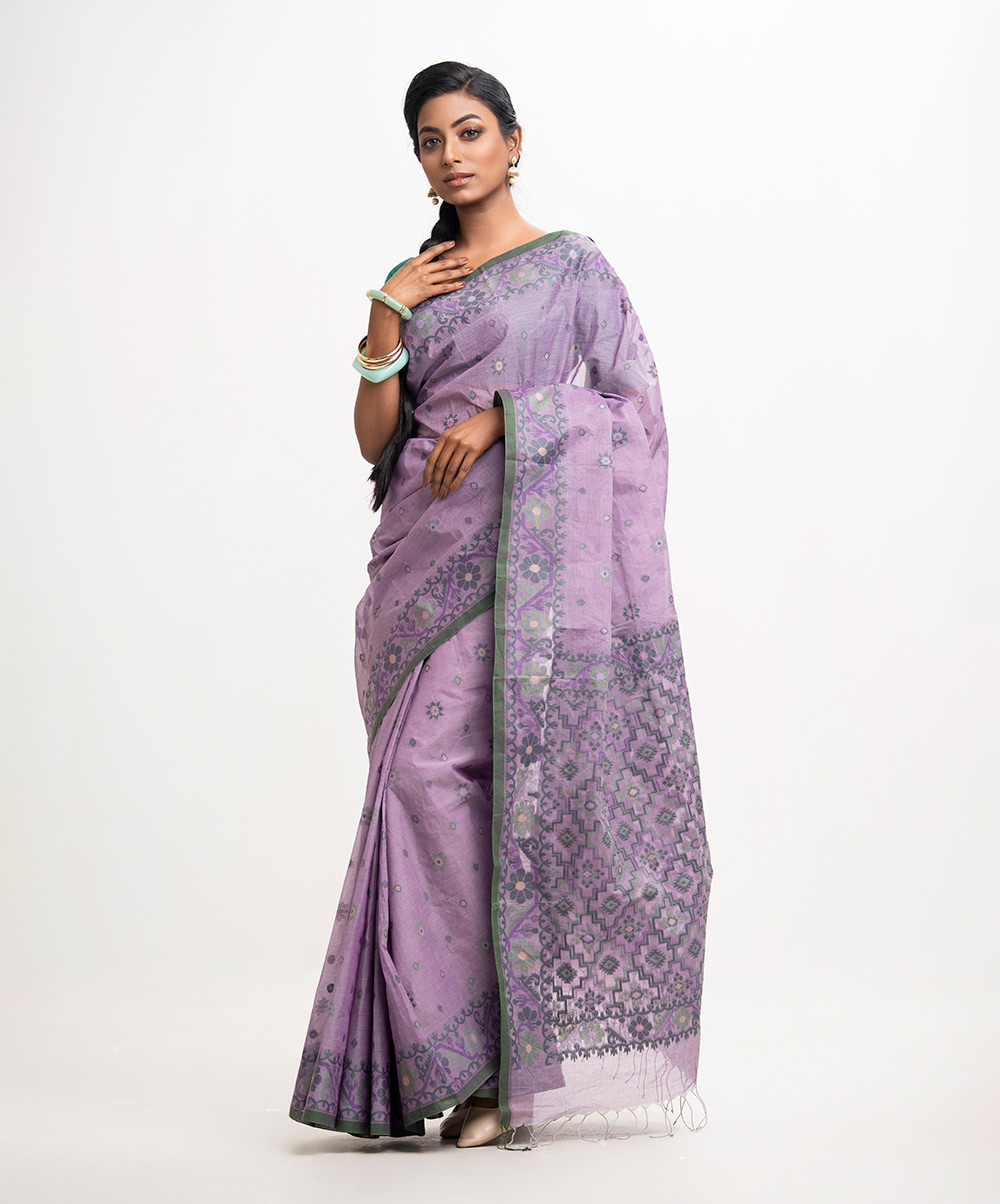 All-over jamdani pattern weaving details saree in cotton fabric. Fringe trim at the Aanchal.