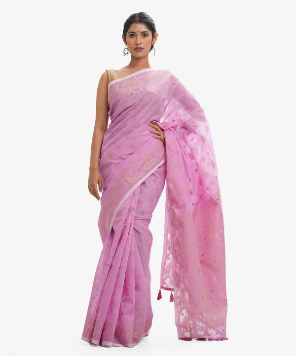 All-over jamdani pattern weaving details saree in half-silk fabric. Tassels at the Aanchal.